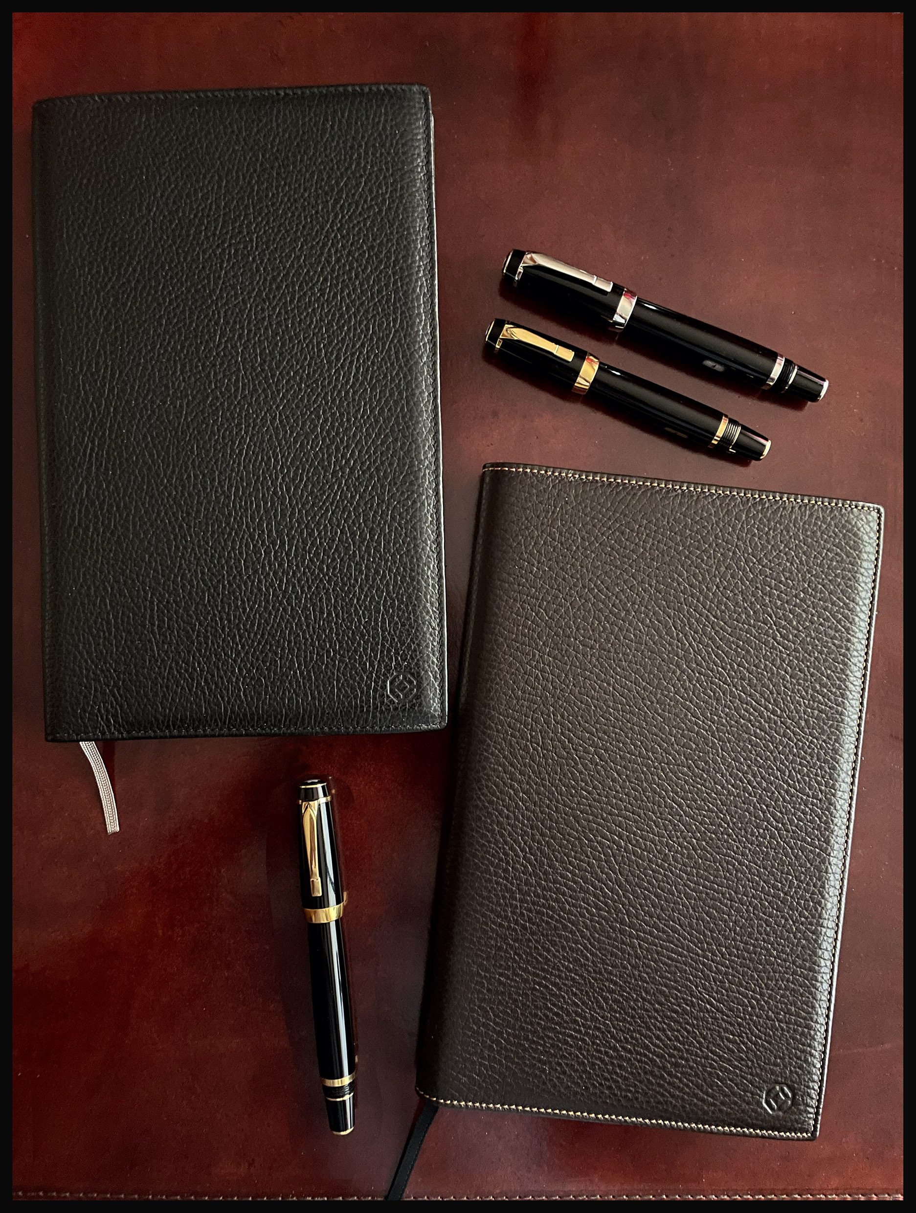 La misura mi é perfetta per i miei quaderni preferiti, che sono i Moleskine Large con copertina morbida, sui quali la cover di Montegrappa, morbida, calza come un guanto. Ne acquistai anche una completamente nera, nello stesso pellame martellato, e mi pentii per non aver comprato anche le altre due versioni che produceva Montegrappa, una in un bellissimo blu chiaro con interni grigi e l'altra nera con impunture e interni rossi.
