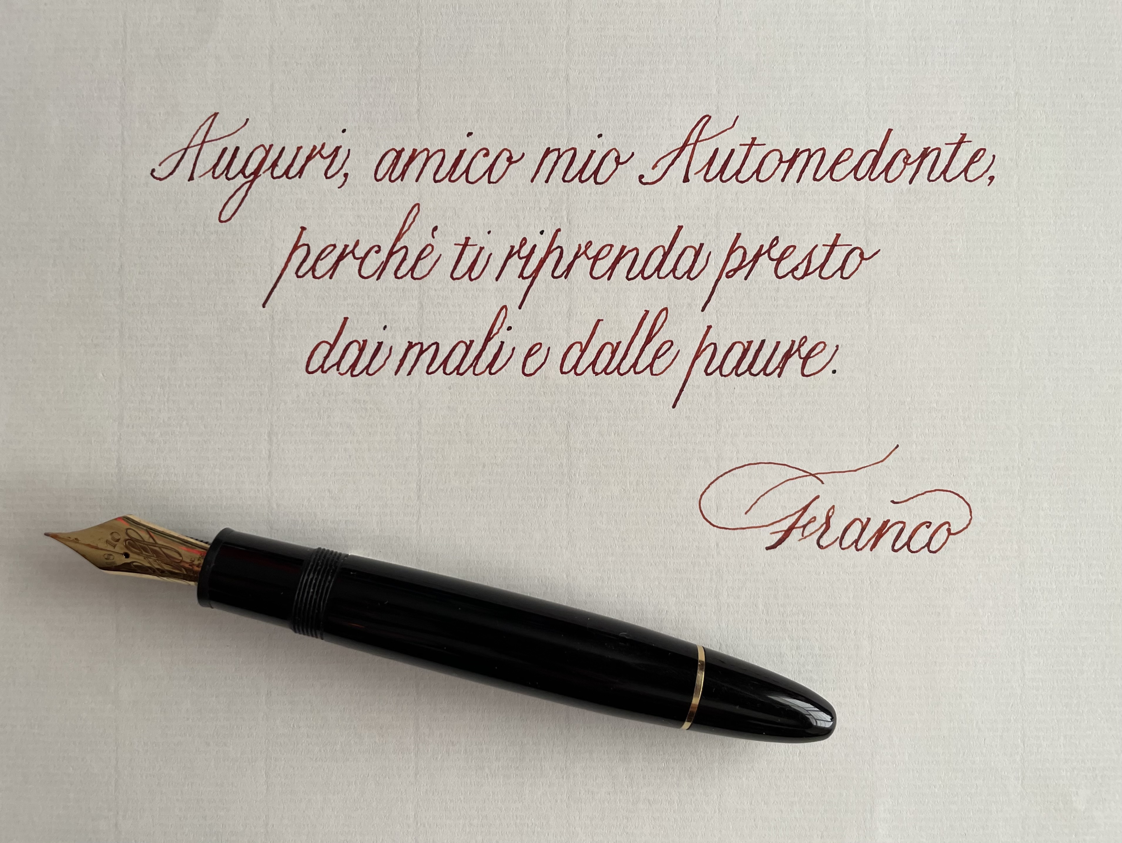 Ieri quando finalmente mi hanno dimesso l’ho trovata a casa che mi aspettava ed è stato un piacere caricarla d’inchiostro e scrivere qualche cosa con la nuova penna mi ha molto aiutato per il morale![]()