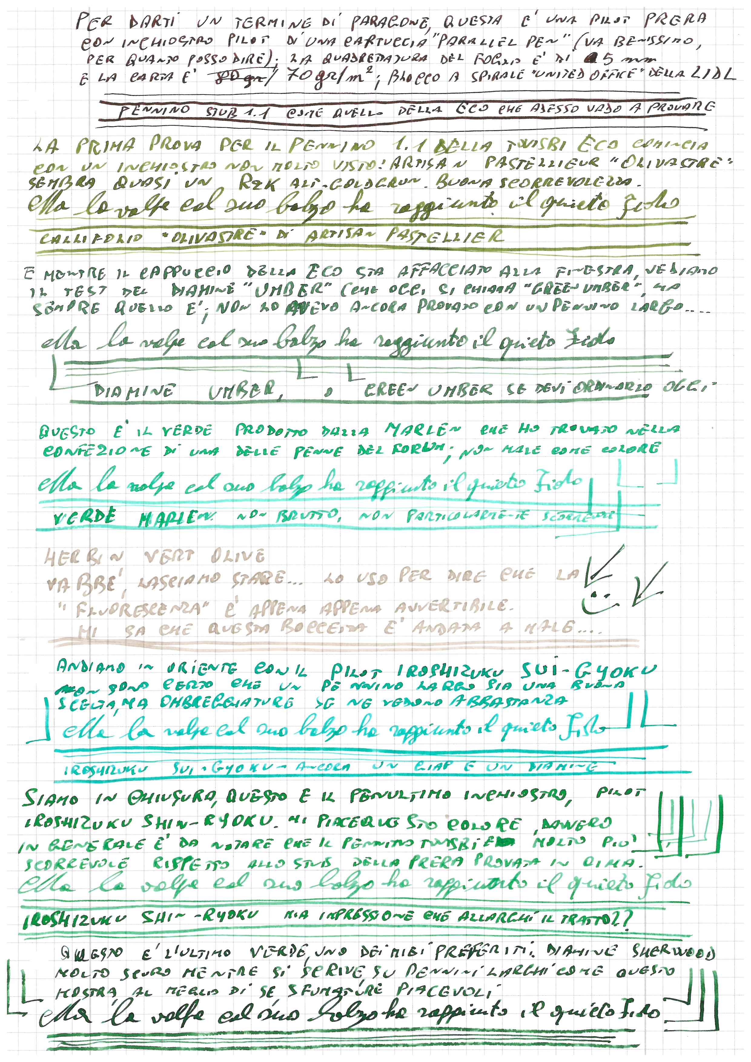 Sinceramente preferisco il leggero feedback che fornisce il pennino della Pilot Prera usata per riscontro (proprio in cima al foglio test); non ho potuto provarla con i verdi della prova perchè aveva la sua cartuccia, e ripulirla per poi provare..... troppo macello; ma verrà il momento.