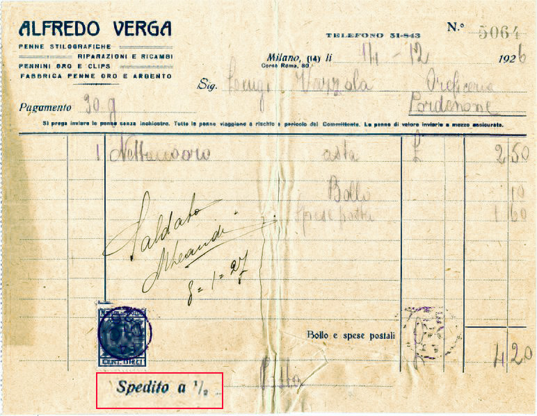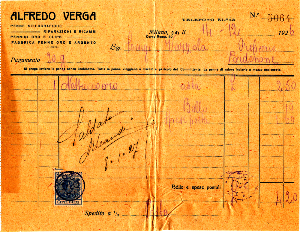 Interessante documento "Alfredo Verga", che all'epoca (1926) voleva ancora dire Columbus (la divisione fra i due fratelli avvenne nel 1927), ad occhio è una ricevuta di una riparazione, ma non riesco a decifrare lo scritto (sembrerebbe "Nettu?o oro asta") ma il ? sarà una n e farà davvero riferimento alla ditta bolognese, o leggo male io le altre lettere? Si accettano suggerimenti:
