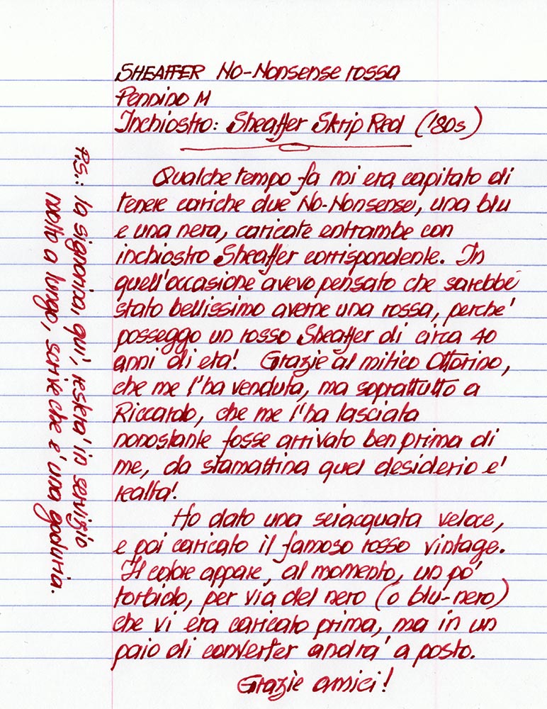 Grazie a Ottorino (amico venditore), e soprattutto a Riccardo che mi ha dato precedenza nonostante la avesse lui, sono riuscito a entrare in possesso di una tanto desiderata Sheaffer No-Nonsense rossa, che non riuscivo a trovare. L'ho caricata con un inchiostro Sheaffer Skrip Red risalente agli anni 80, ancora perfettamente utilizzabile, privo di muffe e depositi. La penna è fantastica, come mi è stato detto "una Ferrari carrozzata Fiat 500". Tutto vero: scrive in un modo tale da innamorarsene. Il pennino "canta", restituisce quella sensazione di leggero fruscio piacevolissimo; flusso impeccabile, come ci si aspetta da questo modello, giusto, tendente all'abbondante. Primo test, un foglio (2 pagine) di Rhodia A4 a quadretti scritto fittissimo, senza righe lasciate libere, senza interruzioni temporali: la penna non ha fatto una piega, si è fermata solo quando ho rimesso il cappuccio.