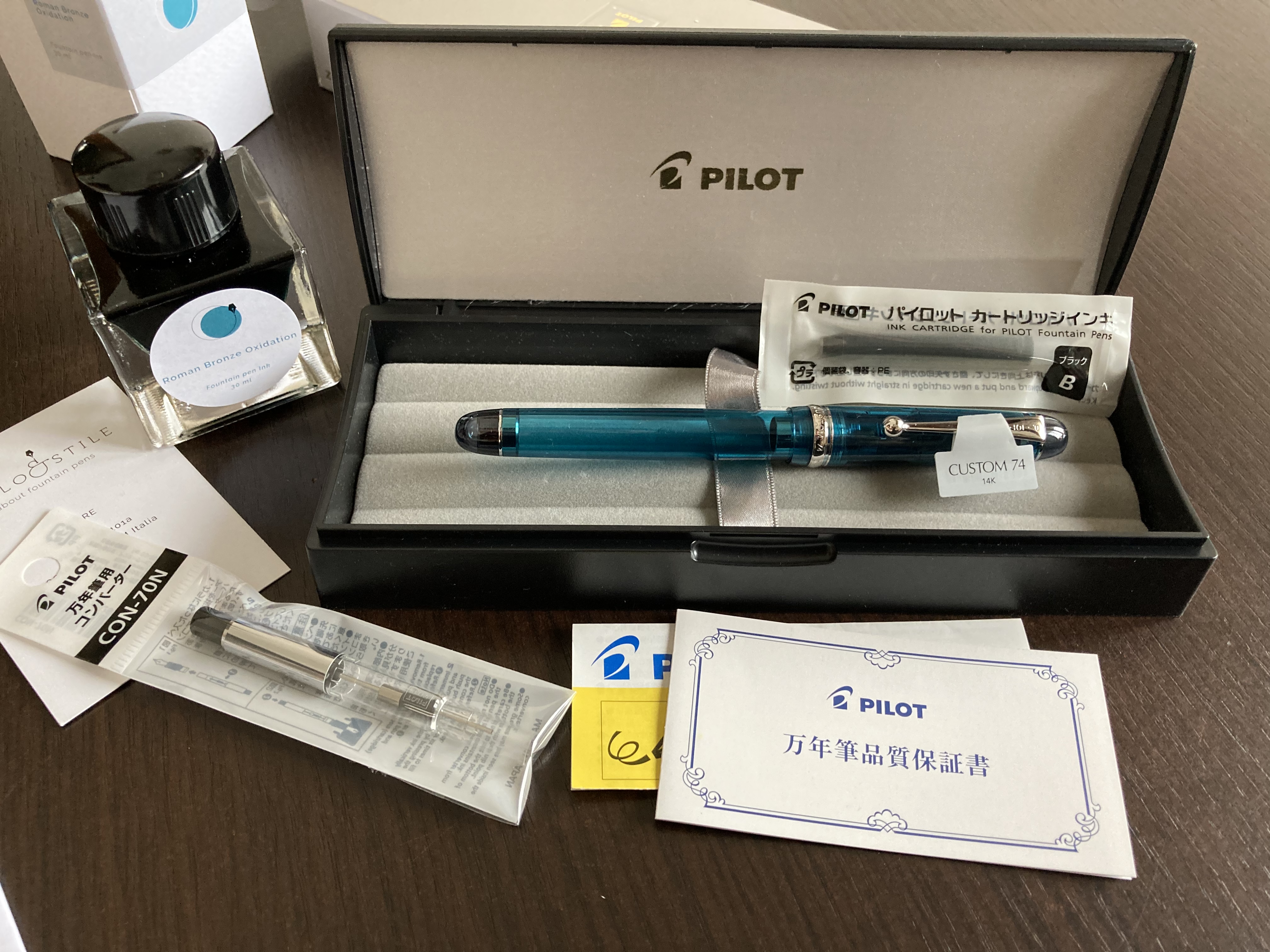 Bella la Pilot Custom 74, è una sicurezza! Purtroppo Pilot stranamente non è in grado di produrre converter decenti, presta attenzione a non far picchiare il pennino sul fondo del calamaio quando premi il pulsante del CON 70. Piuttosto riempilo con una siringa.