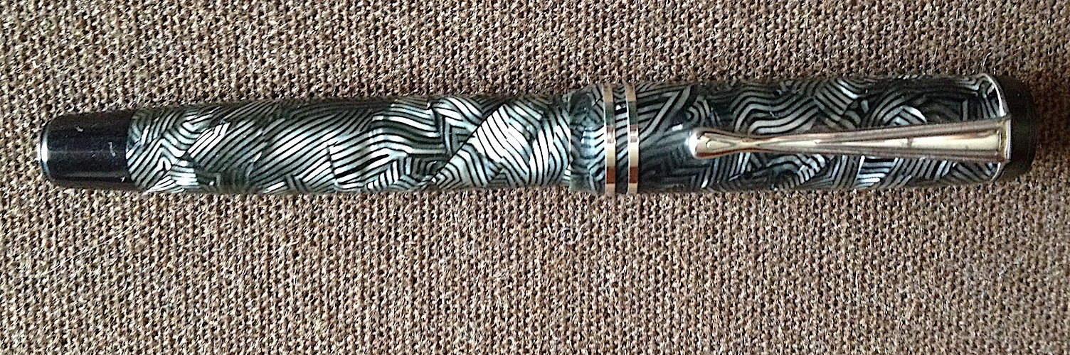 Questo invece è un recente acquisto, ancora in fase di restauro. Proveniente dal banchetto di un mercatino, è il classico esempio di oggetto che spunta in mezzo alla massa: quelle striature ammalianti non potevano giacere in mucchio di rottami. E così questa Astura, prodotta dalla torinese SAFIS poco prima del secondo conflitto mondiale stando al numero del brevetto, è tornata a luccicare. Il Micro-mesh è stato eccellente sulle verette, paiono nuove. La clip invece presenta ancora qualche traccia di ossidazione. Lunga 11,5 cm, ha il fusto del diametro di 11mm. Di suo presentava un pennino Condor extra n°4 (della Pagliero ?) piegato a 90° in punta. Ho cercato di fare del mio meglio, alla prova scrittura (intinto) mi pare si sia comportato bene, che dite ? Lascerà il posto ad un Astura Nova iridium n°4 placcato.