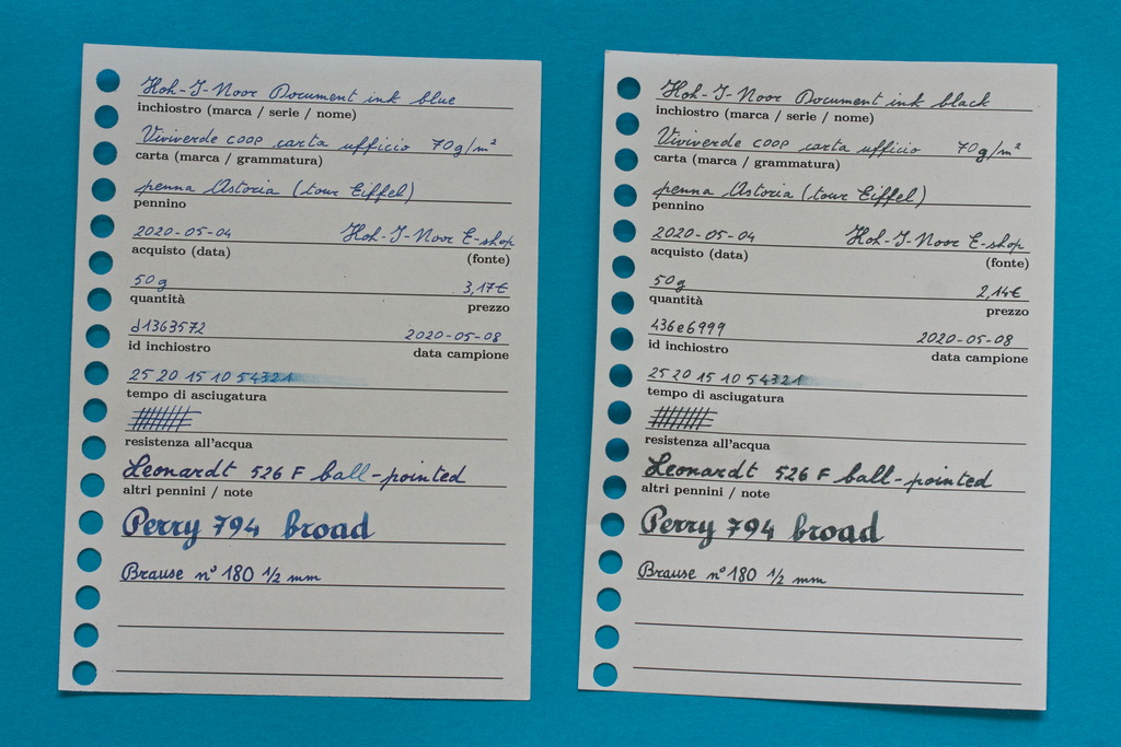 arrivato (con corriere) e dalle prime prove su carta qualunque devo dire che i due blu sono soddisfacenti, ma non consiglierei il nero document come nero perfetto: è un po' poco nero, quasi un blu-nero. Stanotte lascerò le gocce d'acqua sul foglio per il test di resistenza e poi posso postare delle foto.
