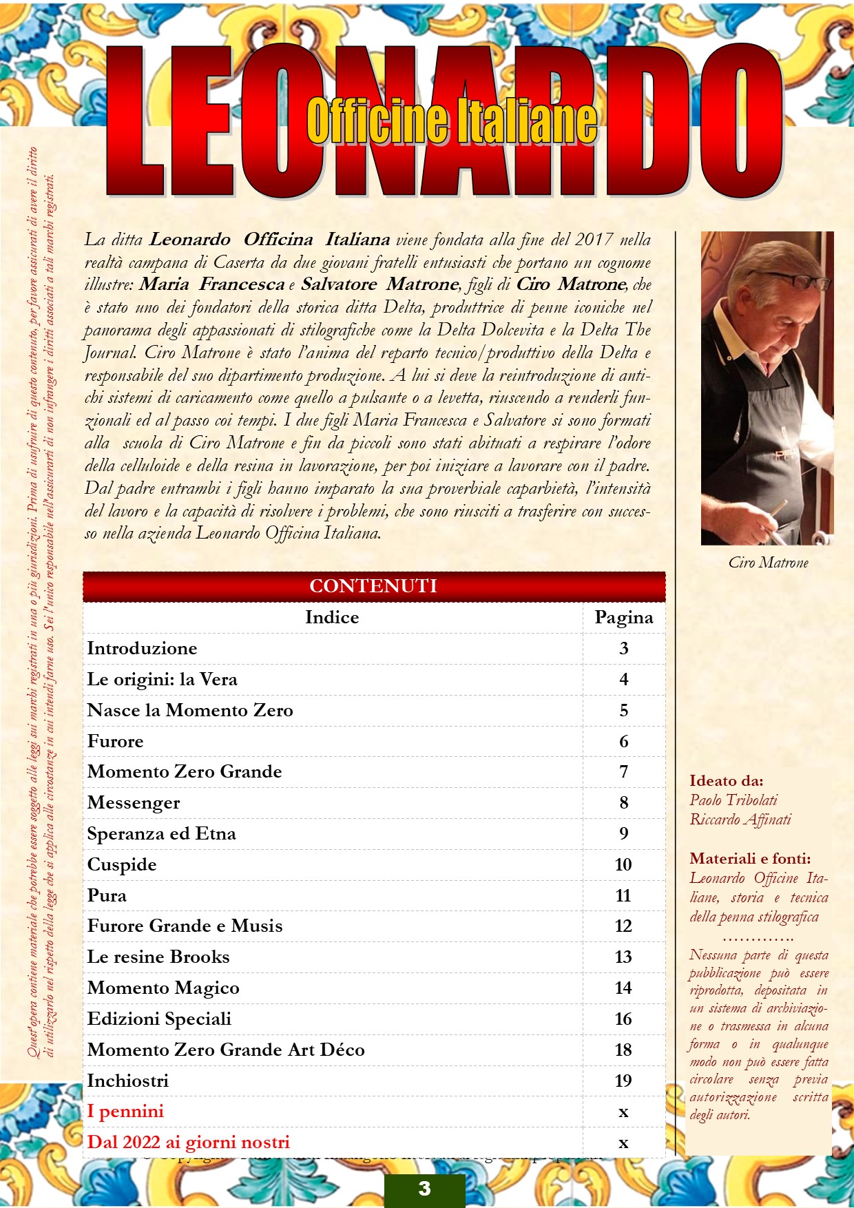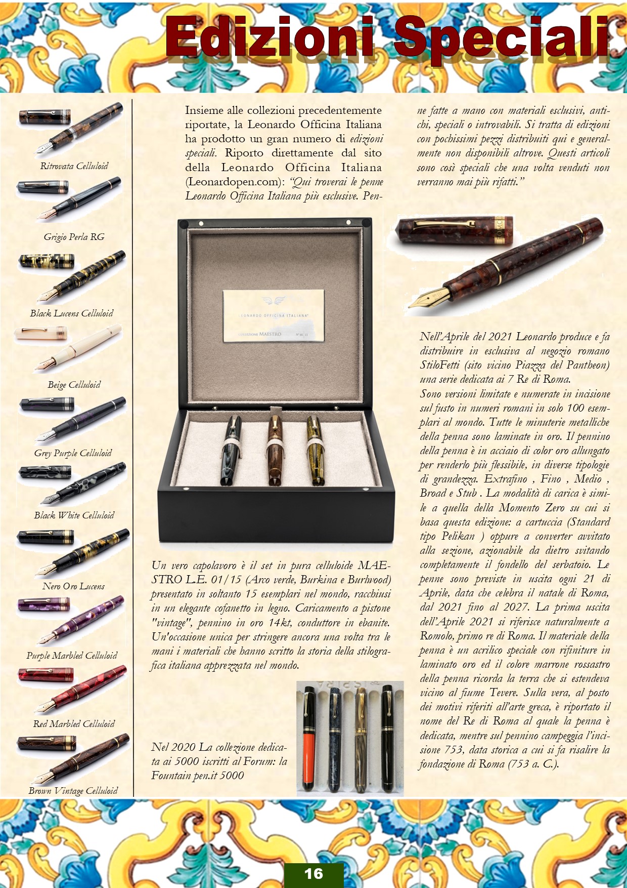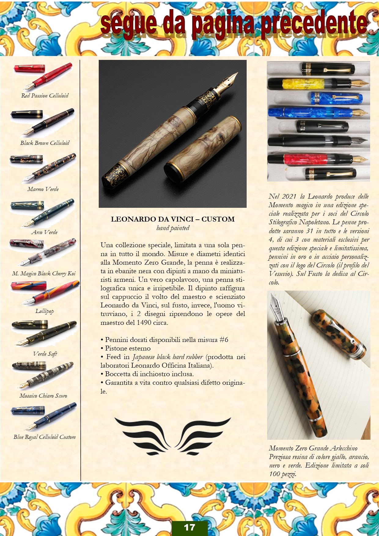 Prosegue l'impaginazione della piccola guida di riferimento sulla LEONARDO OFFICINA ITALIANA, con l'aiuto di Paolo Tribolati e sotto il controllo bonario e amichevole di Salvatore Matrone, che ci potrà indicare quanto manca e quanto inesatto. Spero quanto prima di riuscire a chiudere il lavoro a 24 pagine a colori (in formato PDF), in maniera di averle disponibili per le festività natalizie (dopo attenta revisione), come pensiero per tutti gli amici del CIRCOLO STILOGRAFICO ROMANO.