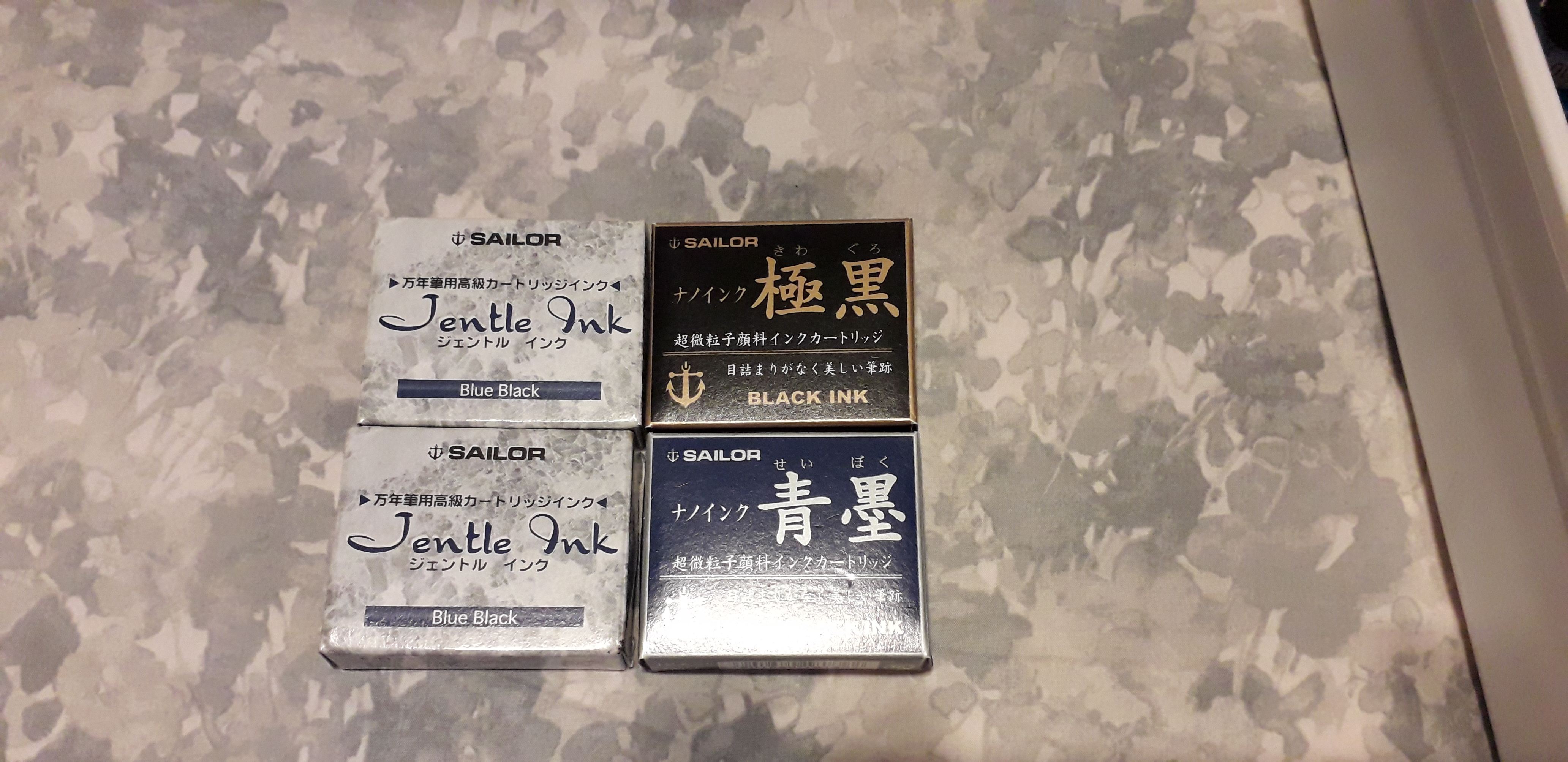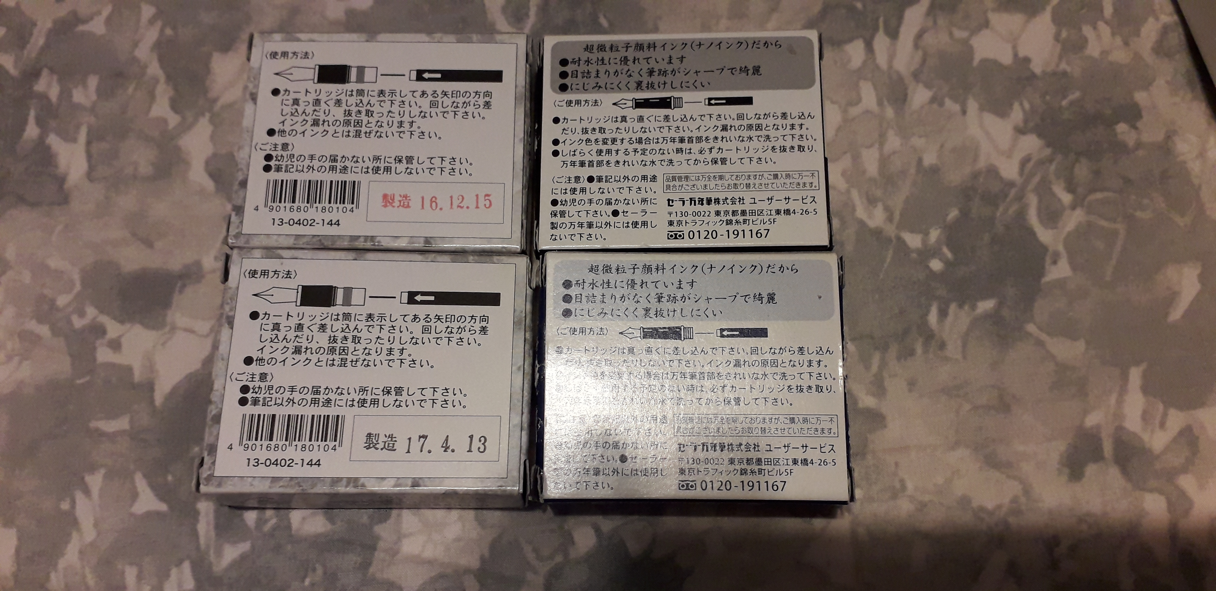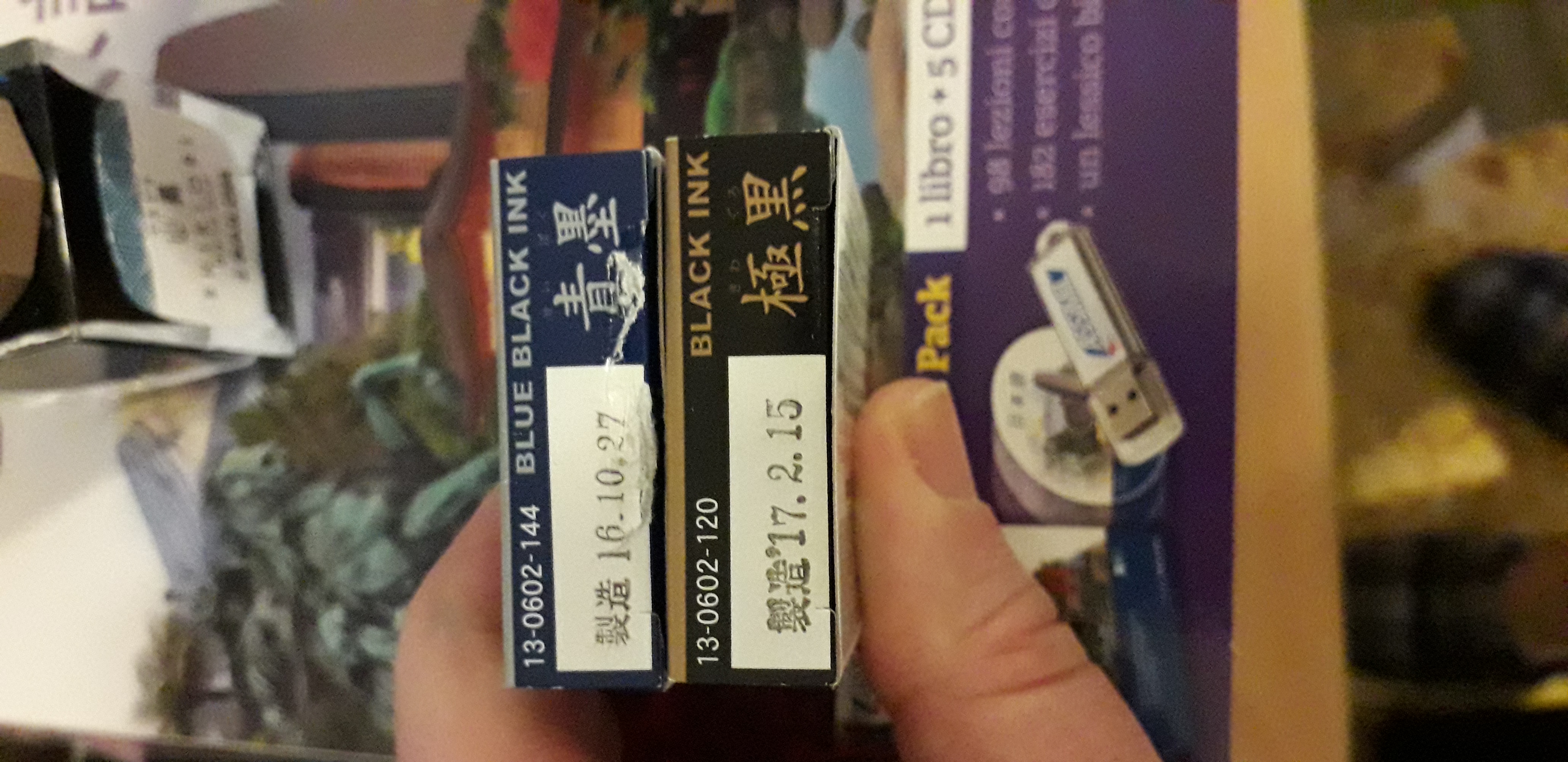Anche io ho delle cartucce Saylor di 3 tipi una Jemtle ink, laltra e la serie indelebile xhe non ha la scadenza sul retro ma sul lato corto e una boccetta di shikiori.