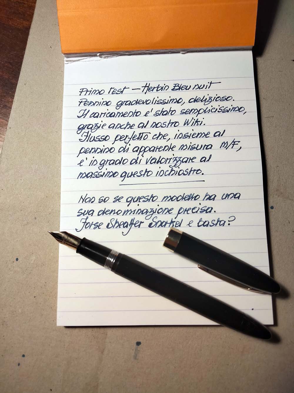 Come di consueto, ho eseguito quello che io chiamo "test scrittura veloce su pagina A4". Mi serve per capire se il flusso della penna tende a smagrire quando la velocità di scrittura può essere in grado di mandare in affanno l'alimentatore. In questo caso il comportamento della piccola Sheaffer è stato esemplare: nessuna indecisione, flusso sempre più che adeguato ed estremamente costante (basta vedere l'aspetto della pagina), scrittura ben bagnata ma con equilibrio, nonostante il pennino sia un po' molleggiato e nello scrivere velocemente possa capitare talvolta di premere, richiedendo più inchiostro. Davvero una penna eccezionale.