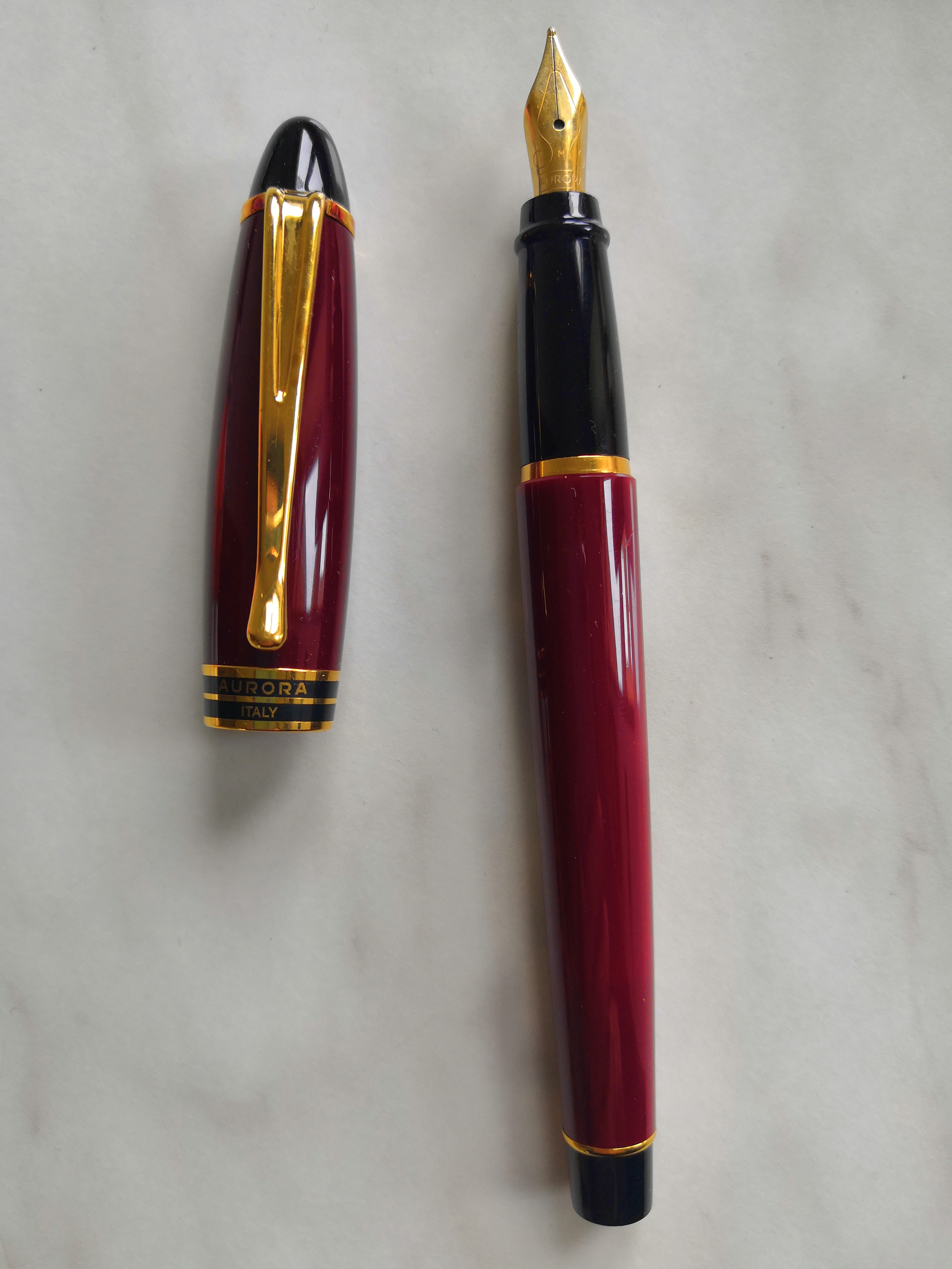 La prima è la classica Aurora Auretta anni 80. È leggerissima, più di una Preppy per capirci, spero che duri, perché ci si scrive bene ma sembra di non averla. Scorrevole, con un tratto fine, ma non giapponese, senza variazioni se si esercita una pressione. L’ho caricata con una cartuccia Parker, a cui ho allargato leggermente il foro con l’avvitatore e spuntato becco e coda con un taglierino. L’incastro è perfetto, non forza, ma non si muove di un mm.