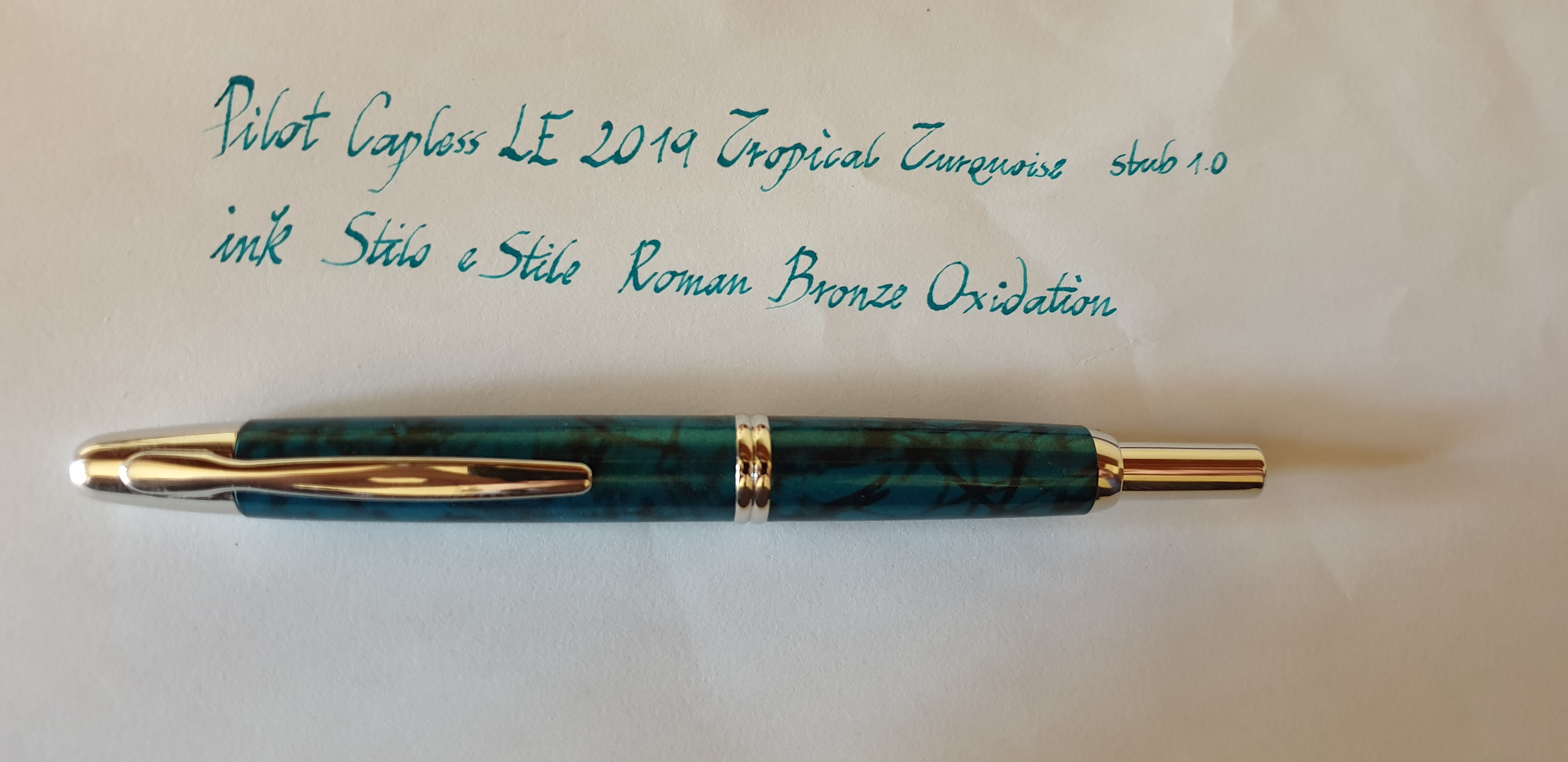 Avendola ritirata in negozio non ho potuto fare a meno di abbinare un inchiostro e devo dire che la scelta non è stata affatto difficile. Appena ho visto questo Stilo e Stile Roman Bronze Oxidation mi si sono illuminati gli occhi. È quello giusto da abbinare a questa penna.
