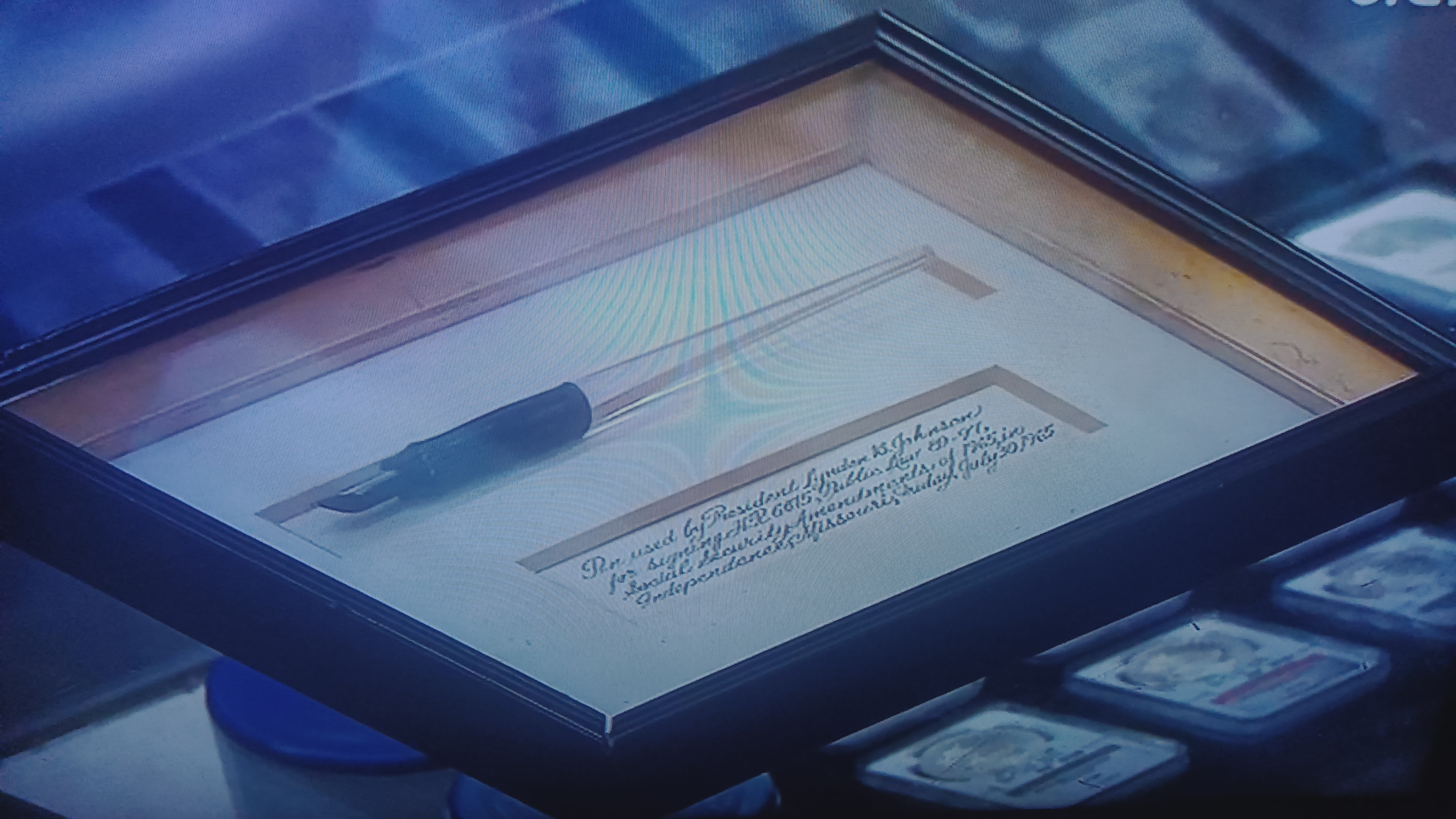 Nella puntata di "Affari di famiglia" in onda in questo momento su Cielo, una persona ha provato a vendere una penna usata dal presidente Lyndon Johnson per firmare una legge. Ho fatto una foto, scusate la scarsa qualità.
