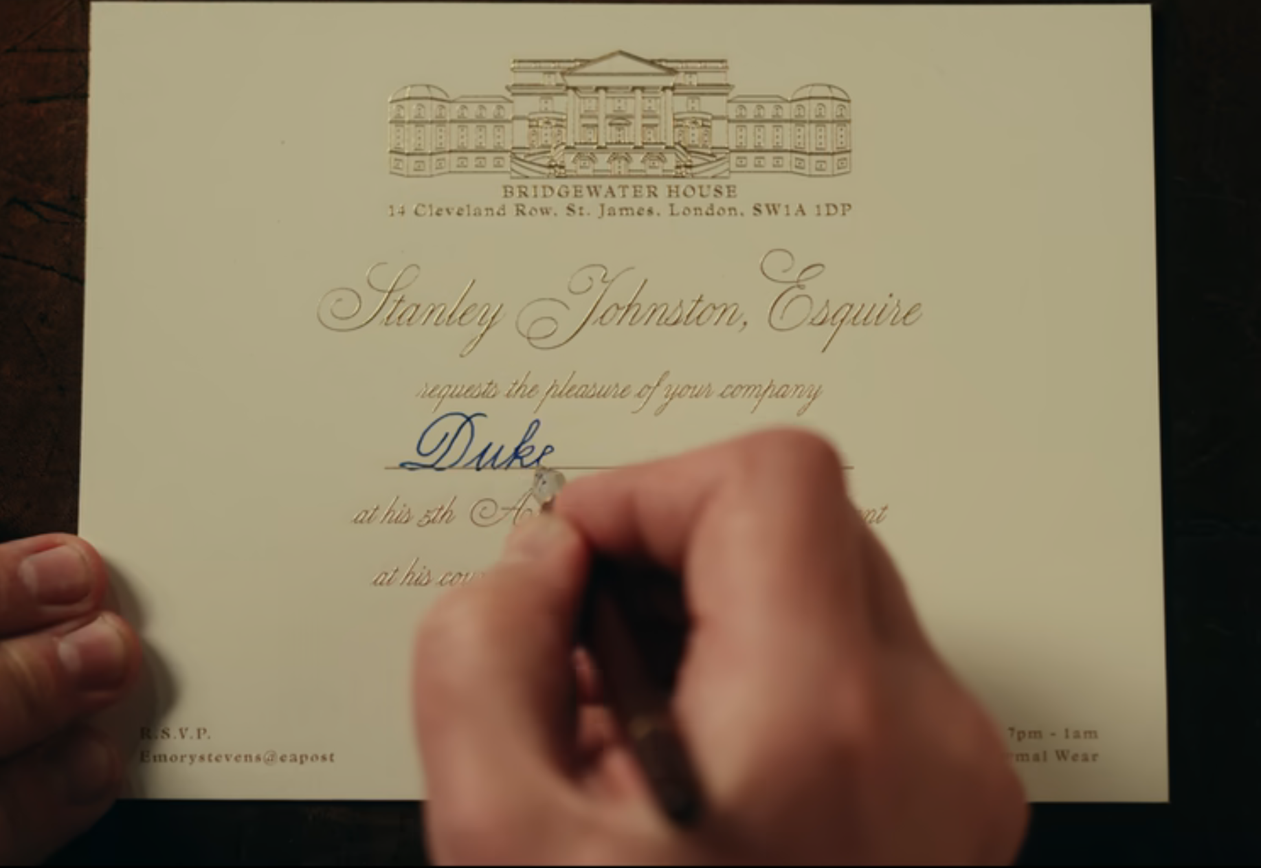 The Gentlemen, episodio 2 (su Netflix), minuto 19 circa: Stanley Johnston manda un invito al Duca di Halstead raccomandando che venga utilizzato inchostro Waterman Serenity (blu, non nero)... Lascio agli esperti del forum il tentativo di identificare la penna utilizzata. Vi consiglio vivamente la serie di Guy Ritchie, da seguire assolutamente in lingua originale: una vera chicca per gli amanti del dark humour e delle atmosfere alla Quentin Tarantino.