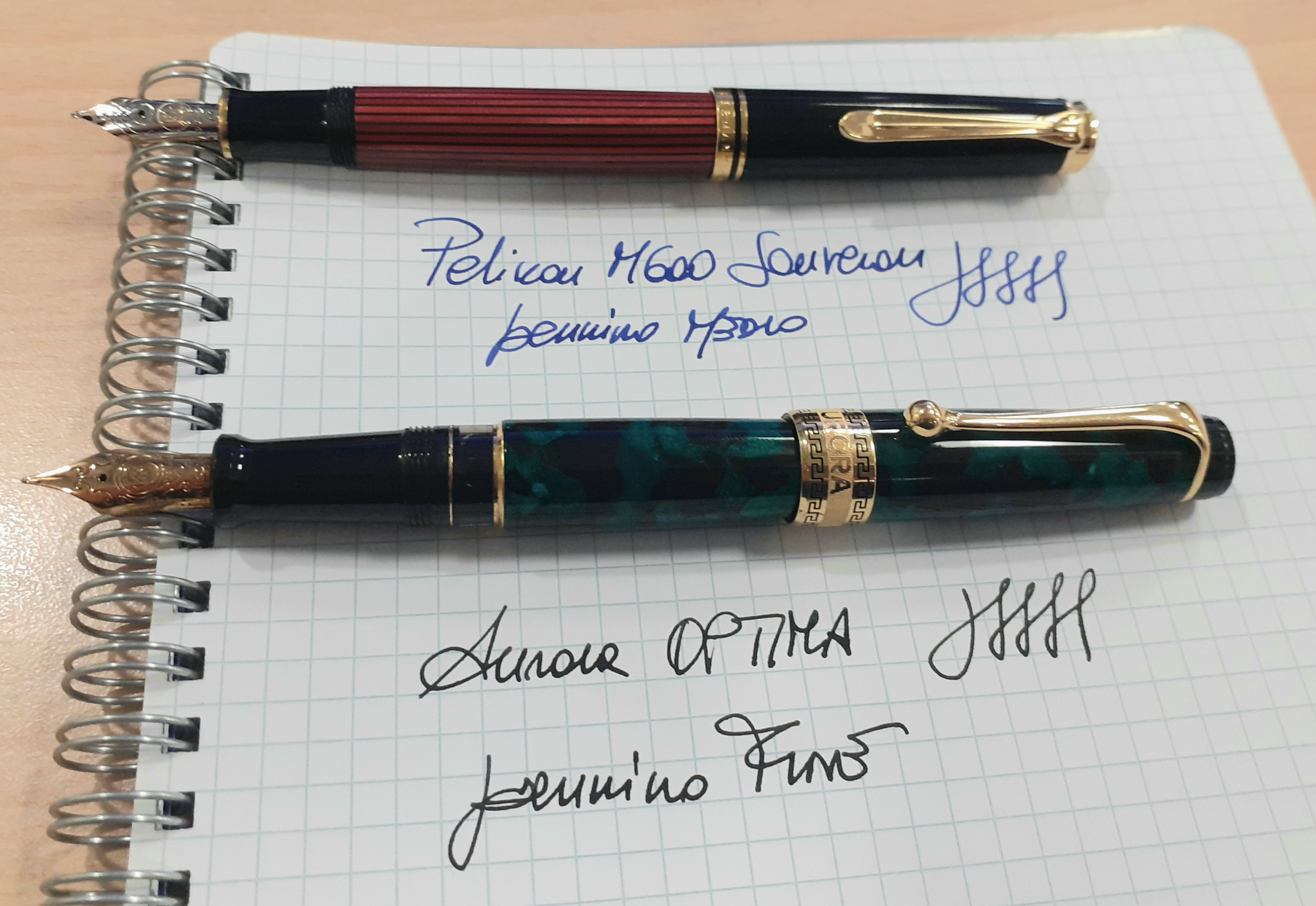 La Gallery ha un pennino 14K, gradazione M, mentre la Douè ha un pennino Fusion, gradazione F. Ho caricato le penne con un Waterman Blu Florida e fra i due non noto un'apprezzabile differenza di tratto. Quello che sorprende è la scorrevolezza del Fusion, all'altezza dei migliori pennini presenti sul mercato.
