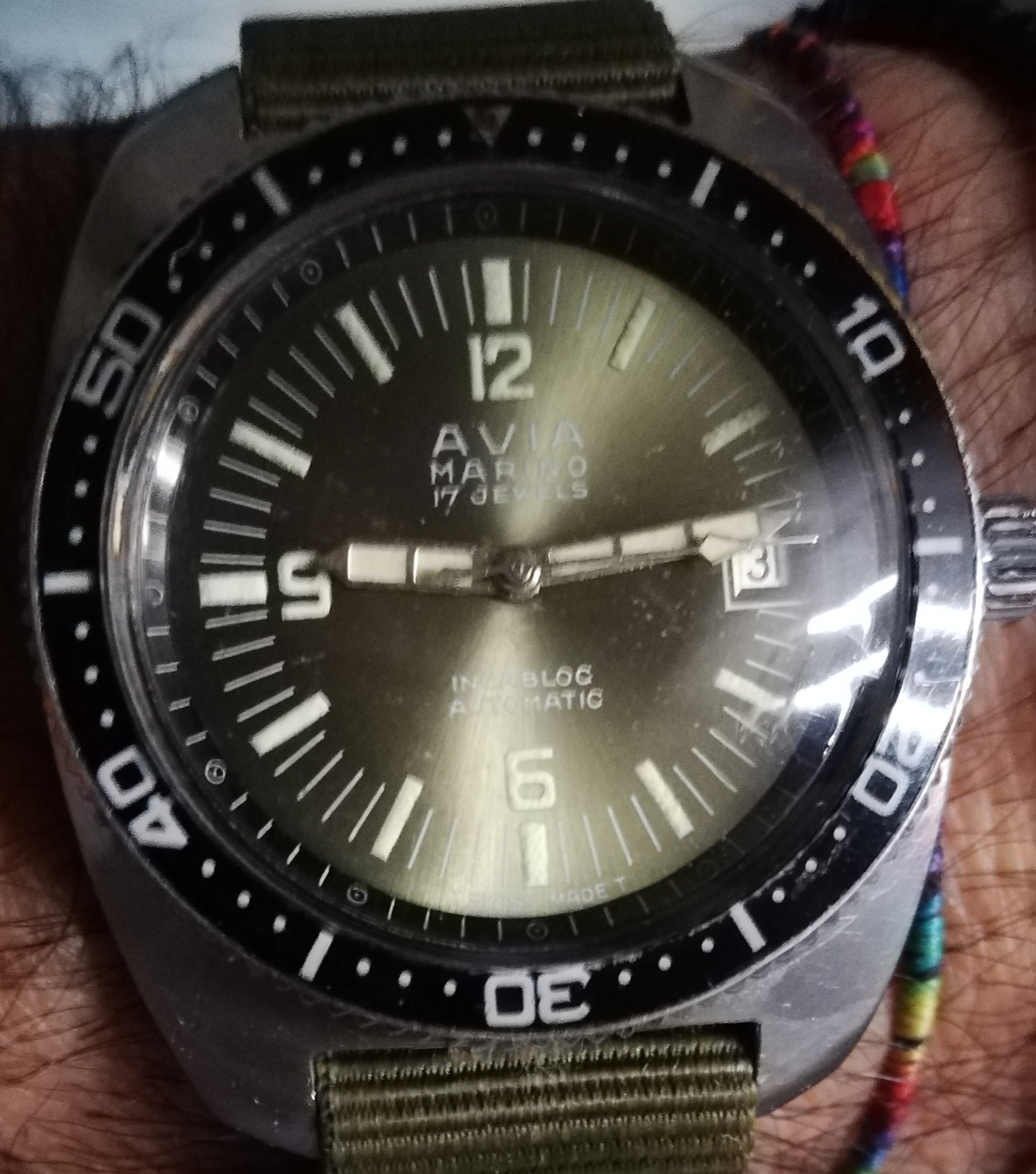 Avia Marino automatic, fondello a scatto ad alta pressione, ghiera con inserto in bakilite, bel quadrante soleil con sfere ed indici al trizio a cui ho abbinato un cinturino nato in tinta.
