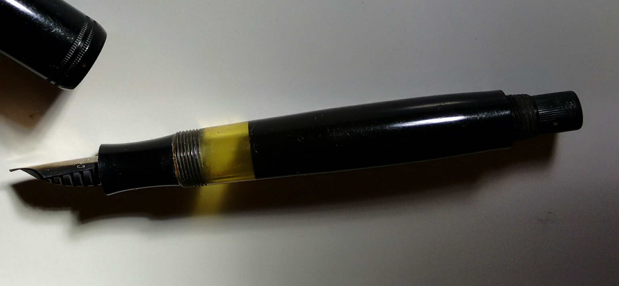 Purtroppo la foto è venuta un po' così, ma la penna è una normale penna a stantuffo. Mi sarebbe piaciuta molto una penna curiosa come la osmia vacumatic! provo a mettere una foto diurna.