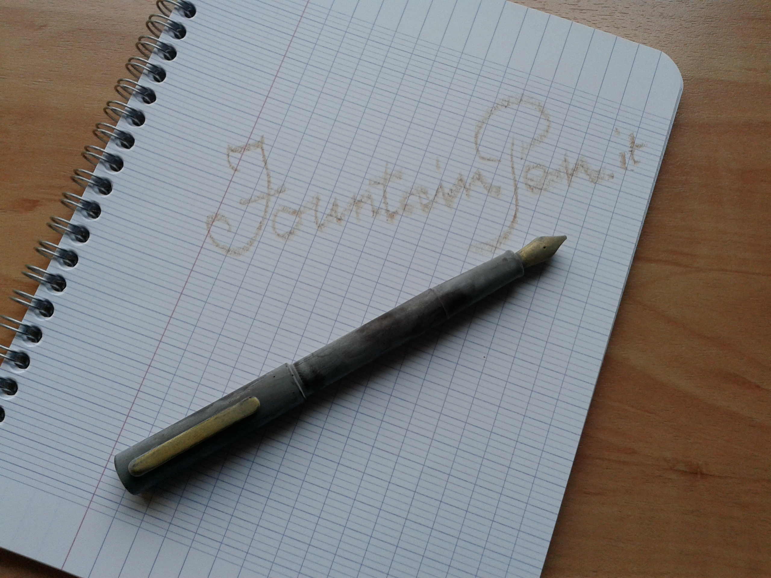 Per i santommasi che credono che sotto i 20 Euro ci sia solo la Lamy Safari, ecco una prova di scrittura su carta Clairefontaine 90 gr./m2 con inchiostro al latte (non giapponese):