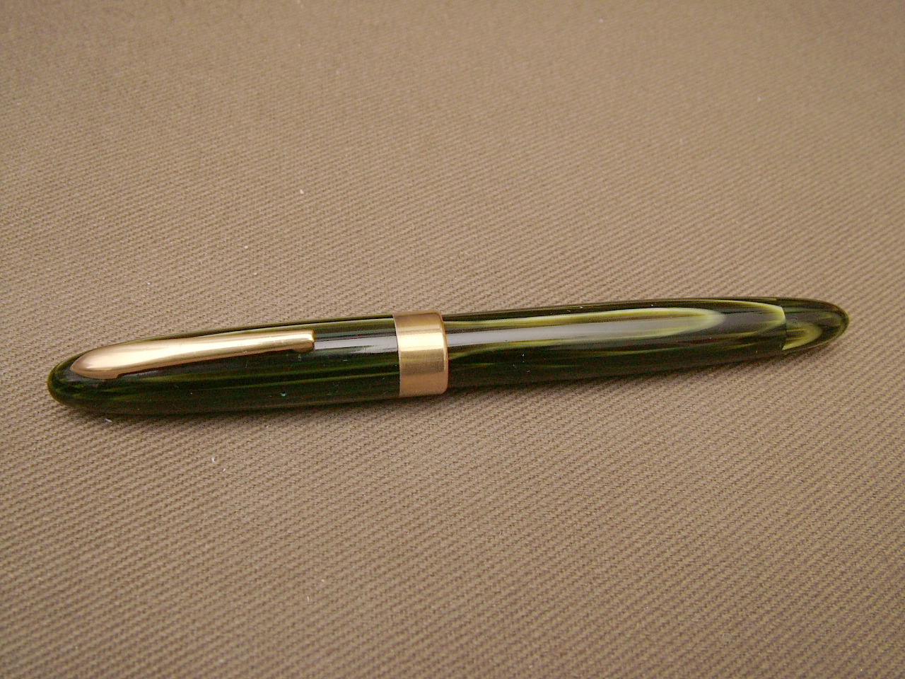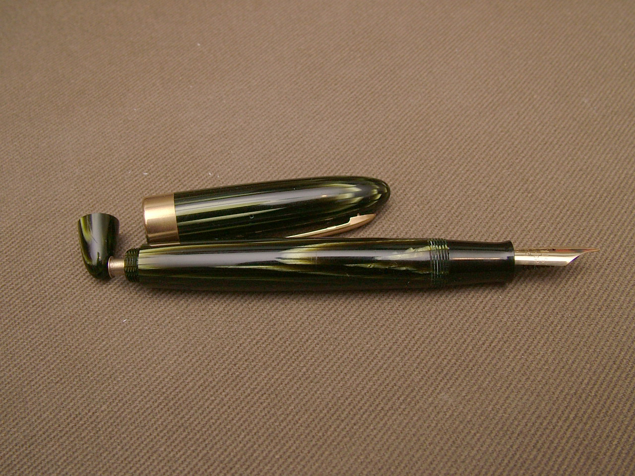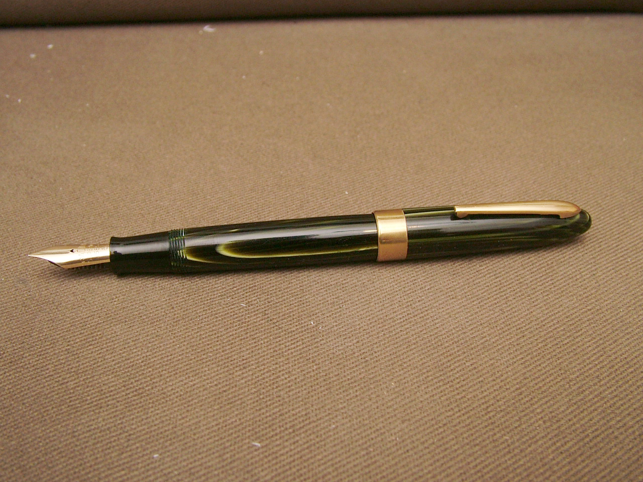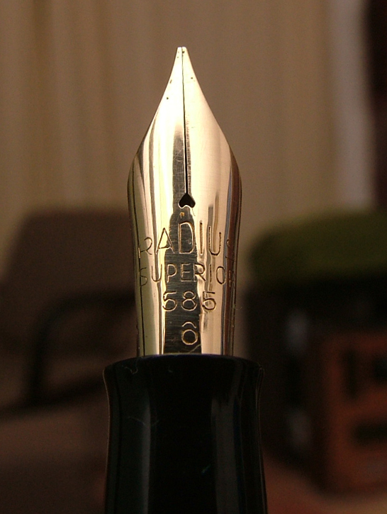 Radius Superior ad ogiva penna con caricamento a pulsante, abbastanza comune, ma con un bel colore di celluloide ad arco.