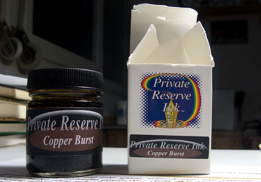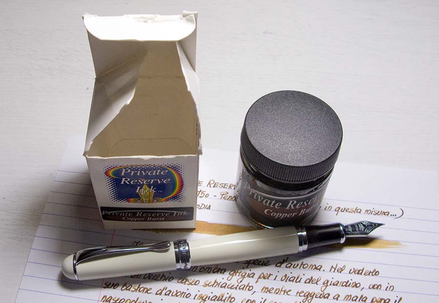 Ho acquistato questo inchiostro, ormai parecchio tempo fa, durante una svogliata passeggiata serale nella vicina Reggio Emilia. Tra le varie tinte propostemi dalla gentilissima proprietaria del punto vendita acquistai, all’epoca, il “Black Magic Blue” (già da me recensito in passato) ed il Copper Burst, che avevo promesso di recensire appena possibile. Dato che io ho ritmi a dir poco sudamericani, e prendo tutto con una flemma che a volte sgomenta anche me, lo faccio solo ora.