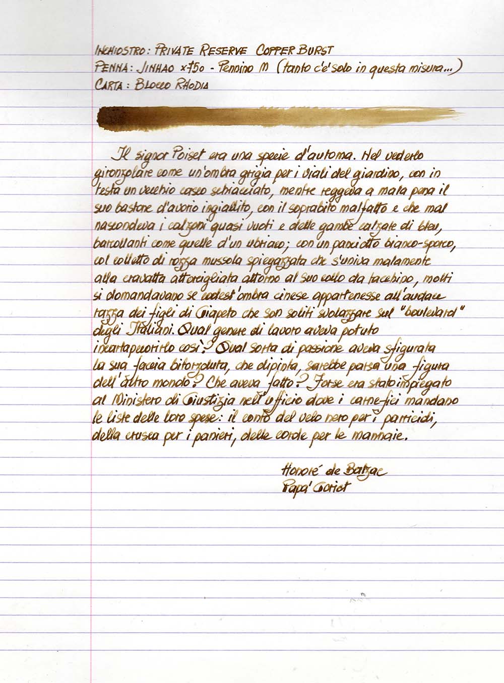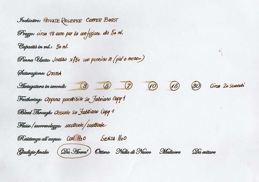 E’ il secondo Private Reserve che riesce a porsi, nei miei confronti, come inchiostro da usare regolarmente. Io amo particolarmente le tonalità brune e questo, pur avendo delle sfumature giallo ocracee con vaghi accenni di verdaccio, incontra perfettamente i miei gusti, per cui non manca mai sul mio scrittoio. Ho trovato piacevolissimo il feedback restituito durante la scrittura e, sempre a titolo di opinione personale, credo che sia particolarmente adatto a pennini medio-fini, ma ovviamente ci sarà chi - invece - lo potrà preferire con un extrafine giapponese. Penso che richieda un flusso piuttosto bagnato per esprimersi al meglio: con flussi molto magri schiarisce eccessivamente, fino a compromettere la leggibilità. Lo vedo adattissimo per usi calligrafici che, ahimé, sono fuori dalla mia portata, in quanto sono un totale incapace.