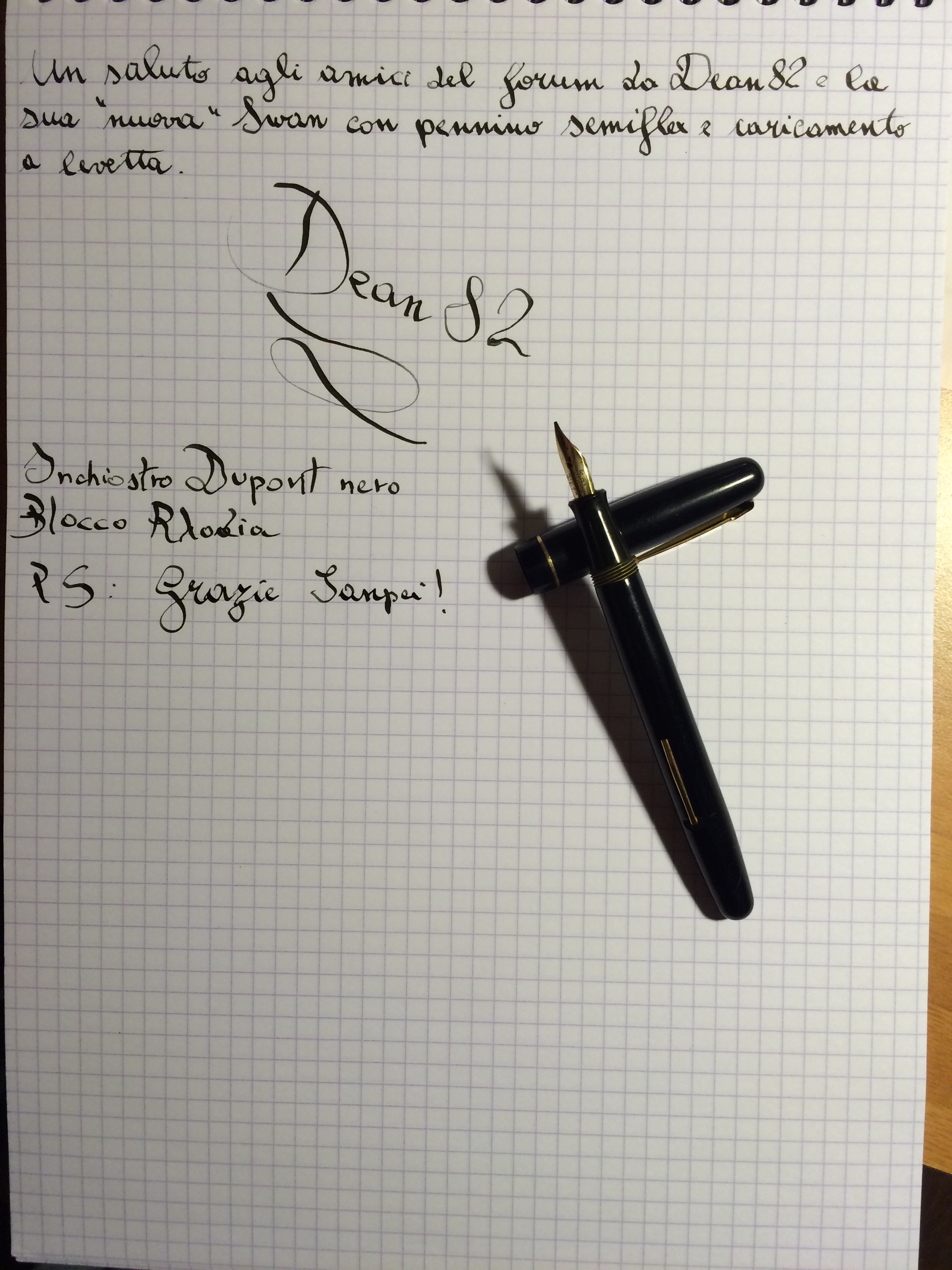 Io ho acquistato una Swan 3120 con caricamento a levetta dal GM (l'ho usata per scrivere il saluto pubblicato in precedenza) mentre oggi l'ho usata per scrivere una lettera. Purtroppo, durante l'uso il flusso si è interrotto ed ho pensato fosse scarica, pertanto l'ho caricata nuovamente; dopo poche parole, tuttavia, si è fermata ancora. Adesso si sta lavando, poi la proverò con un altro inchiostro e se i problemi rimarranno, mi metterò in contatto con sanpei.