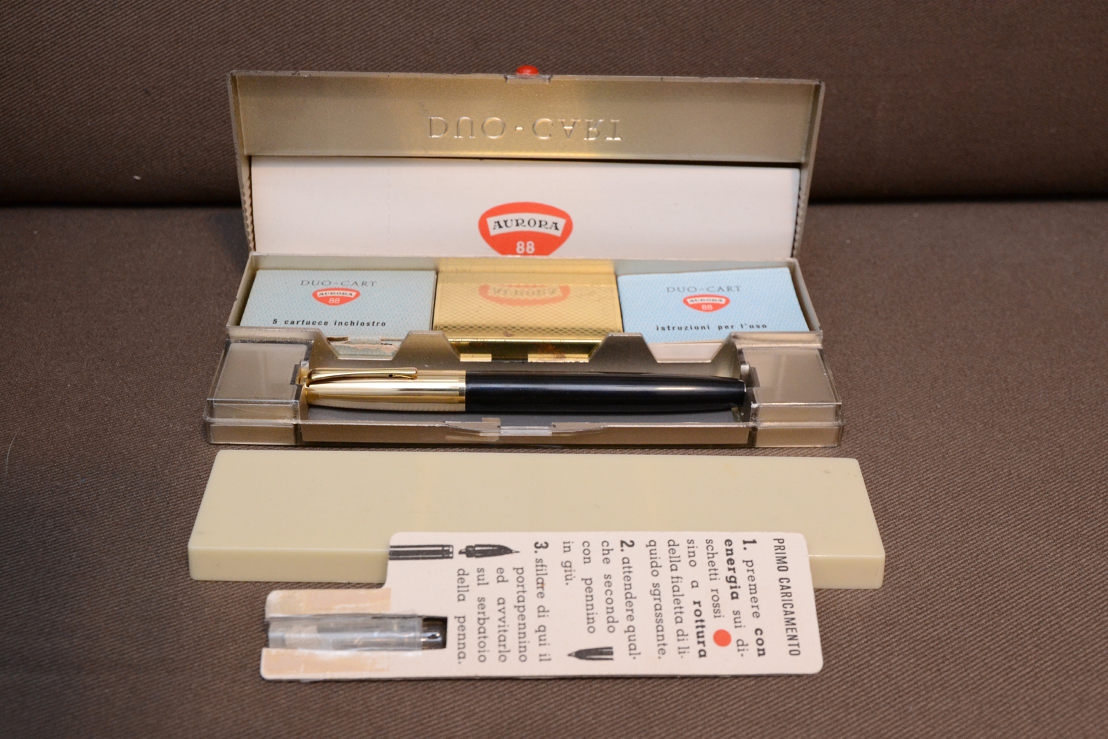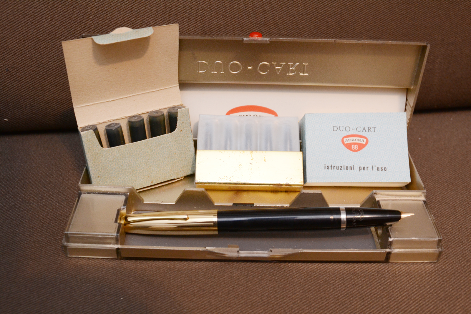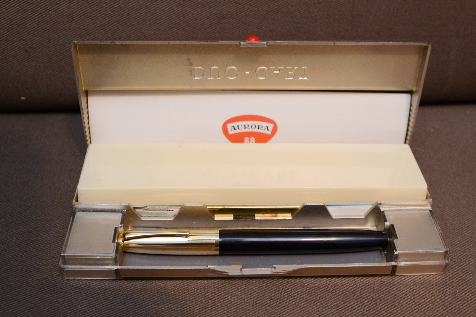 Più avanti ho trovato una Aurora 88 Duo-cart prima serie in perfette condizioni, mai inchiostrata nella sua confezione originale, molto bella per i mie gusti, è diversa dal solito per il tappo corto e il fusto con la forma della sede del cappuccio, Ho altre Duo-cart, ma come questa mai vista, sicuramente una delle prime versioni il numero di serie è 0796.