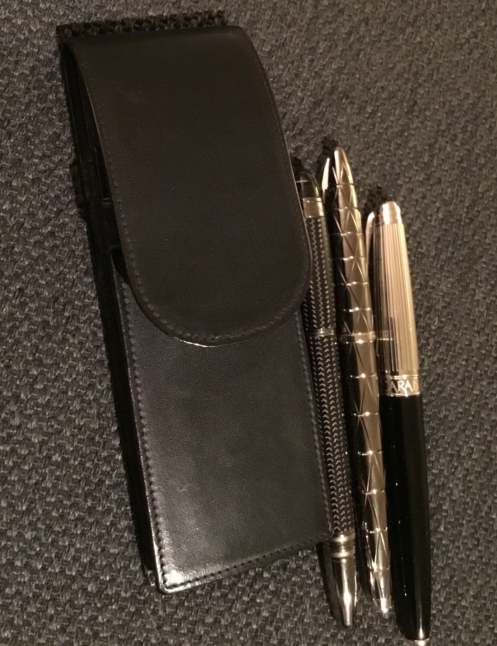 Io per gli appunti da prendere al volo durante il lavoro porto nella tasca dei pantaloni una Kaweco Sport Classic, per avere con me altre 2 stilo più sensibili ai maltrattamenti uso questo portapenne in pelle, si apre completamente o solo parzialmente, e una volta chiuso è particolarmente piatto e quindi si infila nella borsa da lavoro senza problemi. La Pelikan M150 nella foto fa capire le dimensioni.