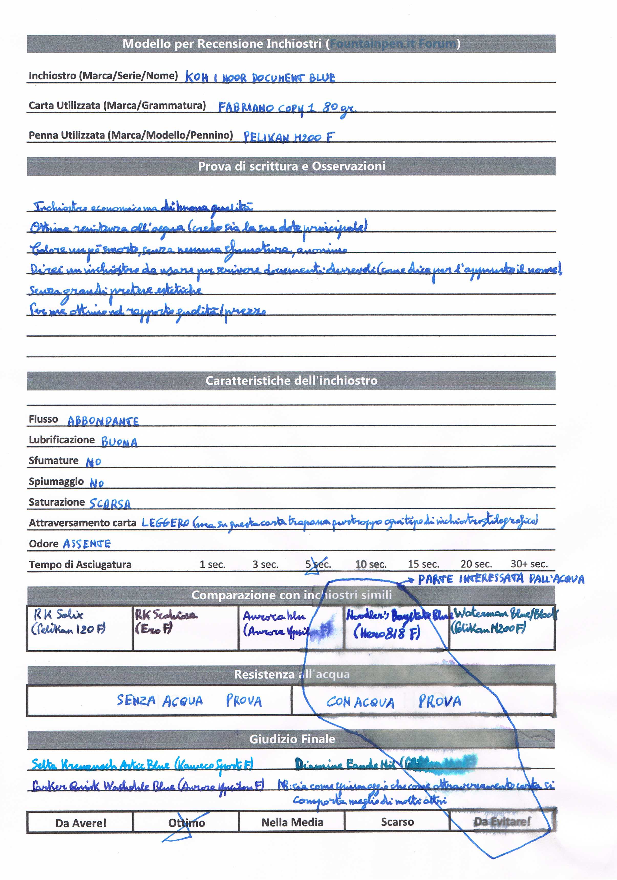 Soddisfatto del risultato, l'ho ora caricato su una Pelikan M200: molto fluido e scorrevole, nessuna falsa partenza neppure dopo qualche giorno di inutilizzo... Direi tutto bene. Per me, un inchiostro quanto meno da provare (la Casa quali indelebili ha solamente il blu ed il nero).