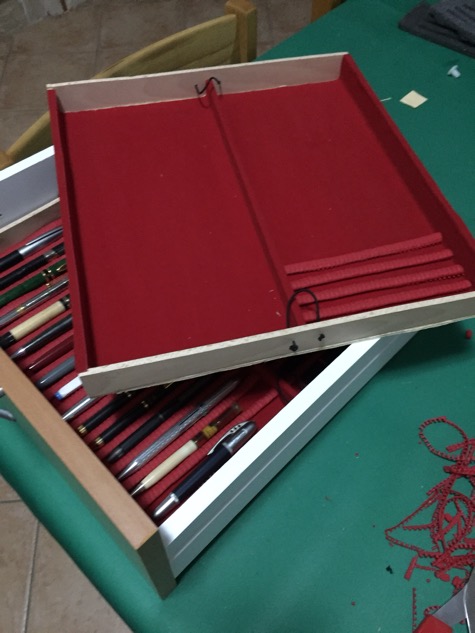 Una soluzione molto originaleciubeca ha scritto:io,siccome sono un malato del fai da te,mi sono creato dei vassoi a misura rivestiti di velluto adesivo e li ho inseriti in un cassetto dedicato a loro....così ho un bel po di spezio....per ora.Per separatore ho usato quei tappetivi antiscivolo gommosi a metro il tutto spendendo pochi euro.Poi ho anche un porta penne in legno che mi hanno regalato dove ci tengo le penne migliori