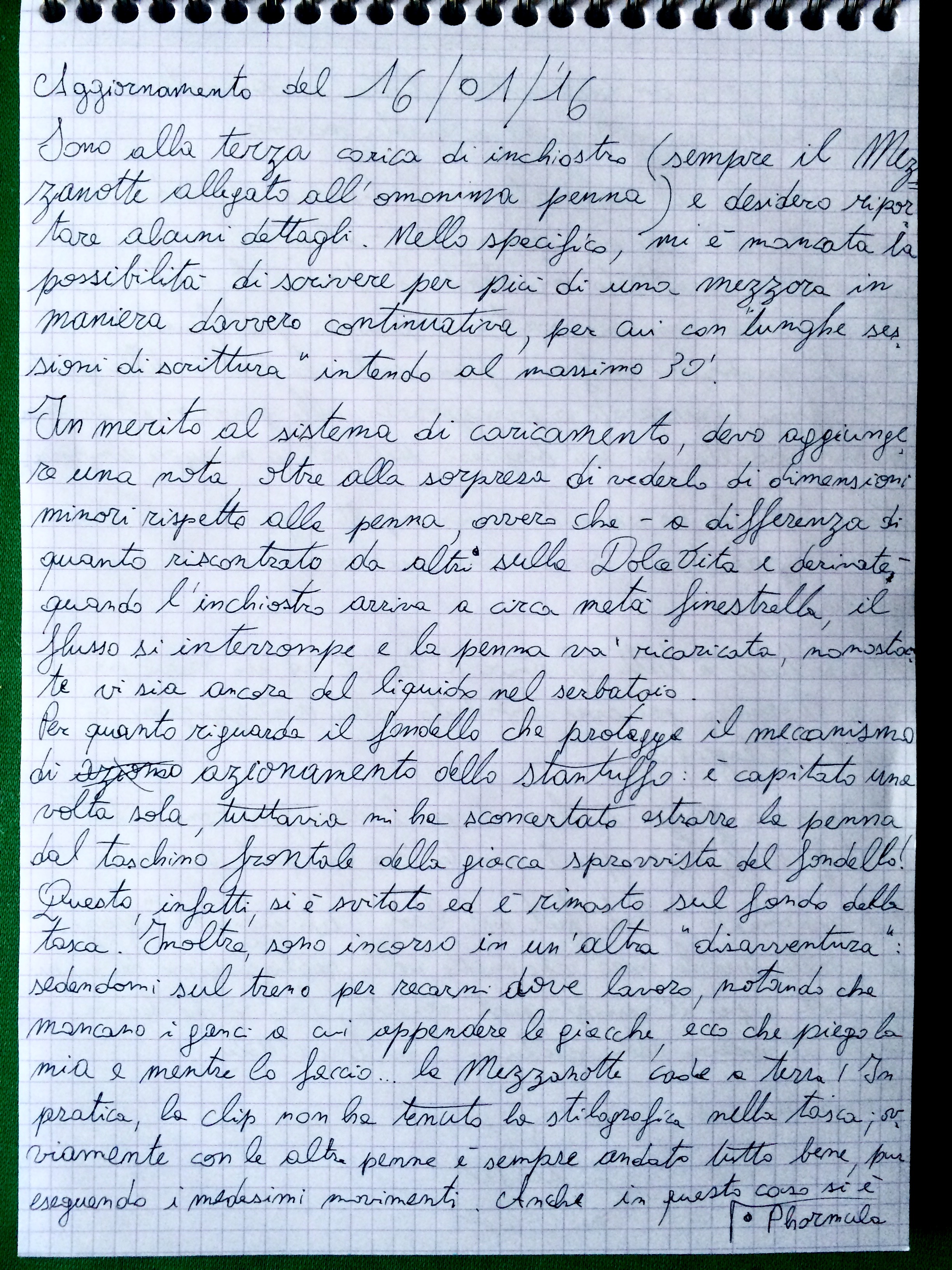innanzitutto ringrazio io voi per i feedback relativi alla recensione. Voglio precisare alcune cose, non chiarite nello scritto: i) io preferisco il fondello che si avvita, nonostante possa essere considerato prerogativa delle penne economiche, perché offre una protezione in più; ii) la tasca dalla quale è caduta la penna e nella quale ho ritrovato il fondello 'smarrito' è l'unica completamente aperta, mentre le altre giaccge hanno la tasca cucita ad esclusione delle due parti terminali (pertanto una concorrenza alla caduta del tessuto/della tasca in questione non va esclusa); iii) non ricordo se il rinvenimento del fondello nella tasca fosse succesivo alla caduta (sicuramente il fatto che la tasca sia 'reale' e non fatta solamente per infilarci una penna o la stanghetta degli occhiali ha fatto sì che la stilografica fosse libera di 'viaggiare' al suo interno) e nel caso, anche l'impatto a terra potrebbe aver avuto un ruolo nella rimozione del fondello). Il fatto che non si sia più ripresentato, mi fa ben sperare.