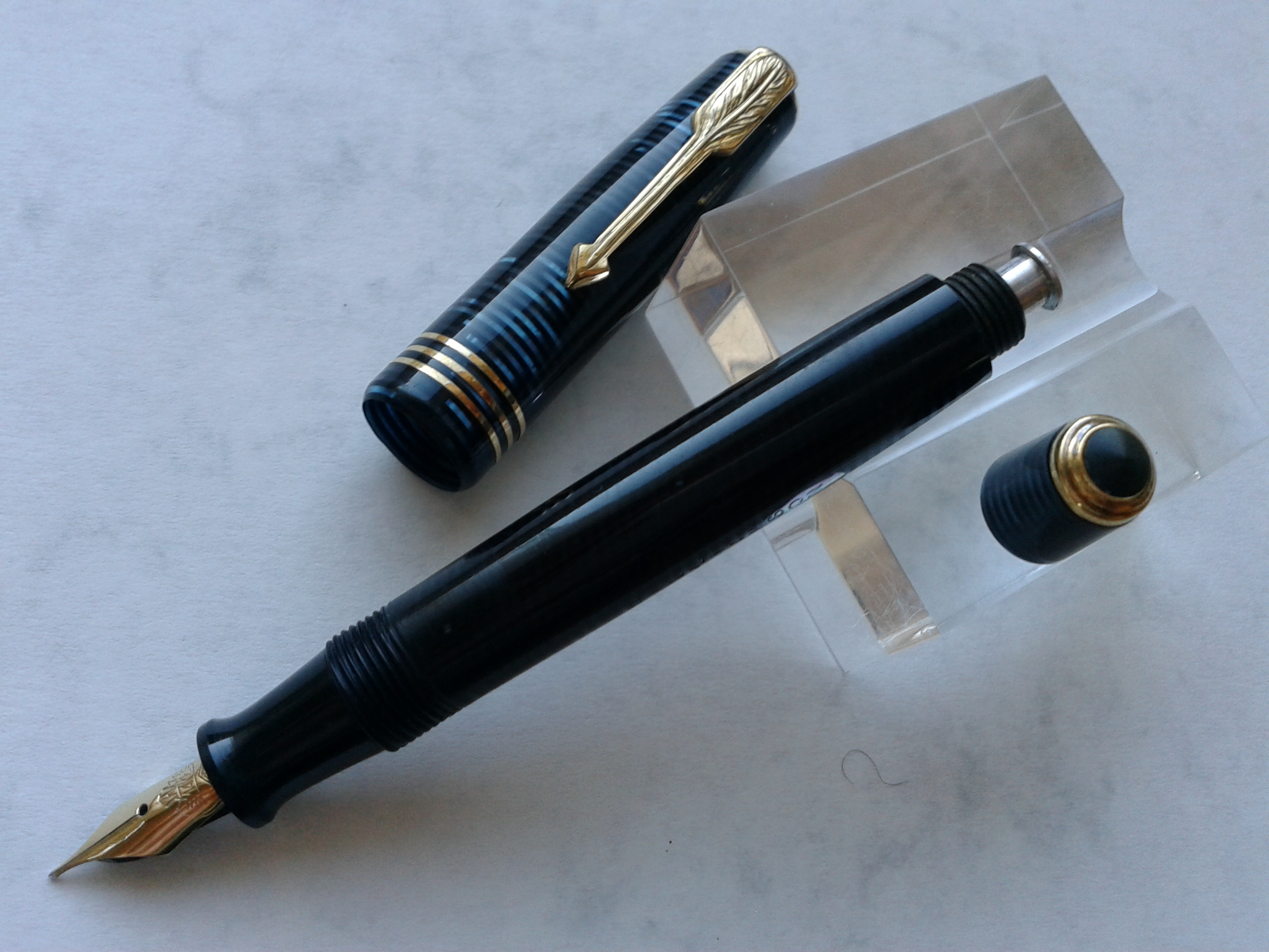 WILLIAMSON TORINO* misura piccola** in celluloide anellata blu tornita da barra piena, parti metalliche a vista laminate in oro, pennino Williamson in oro 585, caricamento a pulsante di fondo, produzione Italia anno 1940. * Non è noto il nome di questo modello cilindrico.