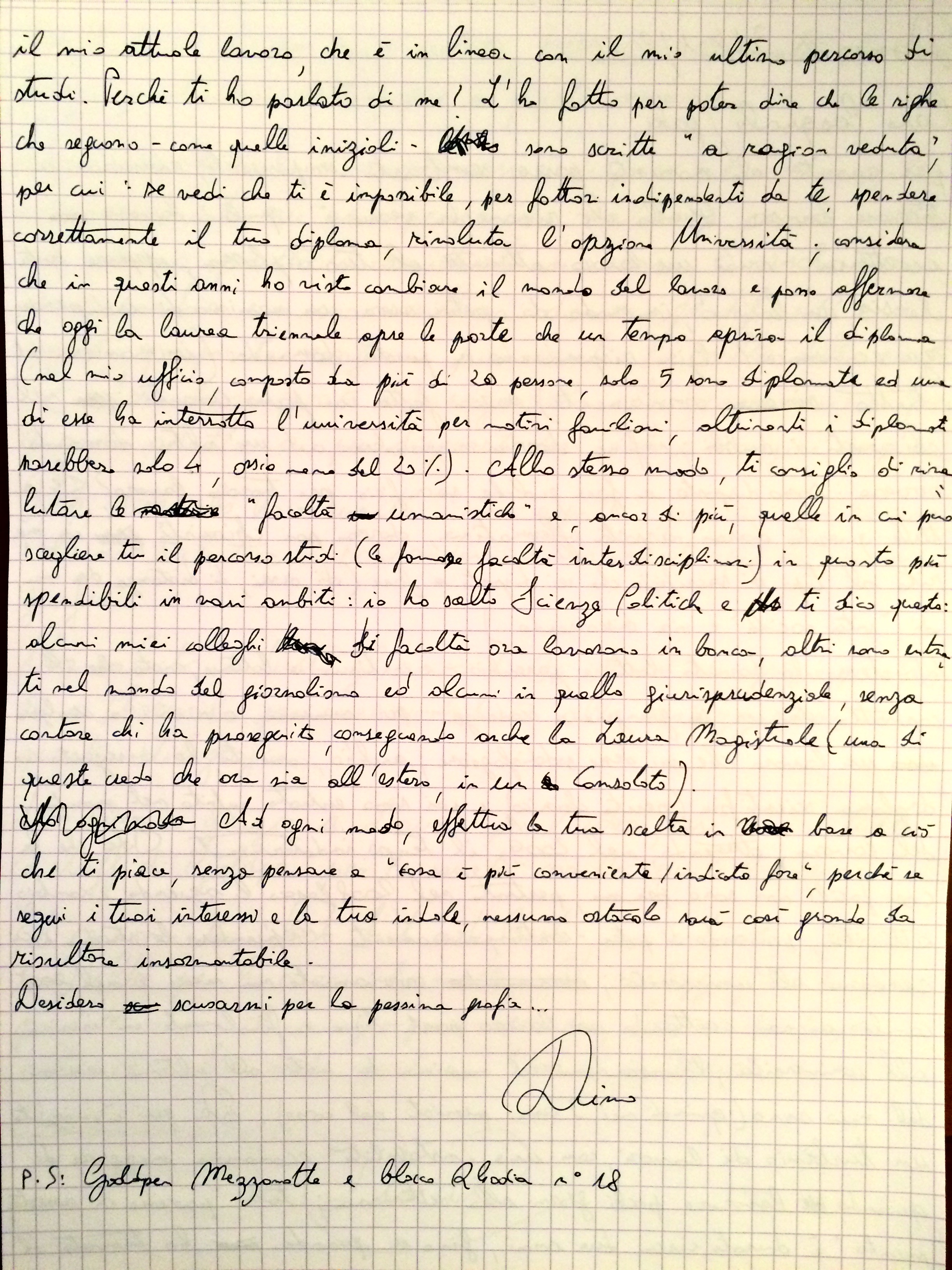 @paki: come ti ho anticipato nello scritto, per tutta una serie di motivi, oggi come oggi la laurea triennale ha soppiantato il diploma per quanto riguarda il livello minimo di competenze richiesto dal mercato del lavoro. A fronte della tua preferenza per un lavoro intellettuale, ritengo ancor più fondamentale il considerare una facoltà - o un corso di laurea - interdisciplinare; questo perché ad oggi le società di servizi - ovvero quelle che al momento assumono un numero leggermente superiore di individui - preferiscono persone in grado di analizzare le varie situazioni da più punti di vista (almeno, questa è la mia esperienza personale). Ribadisco il concetto di scegliere il tuo percorso in base alle preferenze, anziché in base al lavoro futuro; per fare questo, reputo necessario il valutare i piani studi che tutti i vari Atenei pubblicano online e da lì iniziare la fase di scrematura. Poi potranno entrare in gioco altri fattori, quali la distanza da casa, la 'fama' dell'Università e quant'altro, tuttavia il primo passo è individuare il corso di laurea che fa per te. Ultimo consiglio, poi la smetto con la modalità 'dispensatore di consigli non richiesti'