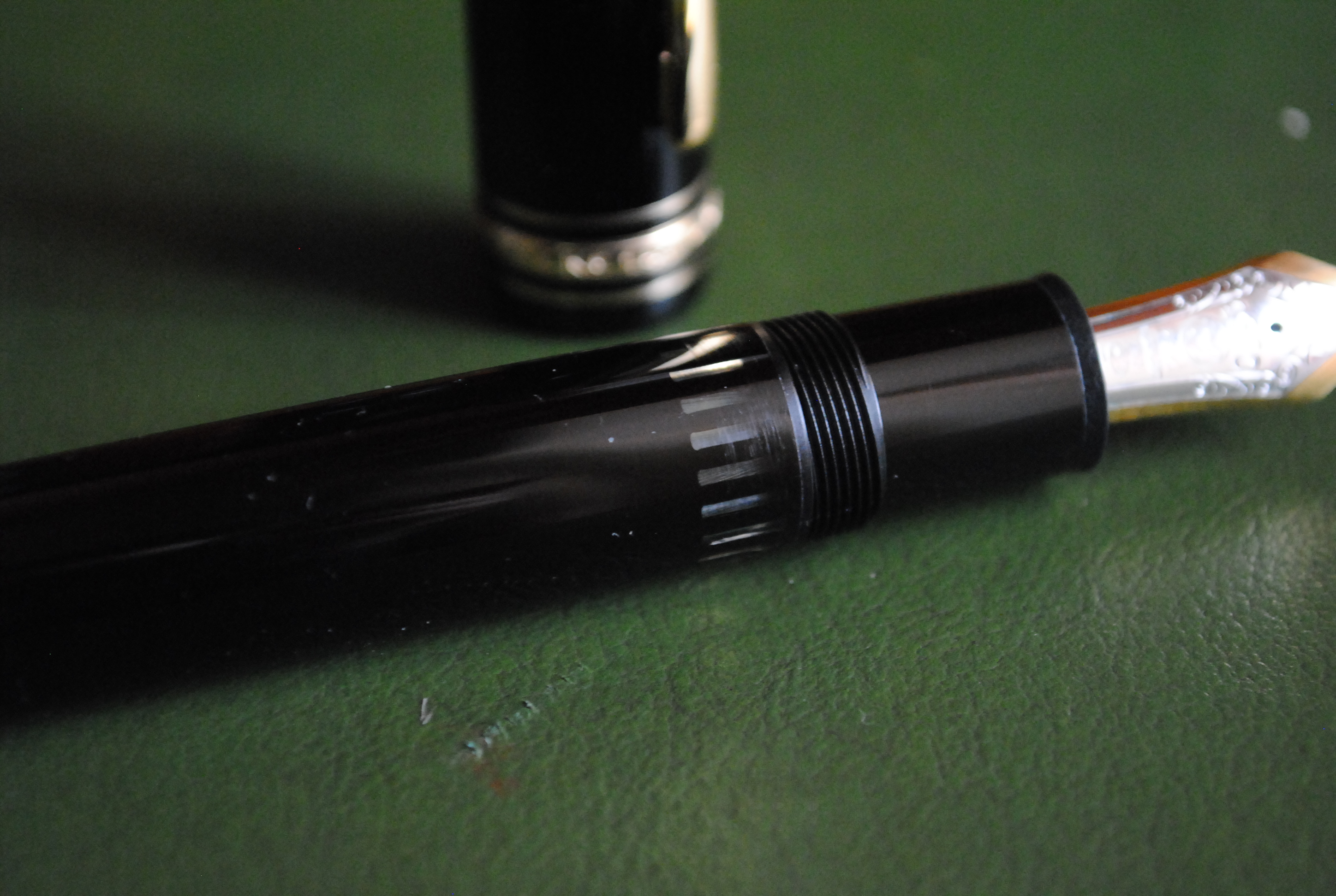 Verso la fine del corpo troviamo un anello dorato, che ricorda un po' quello della clip, prima del fondello. Questo anello, infatti è la parte esterna del meccanismo di caricamento in ottone di cui è dotato questo vero e proprio gioiello scrivente.