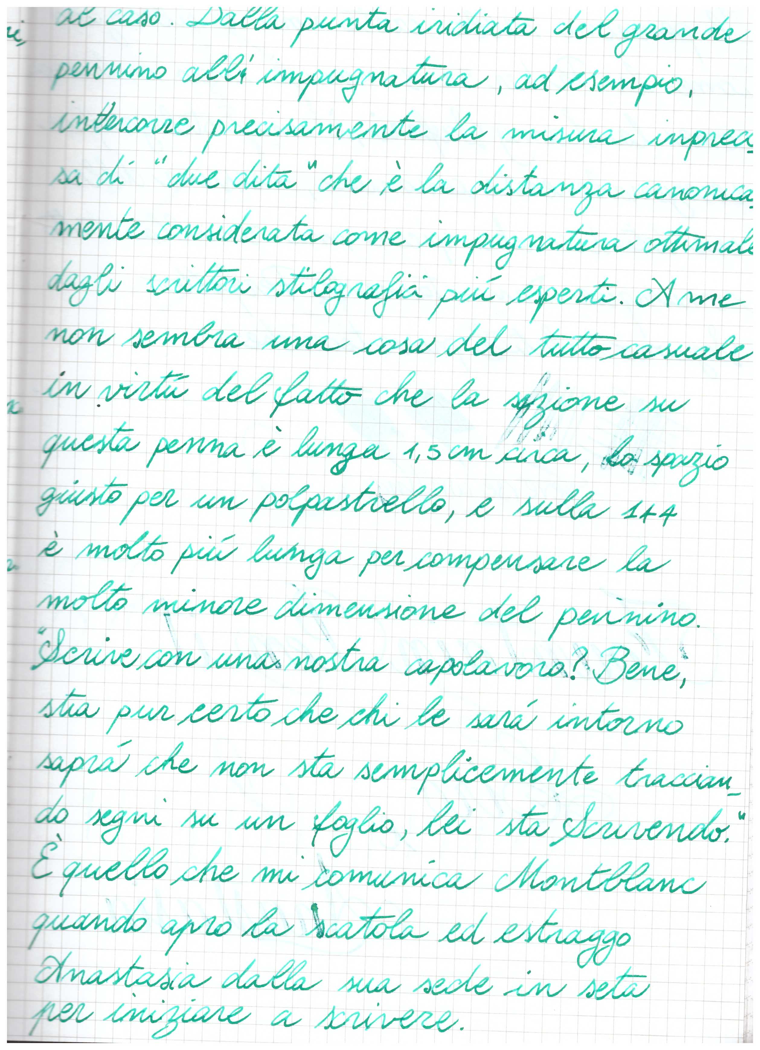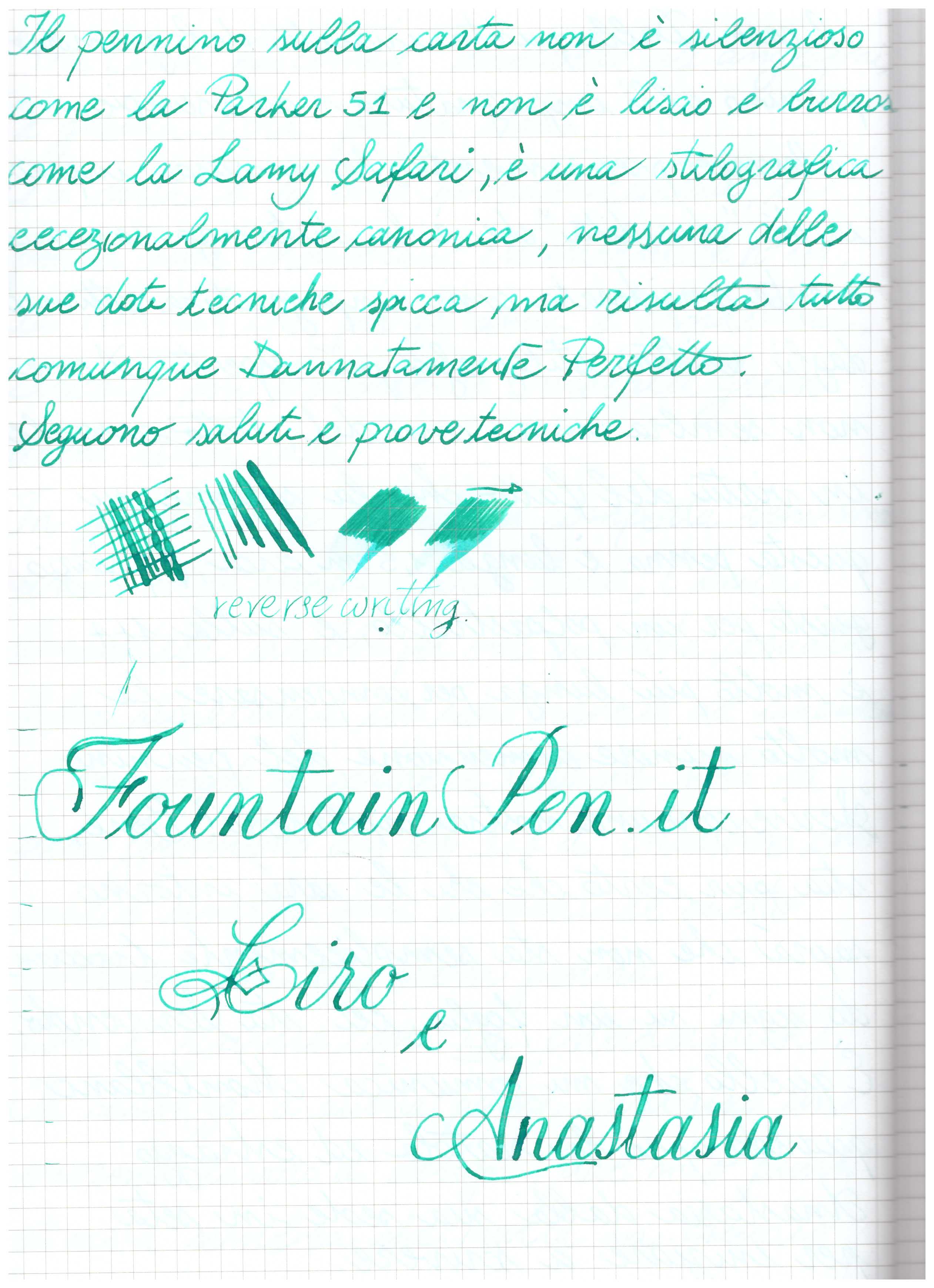 Ora ecco la prova di scrittura, specifico che i problemi a cui faccio riferimento sono stati in grande misura risolti da un riallineamento dei rebbi, confido che col tempo la penna si abituerà alla mia mano e migliorerà ancora di più, vi terrò aggiornati:
