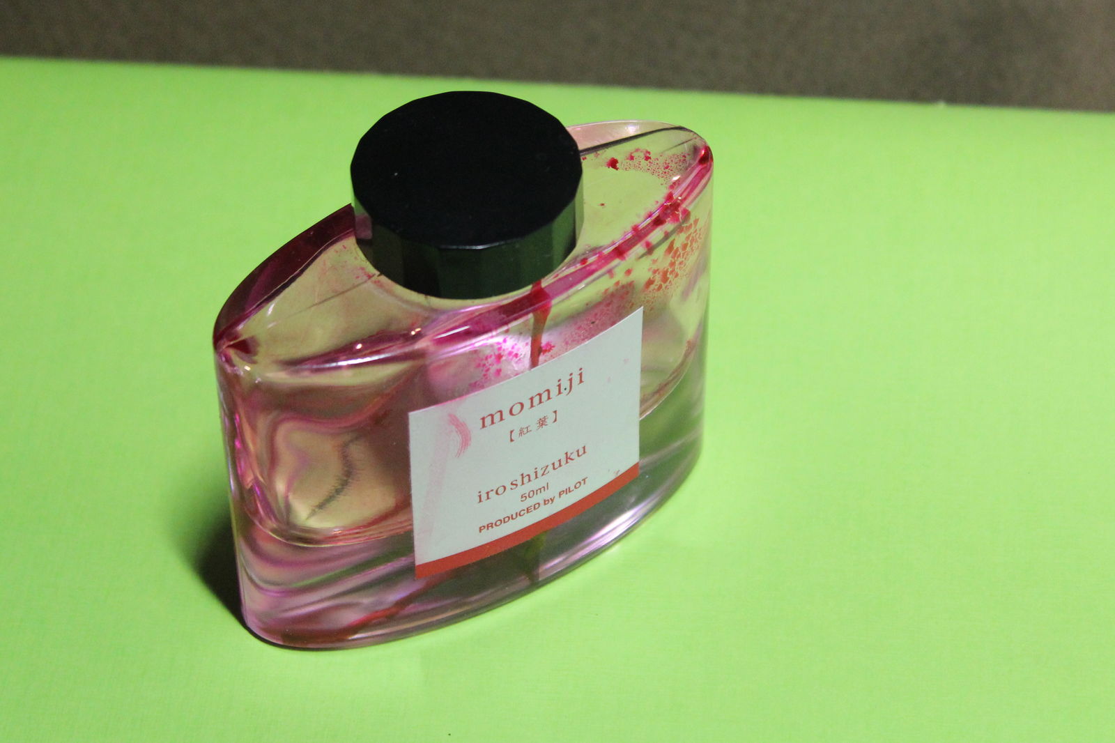 La scorsa settimana il mio Iroshizuko Momiji mi ha in buona parte abbandonato. La pur bellissima boccetta si è crepata dividendosi in due in maniera quasi perfetta. Crepata e non rotta, la boccetta ancora è intera, ma dalla crepa è filtrato via buona parte dell'inchiostro, e la scrivania si è salvata solo perché sopra il piano c'è una lastra di vetro ed il laghetto rosso si è fermato su quello.