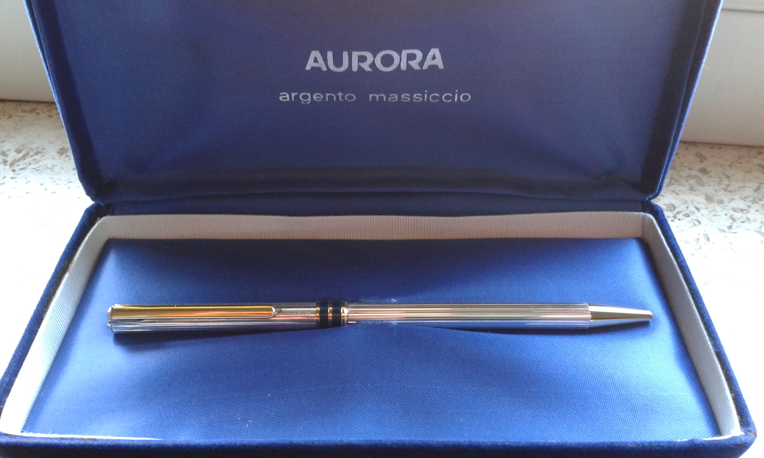 Un amico mi ha omaggiato per il mio compleanno di questa biro Aurora vintage (adesso lucidata con il Sidol, praticamente nuova), suppongo sia un Aurora Marco Polo in argento produzione anni 80/90 suppongo, il refil è funzionante.