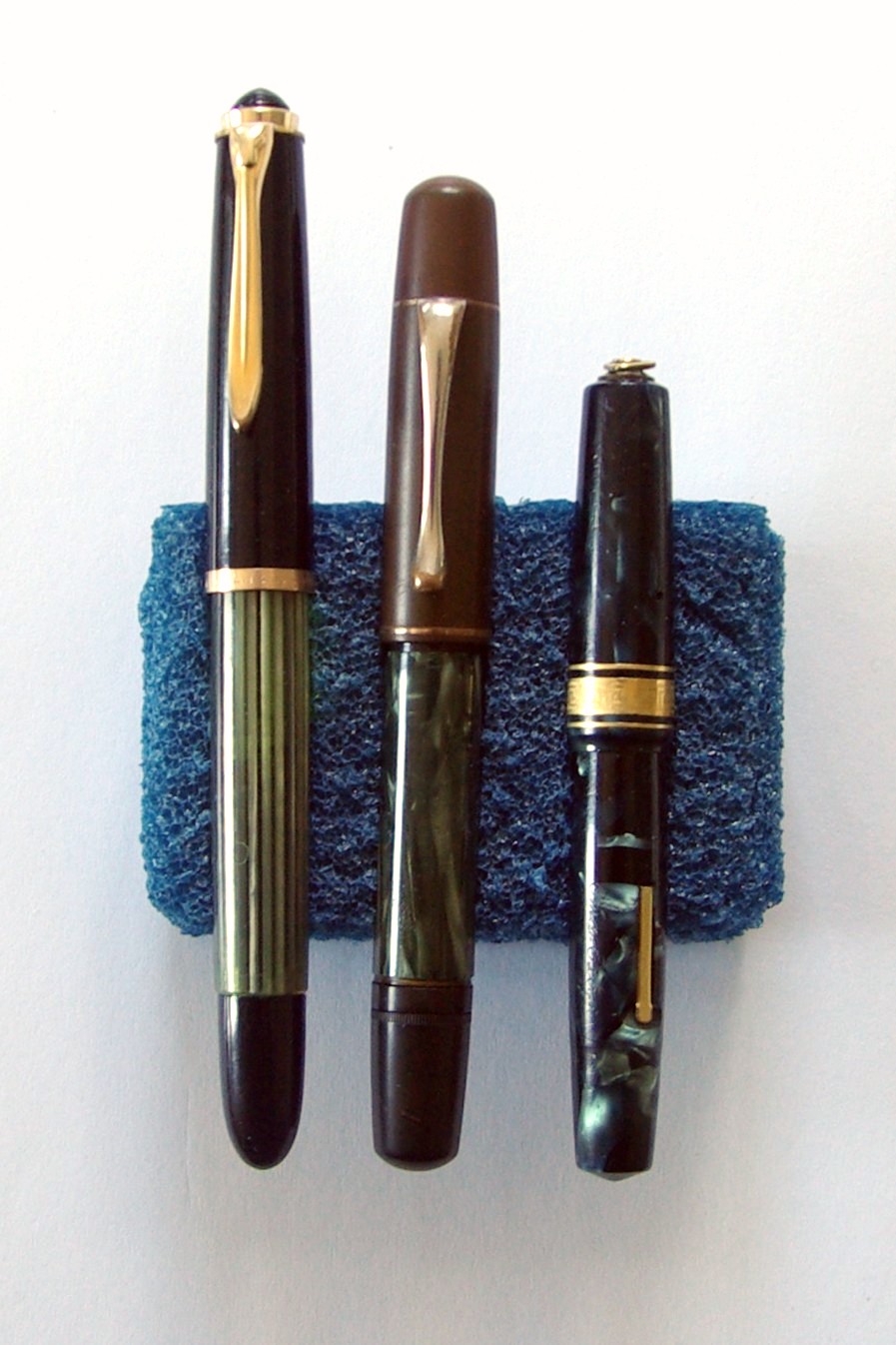 Allora, la butto lì, quella centrale potrebbe (molto "potrebbe") essere una IBIS, molto somigliante alla Pelikan 100n e più o meno coeva; in tal caso, sulla testa del cappuccio in ebanite dovrebbe esserci scritto "Ibis" (eventualmente "Patent Ibis")