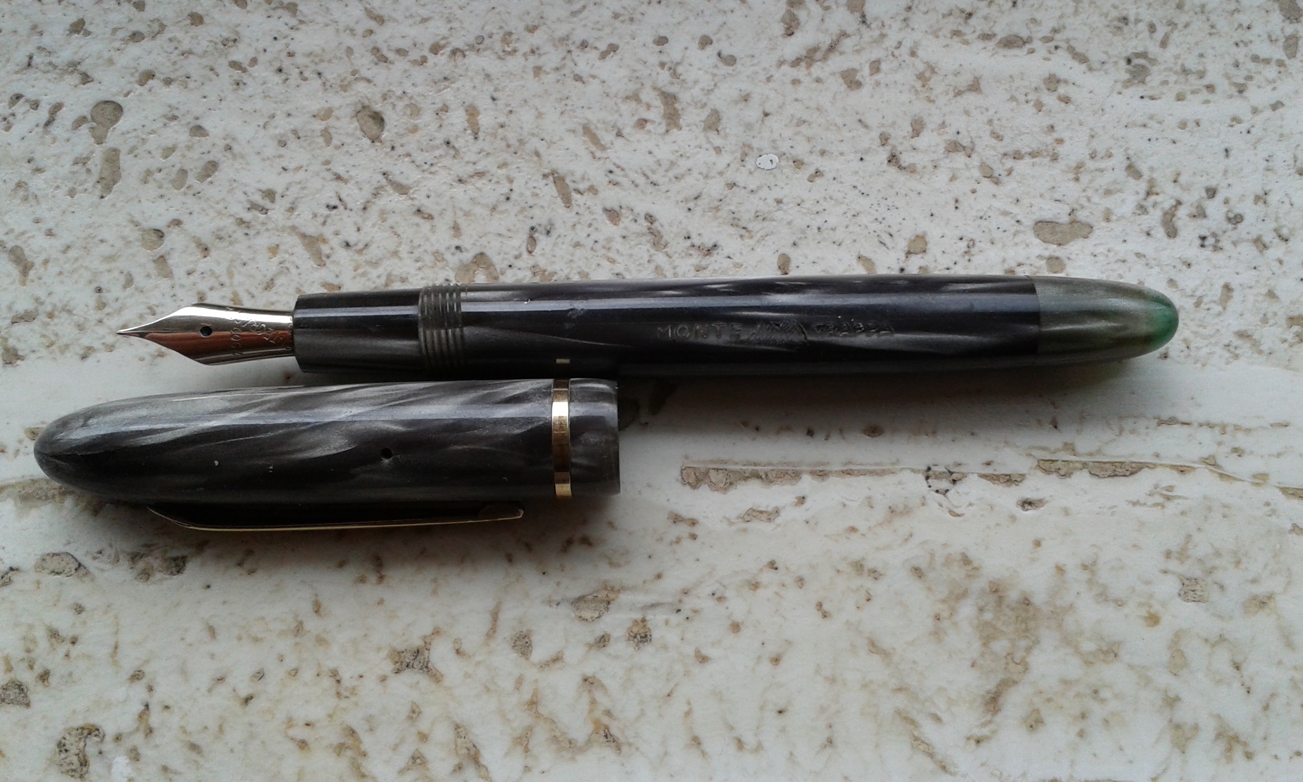 Insieme ad altre penne prese nel solito mercatino della mia zona ho trovato questo modello Waterman's di cui ignoro modello e data di produzione ha il pennino marcato Waterman's in oro 18k, ma è priva del sistema di caricamento anche se penso che sia pistone, all'interno è vuota, il fondello si svita.