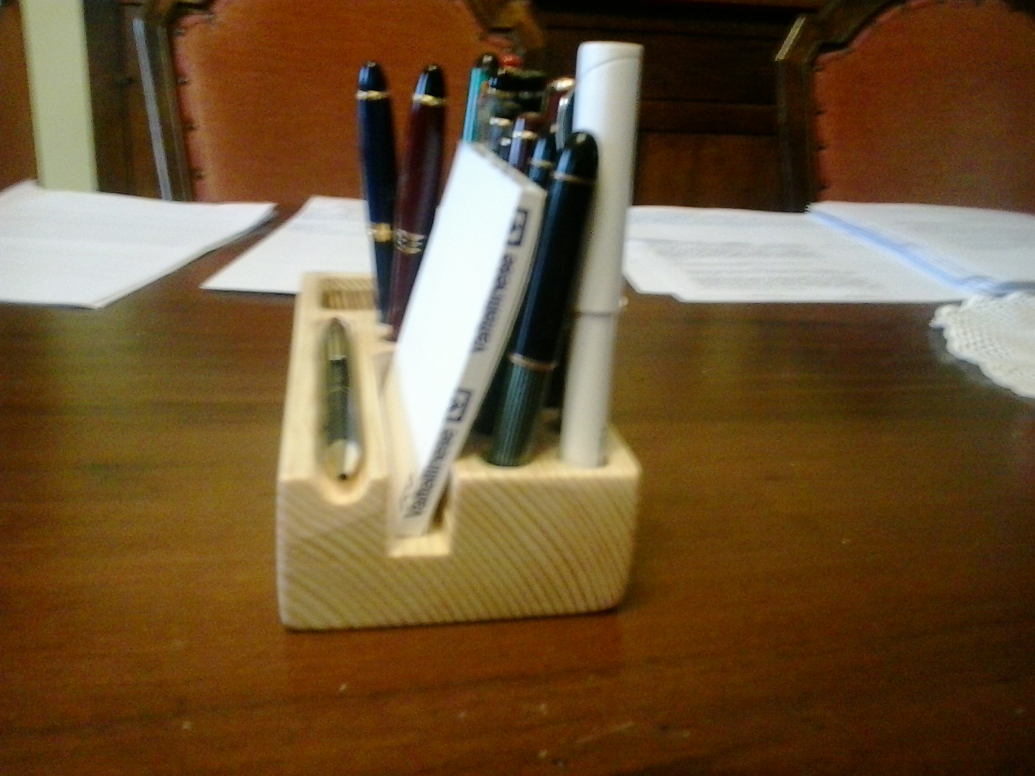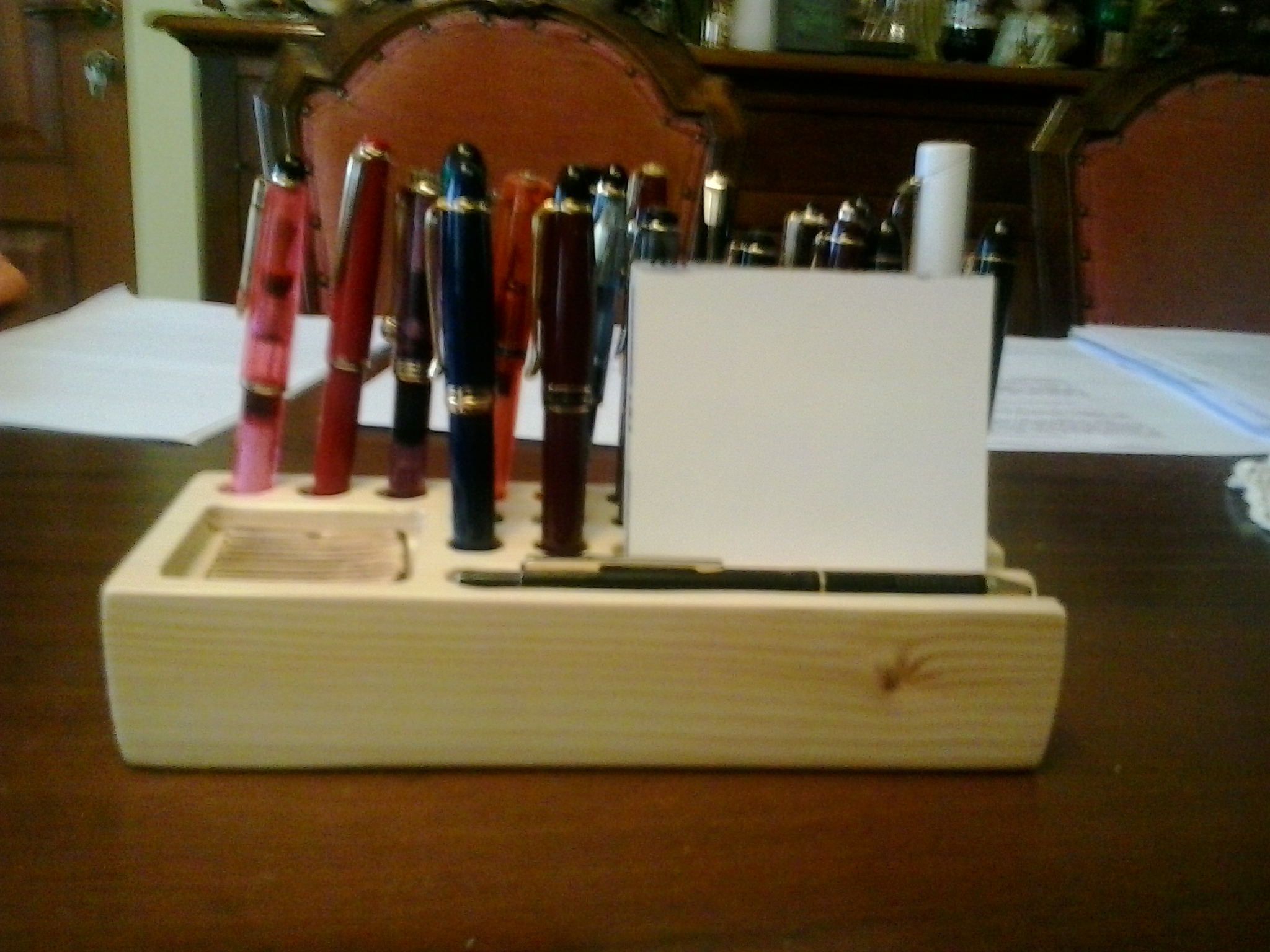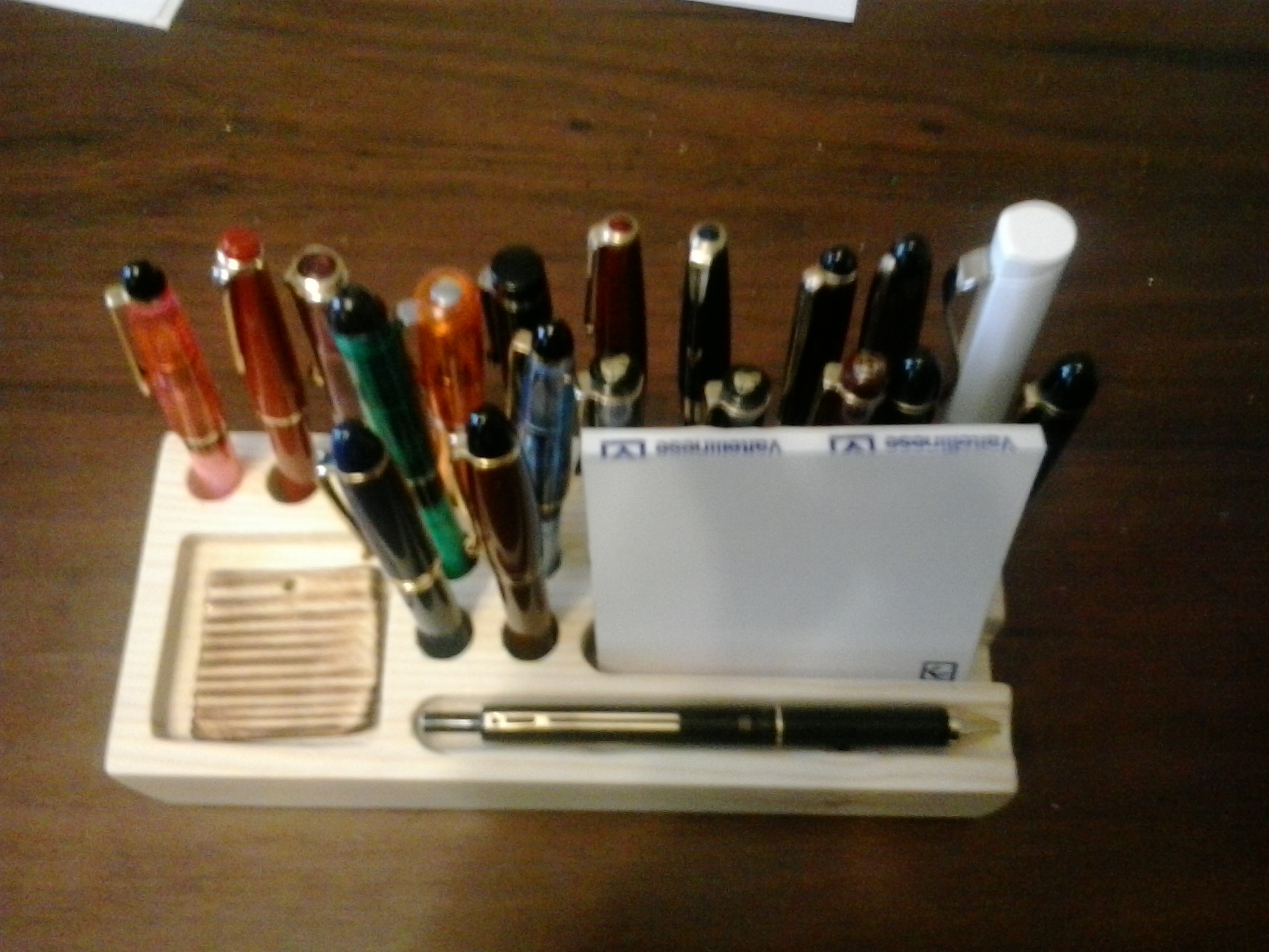 Io me lo sono fatto realizzare in legno di pino (uno dei più economici), 19 posti per le stilo + comparto per lo smartphone + comparto per clip e minuteria + comparto per sfere/tagliacarte, dimensioni 24,5 x 9,5 x 4, costo € 35,00 spedizione tracciata inclusa.