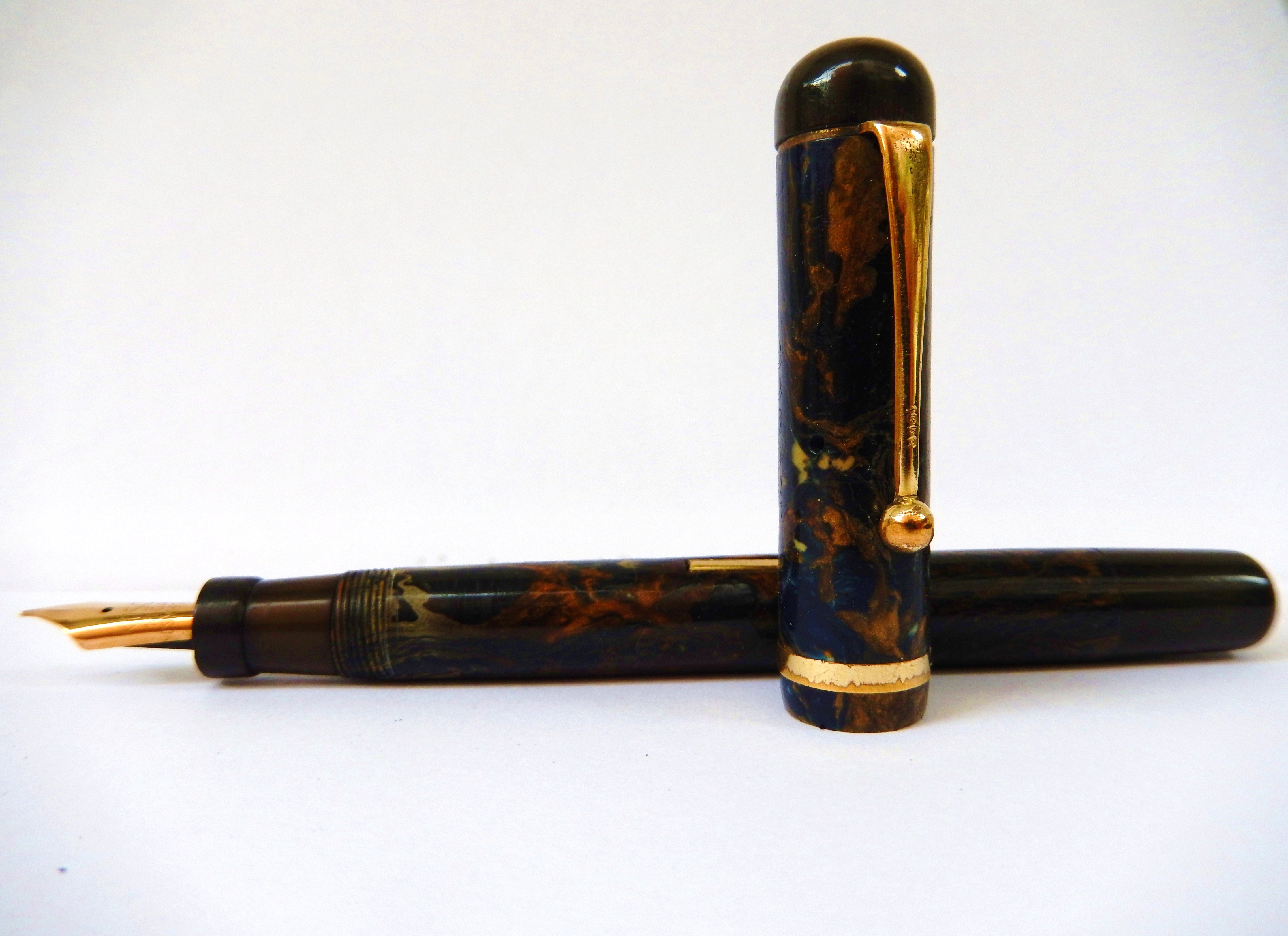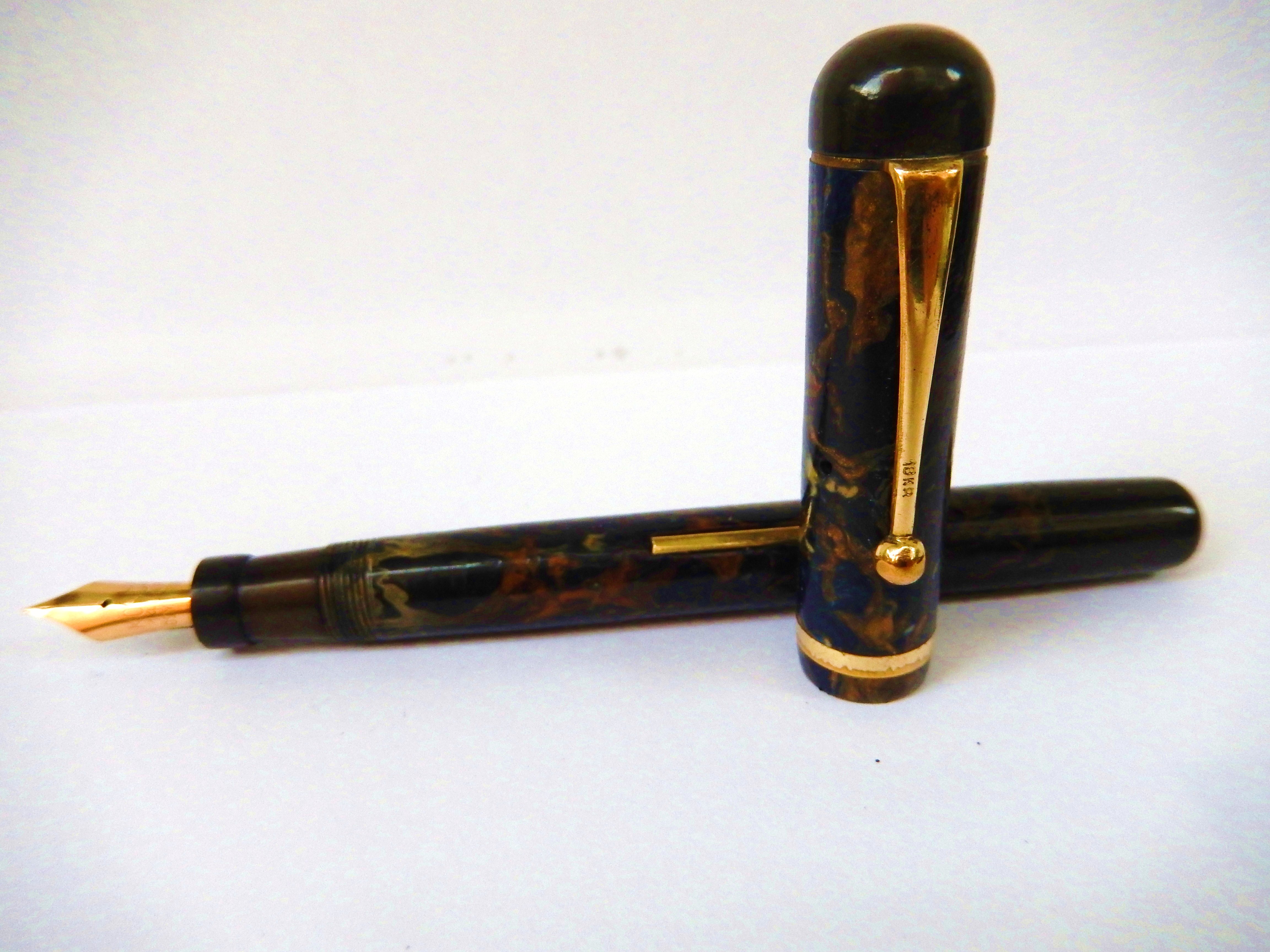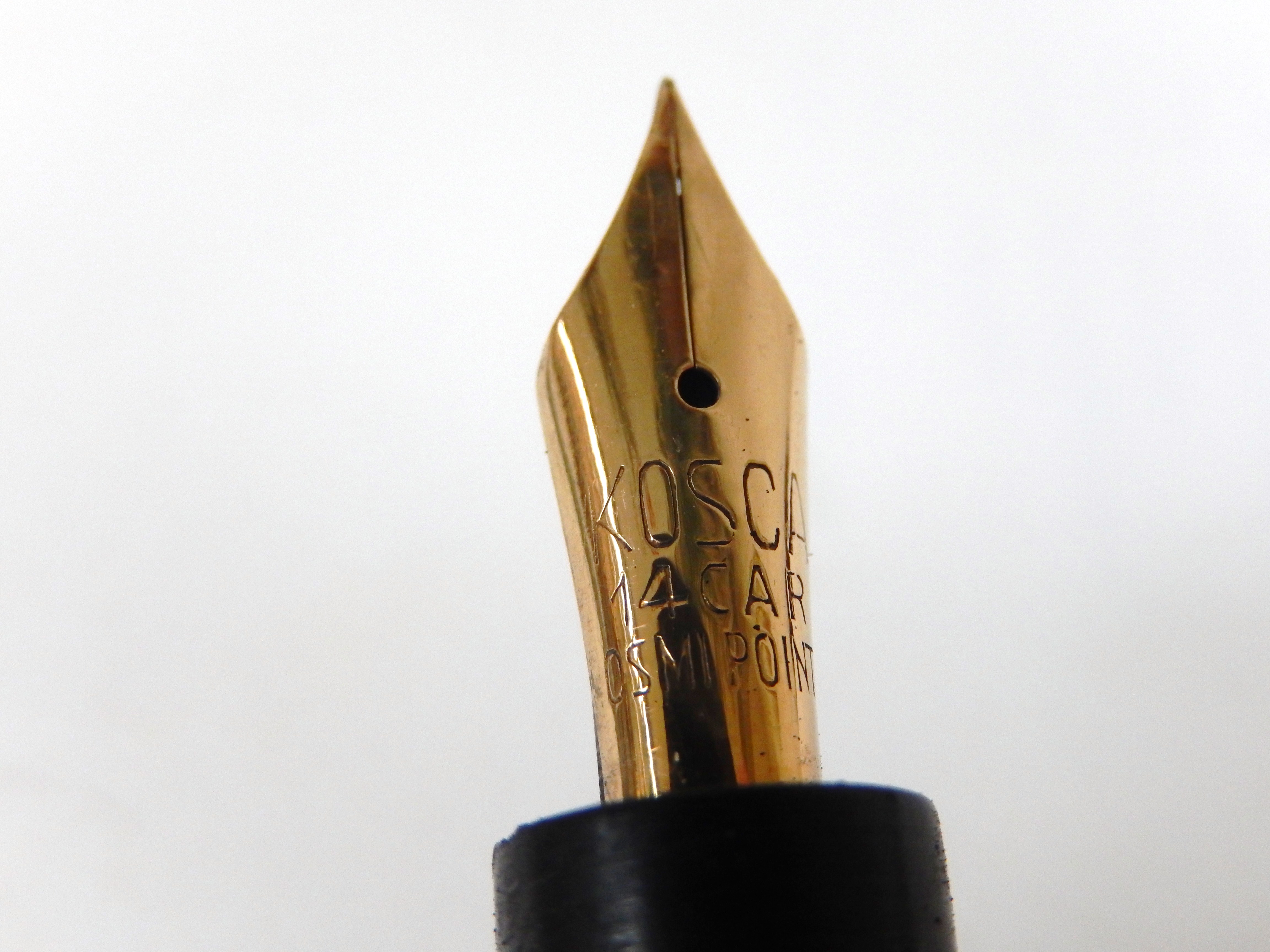 Senza soffermarmi a cercare di aggiungere qualcosa su questa casa rispetto alle notizie già riportate sul nostro bellissimo Wiki, mi fa piacere condividere le foto di questo esemplare di dimensioni generose ( lunga chiusa 14,3 cm) e dalle bellissime sfumature di colore fra il blu e l'oro. Il cappuccio termina in una cupola di ebanite nera che ferma la clip in oro 18 Kr ed ha in prossimità del labbro un solo anellino in oro . Il nome della casa figura non sul corpo della penna, ma sul cappuccio e sul pennino ove è inciso "KOSCA 14 CAR OSMIPOINT". Il sistema di carica è a leva ed il pennino ha una buona flessibilità ed una straordinaria scorrevolezza e scriverci è un vero piacere.