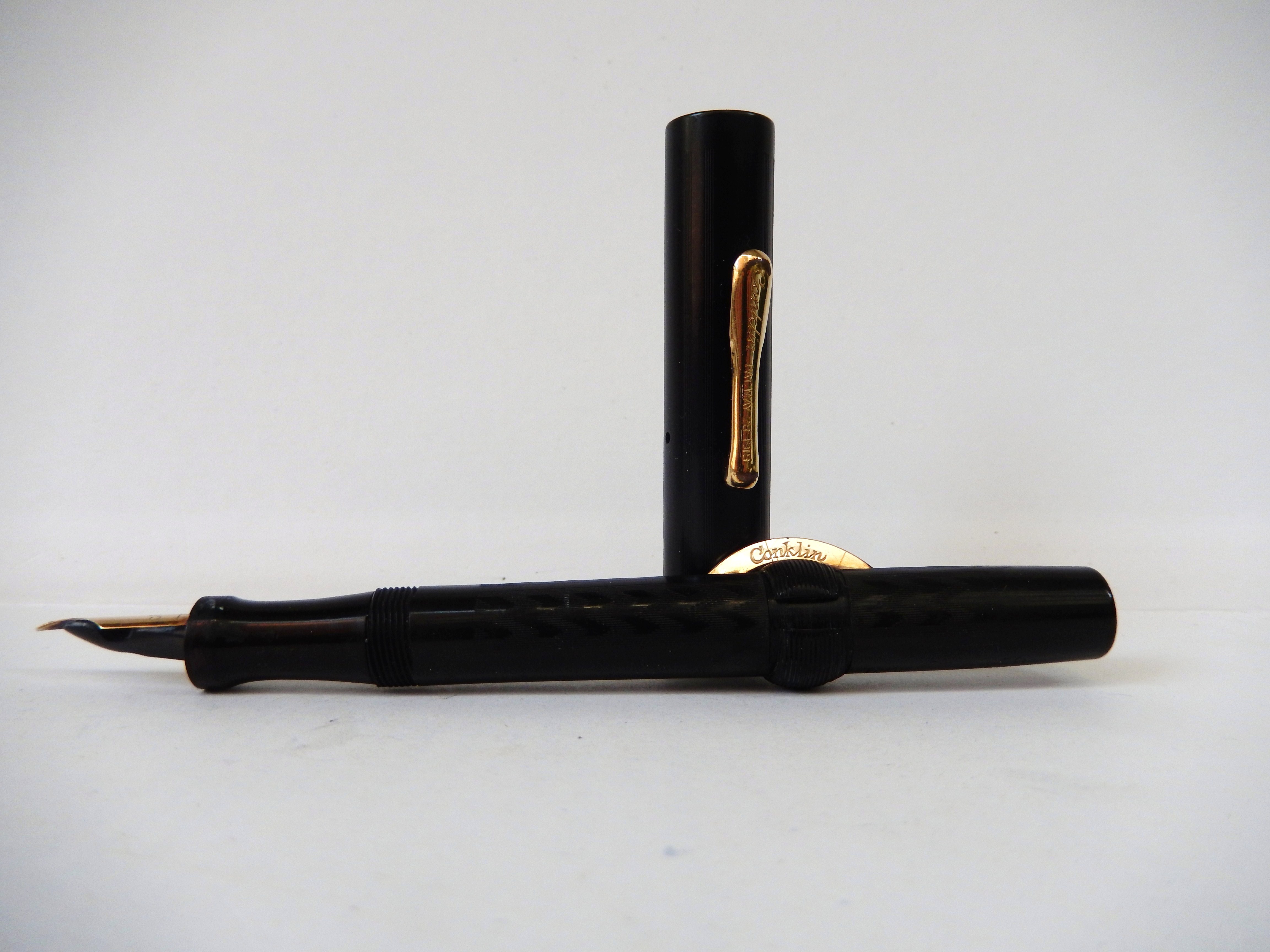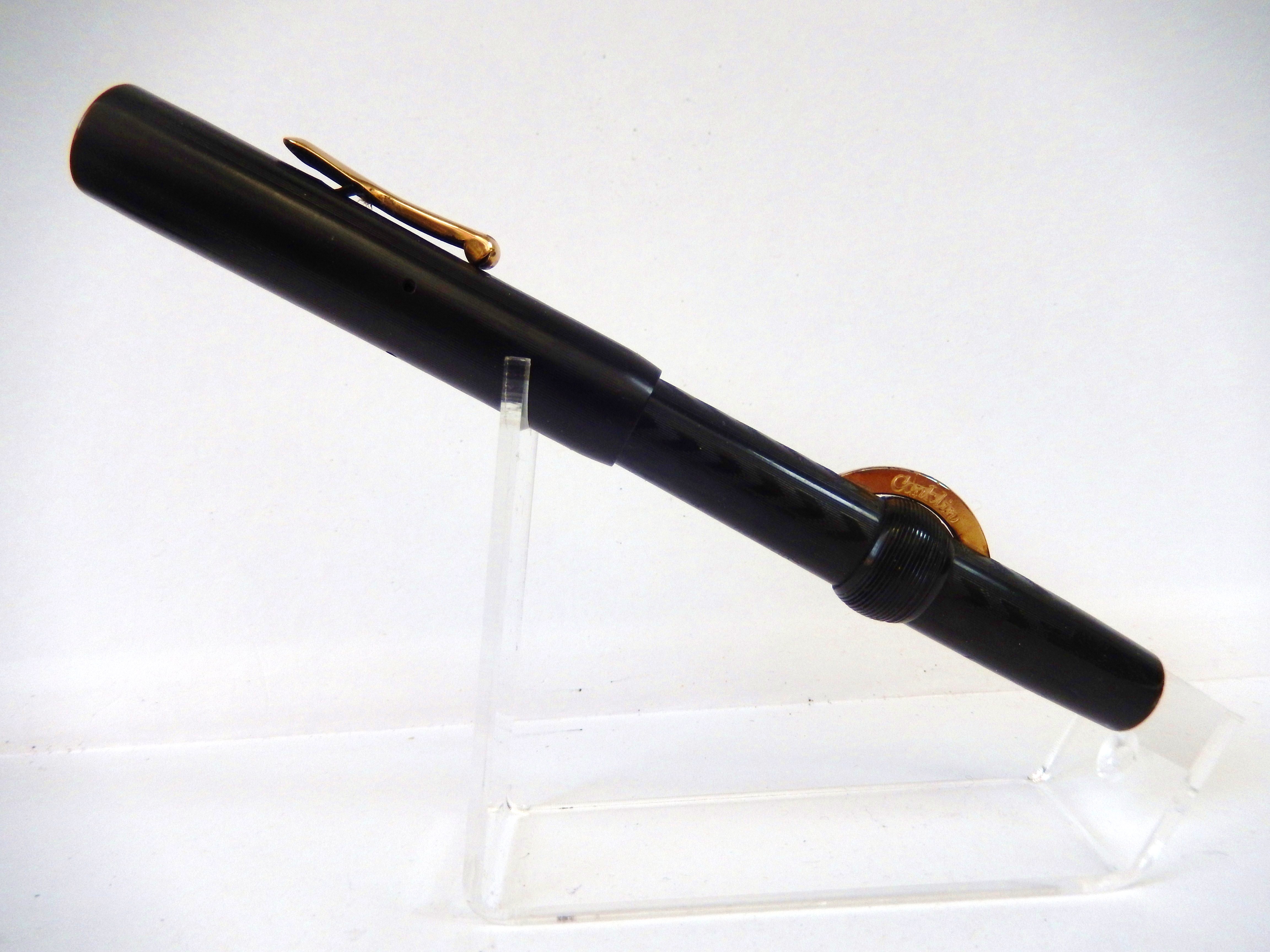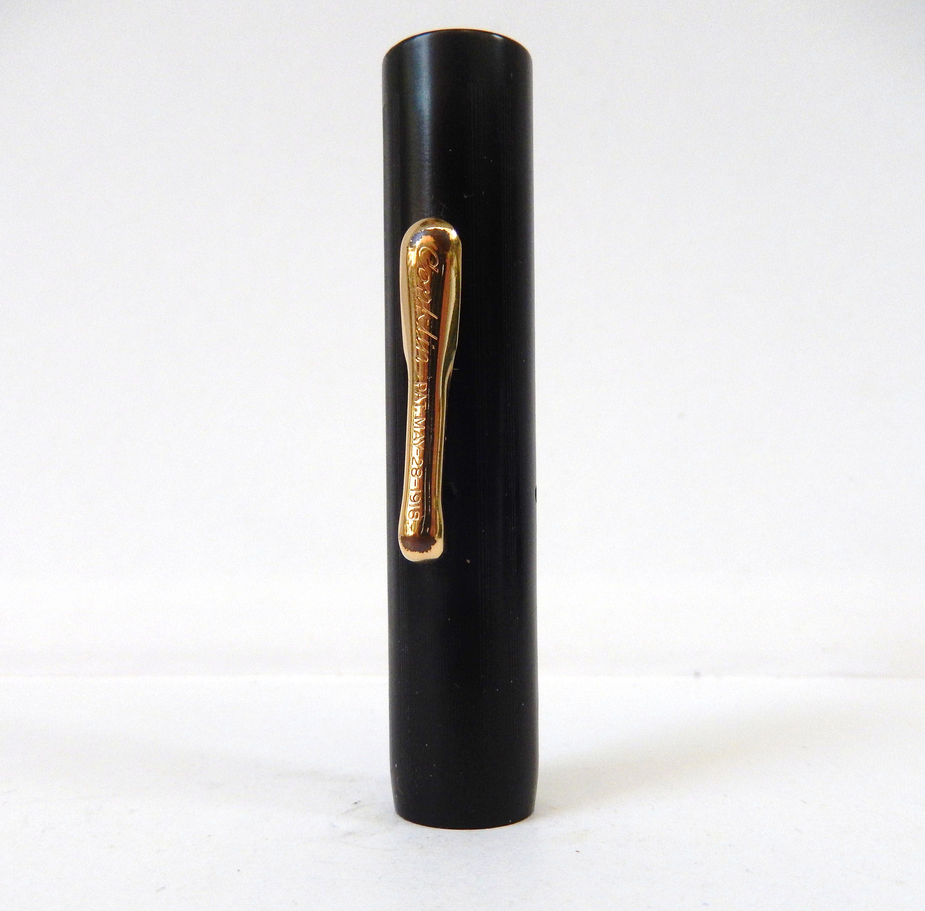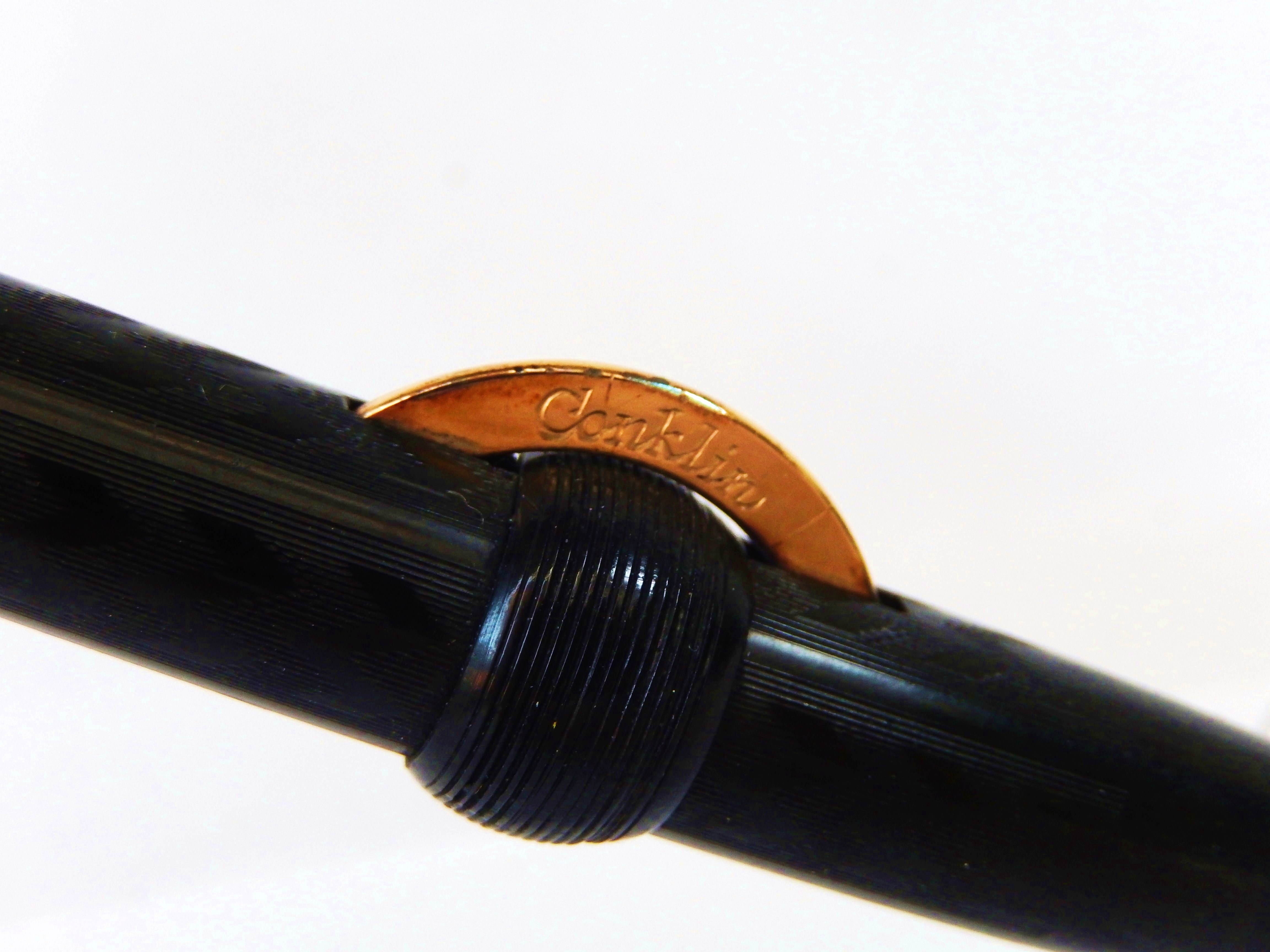 Il cappuccio, lungo 7 cm, flat, con chiusura a vite ( la prima volta appare nel catalogo del 1909) non presenta anelli sul labbro ed esibisce la classica clip a molla ( in essere dal 1916). Il modello fu in produzione fino a verso il 1923/24 quando sulla Duragraph la Conklin cominciò ad utilizzare la carica a levetta. Per datare questo esemplare può essere utile ricordare che fino al 1908 sulla mezzaluna non figuravano scritte, dal 1909 appare la scritta "trade mark crescent filler" e dal 1918 viene riportato, sull'altra faccia della luna,il marchio Conklin, come in questo esemplare, riferibile dunque fra il 1918 ed il 1923 circa. Il pennino in oro è un n. 5. come di norma su questo modello, di ottima flessibilità e scorrevolezza. Gli americani soprannominarono questo modello"il cammello" sia con riferimento alla gobba sporgente del crescent filler sia alla straordinaria capacità di rimanere a lungo senza abbeverarsi di inchiostro.