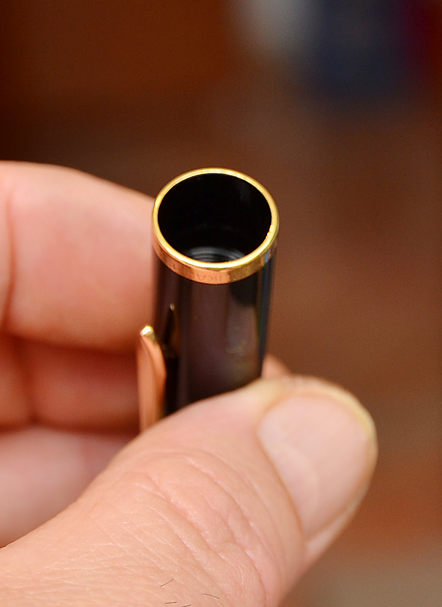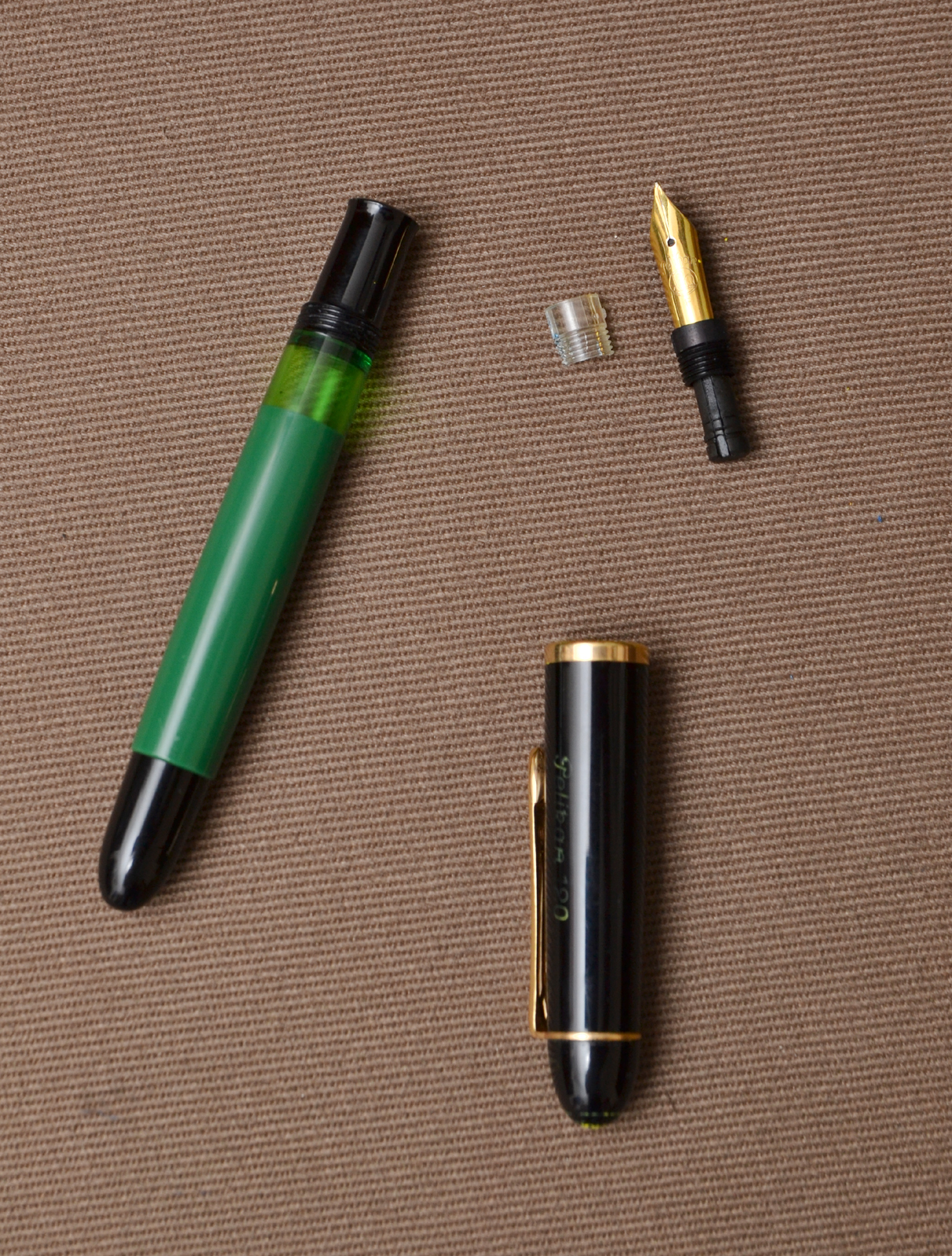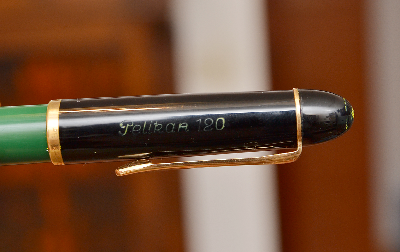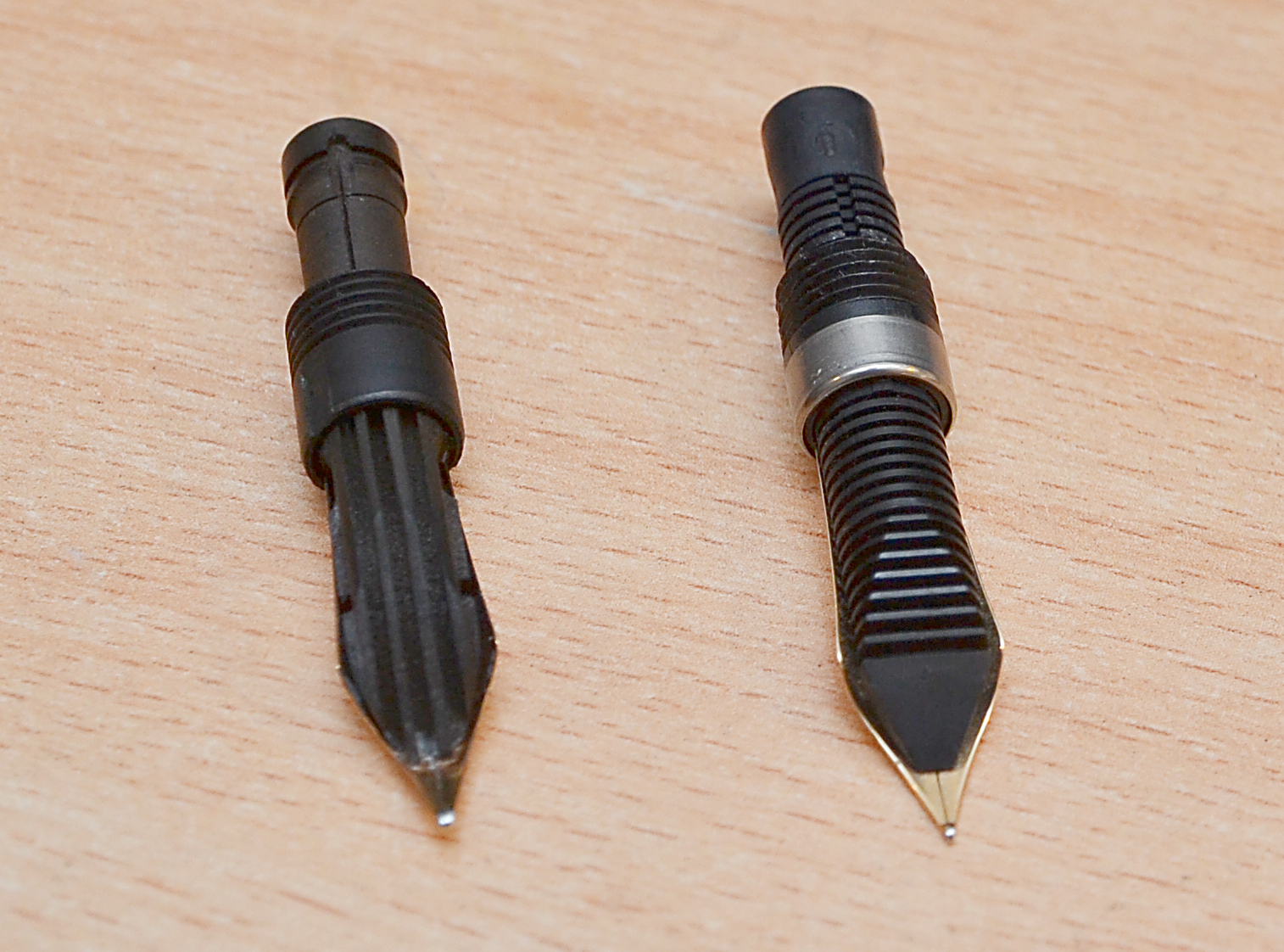La Pelikan 120 e la 140 sembrano identiche tranne che per il pennino, subito salta agli occhi che uno è placcato, l'altro è in oro 585.