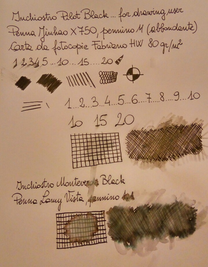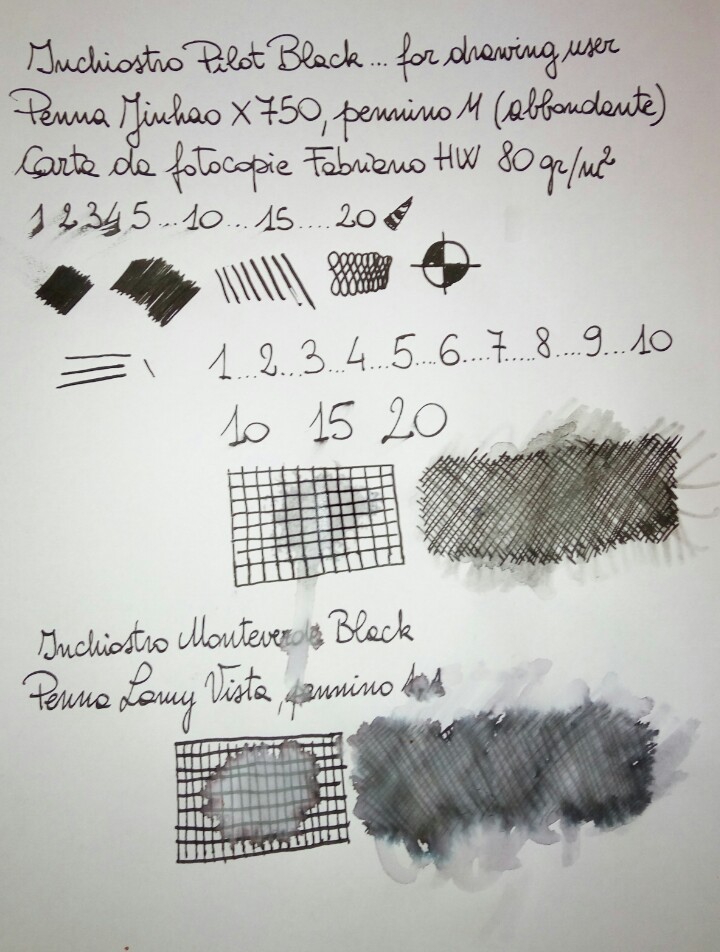 Mi piacciono gli inchiostri neri, ma incuriosito dal Pilot Ink Blue/Black dopo aver visto alcuni video e letto un po' di recensioni di internet decido di sfruttare una promozione della Baya ed acquistare la bottiglia da 350 ml. Vi risparmio il piccolo disguido per poter recuperare il pacco ordinario in cui è arrivato l'inchiostro che mi è costato un viaggio ad un ufficio postale leggermente fuori mano e con l'amara sorpresa di aver ricevuto invece del Blue/Black un Black FOR DRAWING USER. Cerco informazioni su internet e pare che sia altamente sconsigliato l'uso nelle stilografiche. Non ho neanche voluto contattare il venditore, l'imballo con cui è arrivato era letteralmente distrutto (ecco perchè sono dovuto andare all'ufficio postale)tenuto insieme da quasi un rotolo di nastro da pacchi e da degli elastici. Avrei dovuto fare un imballo nuovo, spedire l'oggetto, farmi mandare l'oggetto corretto sempre che ne avesse ancora a disposizione. Io alla fine l'ho pagato 9.65€ ed il venditore ha perso circa 6€ in quanto questo inchiostro era più caro del Blue/Black. Sfido la sorte e lo provo su una Jinhao da pochi €uro. Non mi dispiace come inchiostro, su questa Jinhao tratto M ho fatto un po' di prove e la penna è partita sempre al primo colpo anche se l'ho lasciata aperta senza cappuccio dopo diversi minuti. Ogni giorno ho usato la penna per vedere se ci fossero problemi, ma per ora nulla. Non mi azzardo a fare una recensione per prima cosa perchè sono un neofita ed ho una esperienza limitata con gli inchiostri e poi perchè essendo sconsigliato l'uso nelle stilografiche, anche se per ora non ho riscontrato problemi, non mi fiderei ad usarlo con penne che costino più di 10€. Credo che lo userò con le Pilot Parallel Pen, quando mi deciderò ad ordinarle.