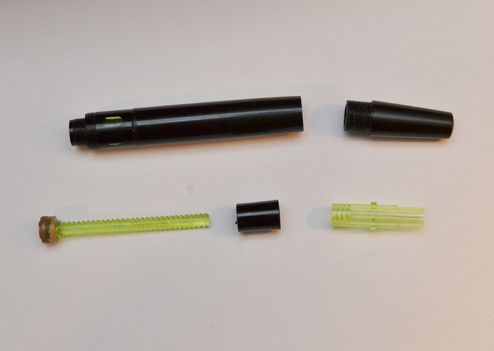 Per smontare il pistone una volta smontata la sezione si ruota il fondello fino allo sgancio, continuando si sviterà totalmente il fondello ed uscirà la parte dove si avvita la vite senza fine del pistoncino e un cilindretto che funge da blocco interno al fusto e fa anche da da guida per la vite del pistoncino.