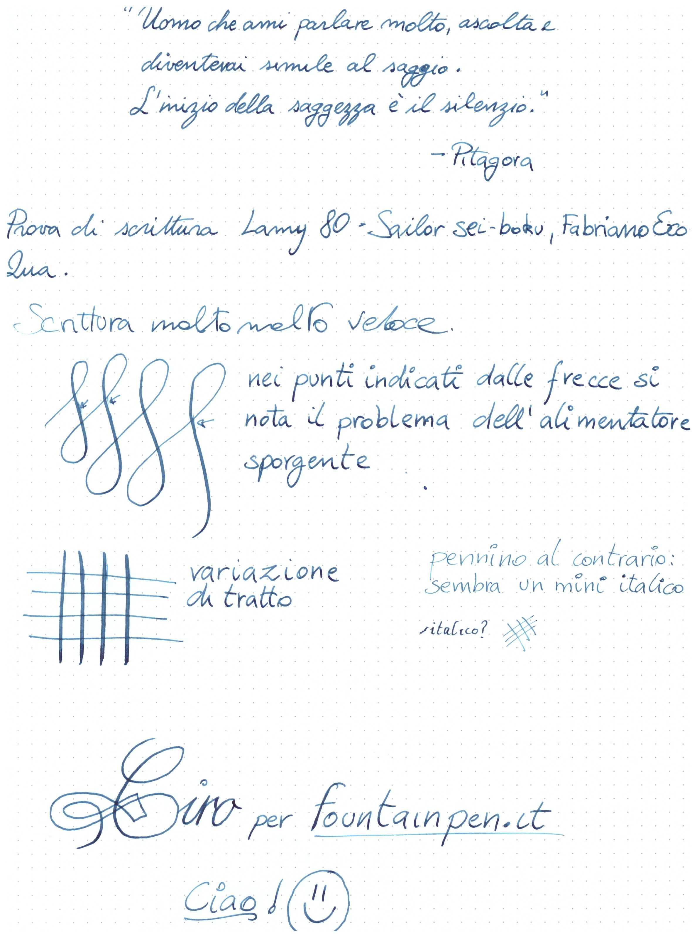 l'oro 14K del pennino gode anche di una certa capacità di molleggiare, il problema è però che flettendo l'ingombro sotto il pennino, e in particolare l'unico pezzetto di alimentatore visibile, toccano il foglio macchiandolo.