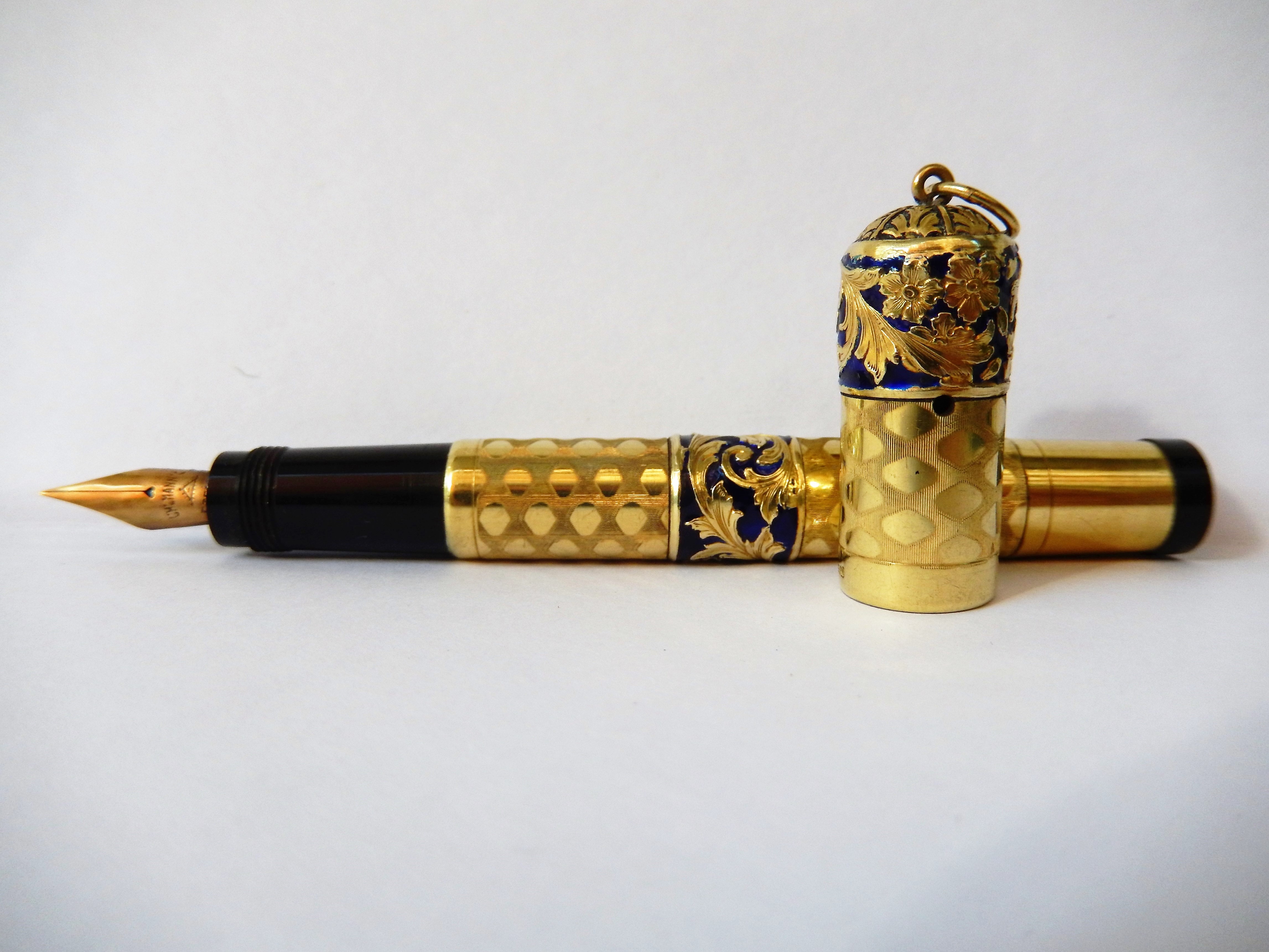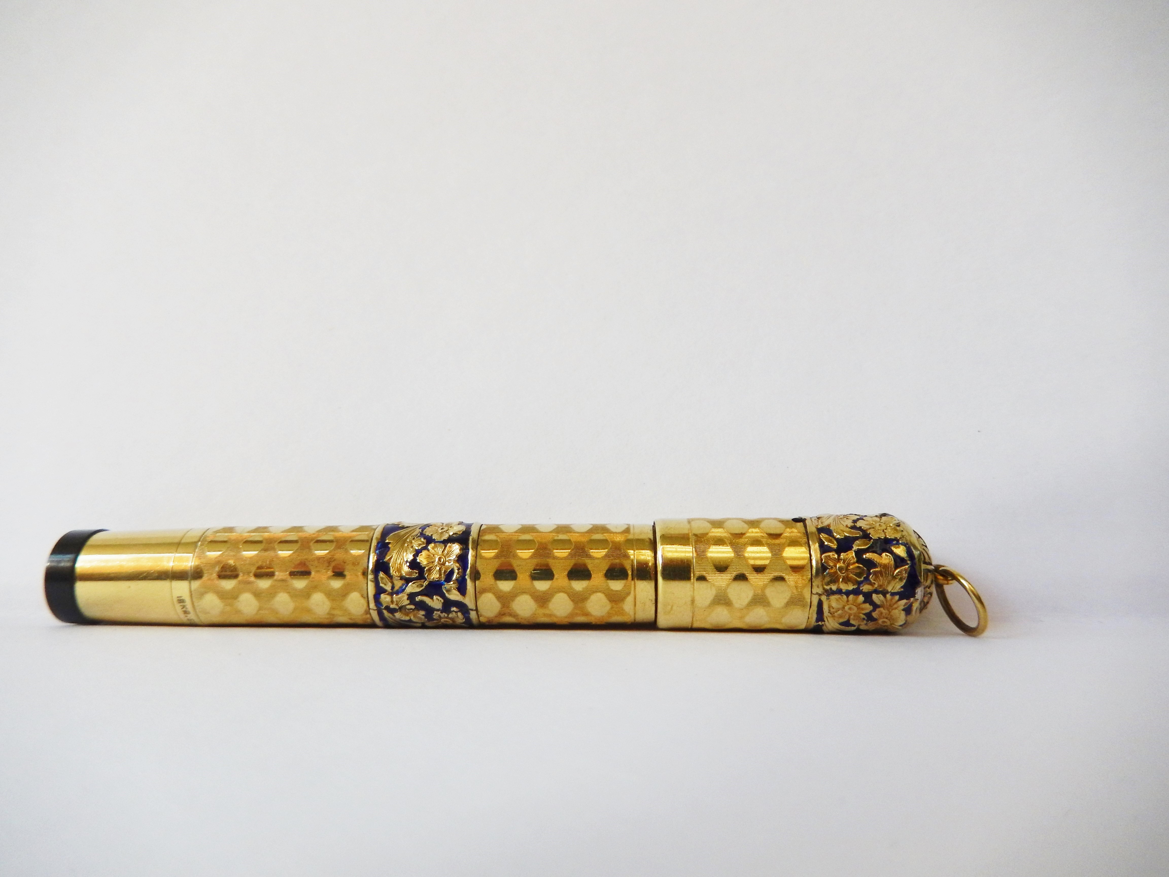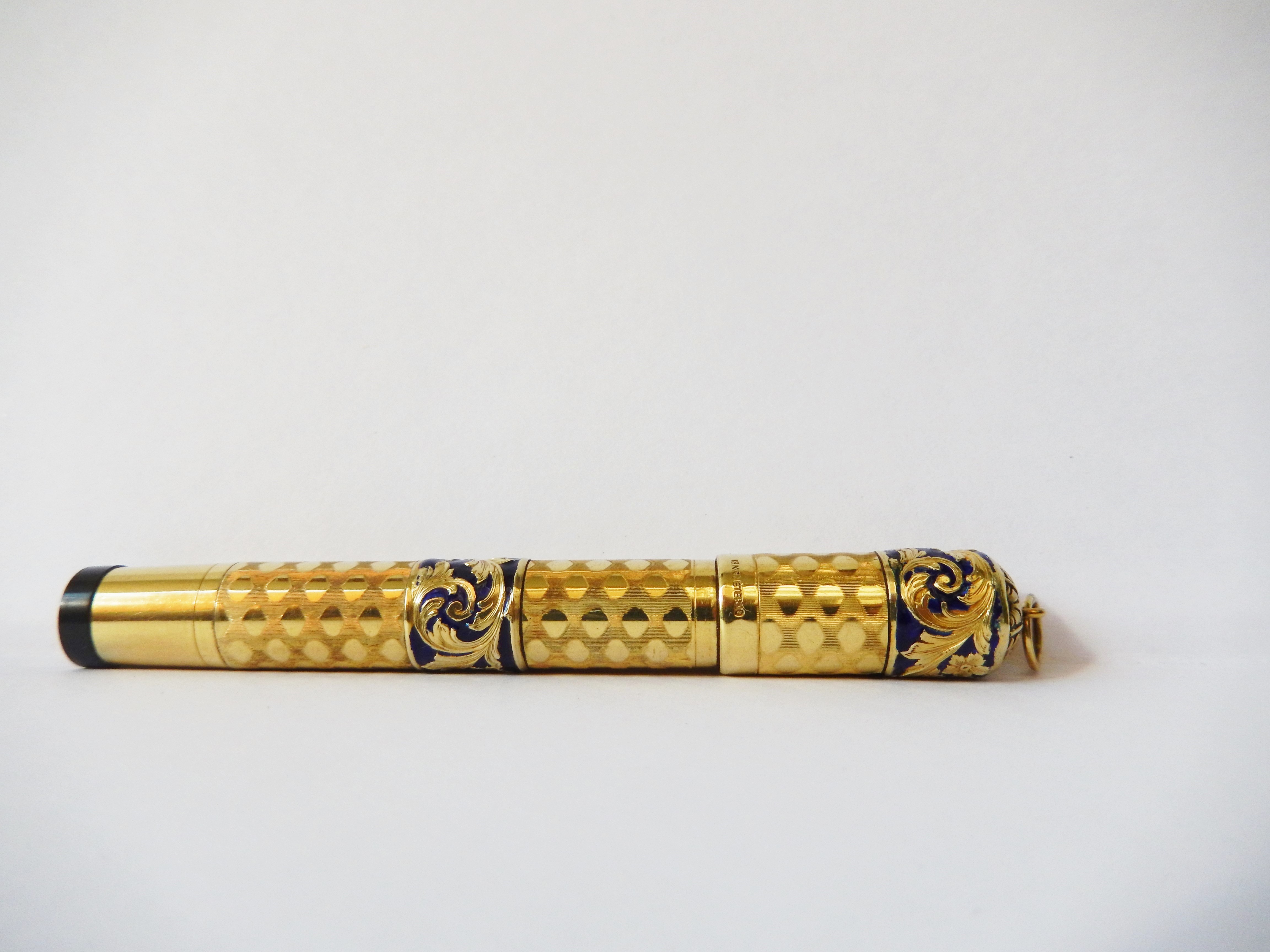 romboidali che giungono fino ad un centimetro circa dal fondello in ebanite ; sul corpo e sulla parte alta del cappuccio due fasce di smalto blu esaltano un girotondo di decorazioni floreali e foglie di acanto.