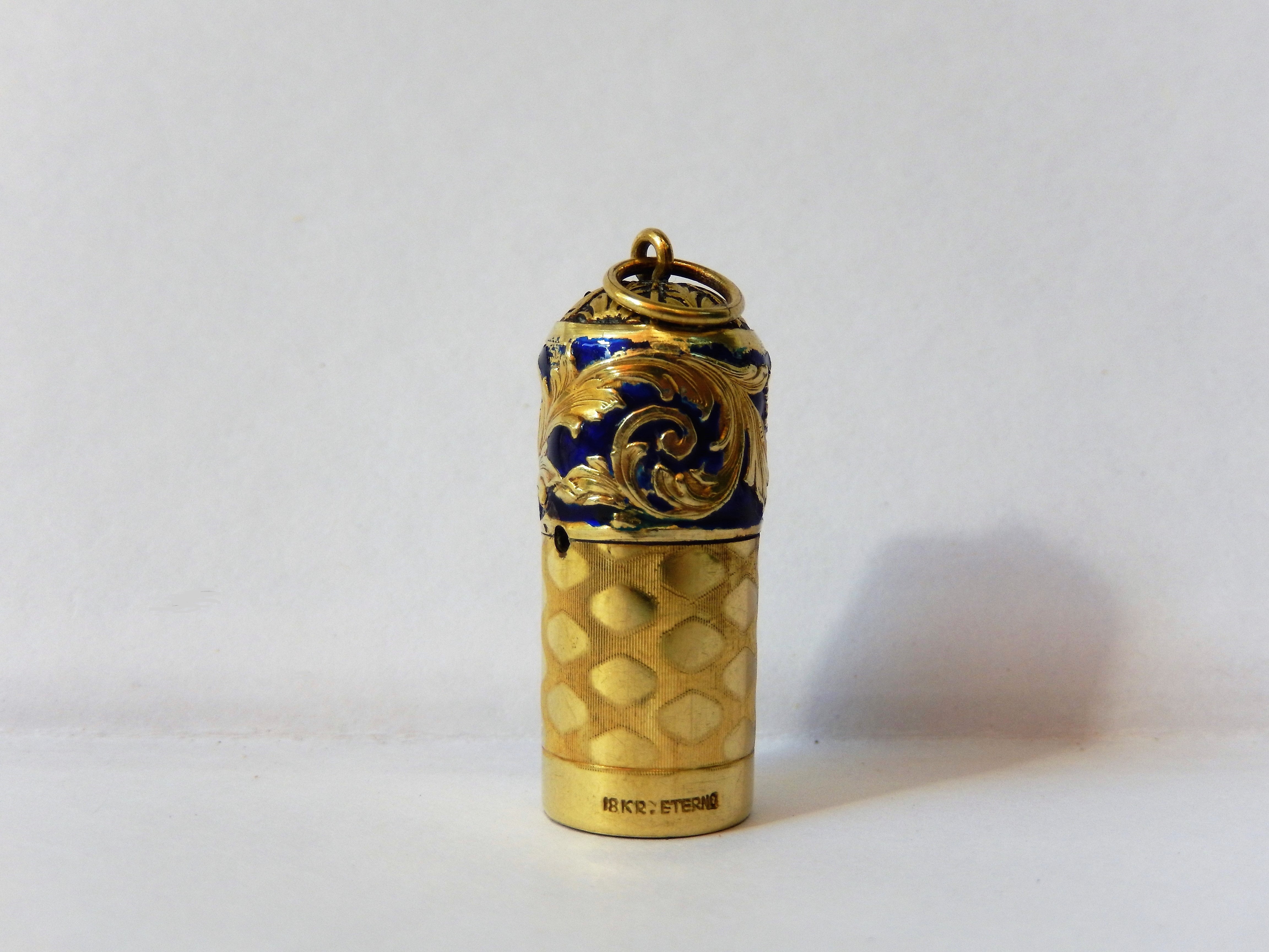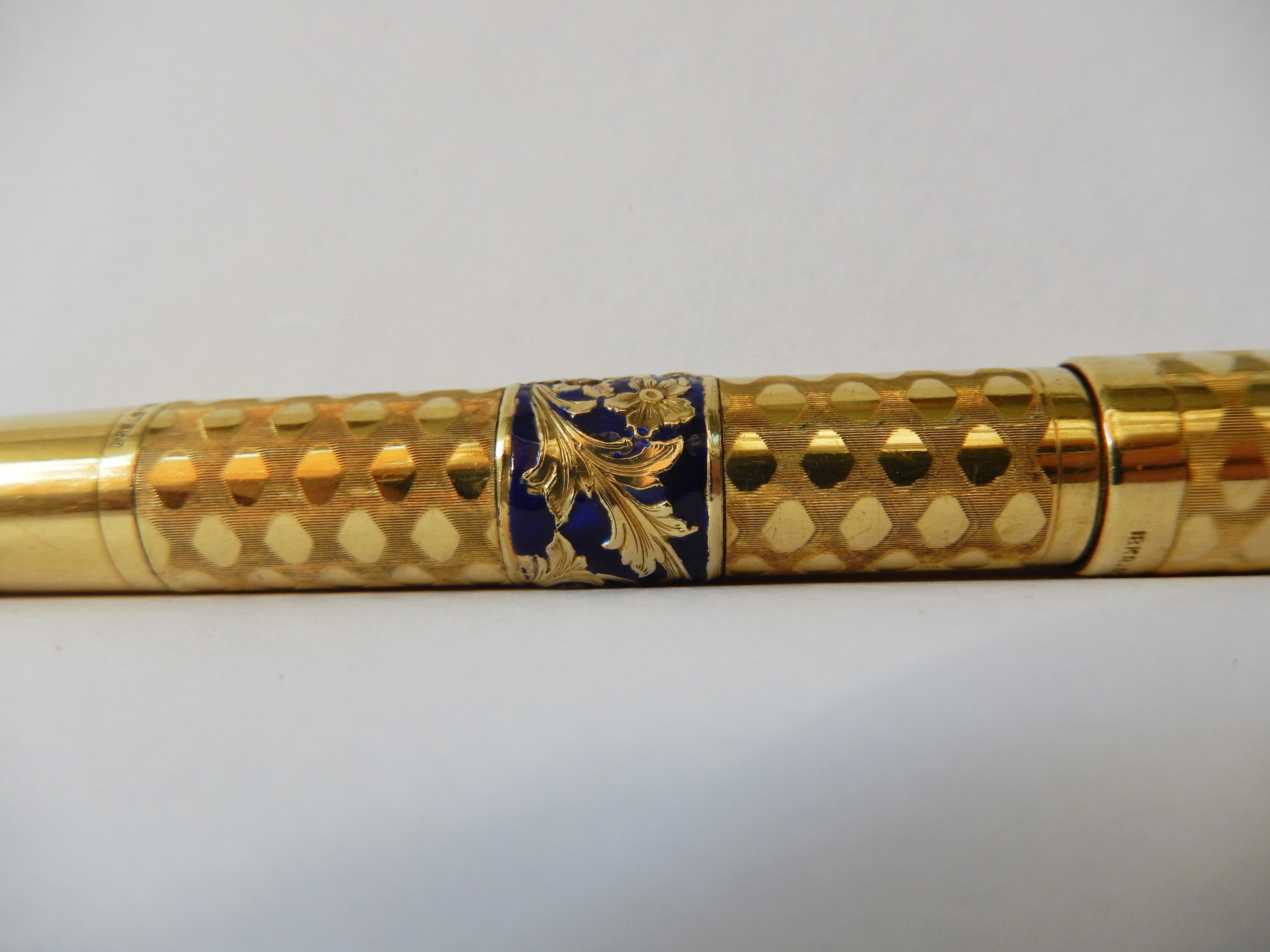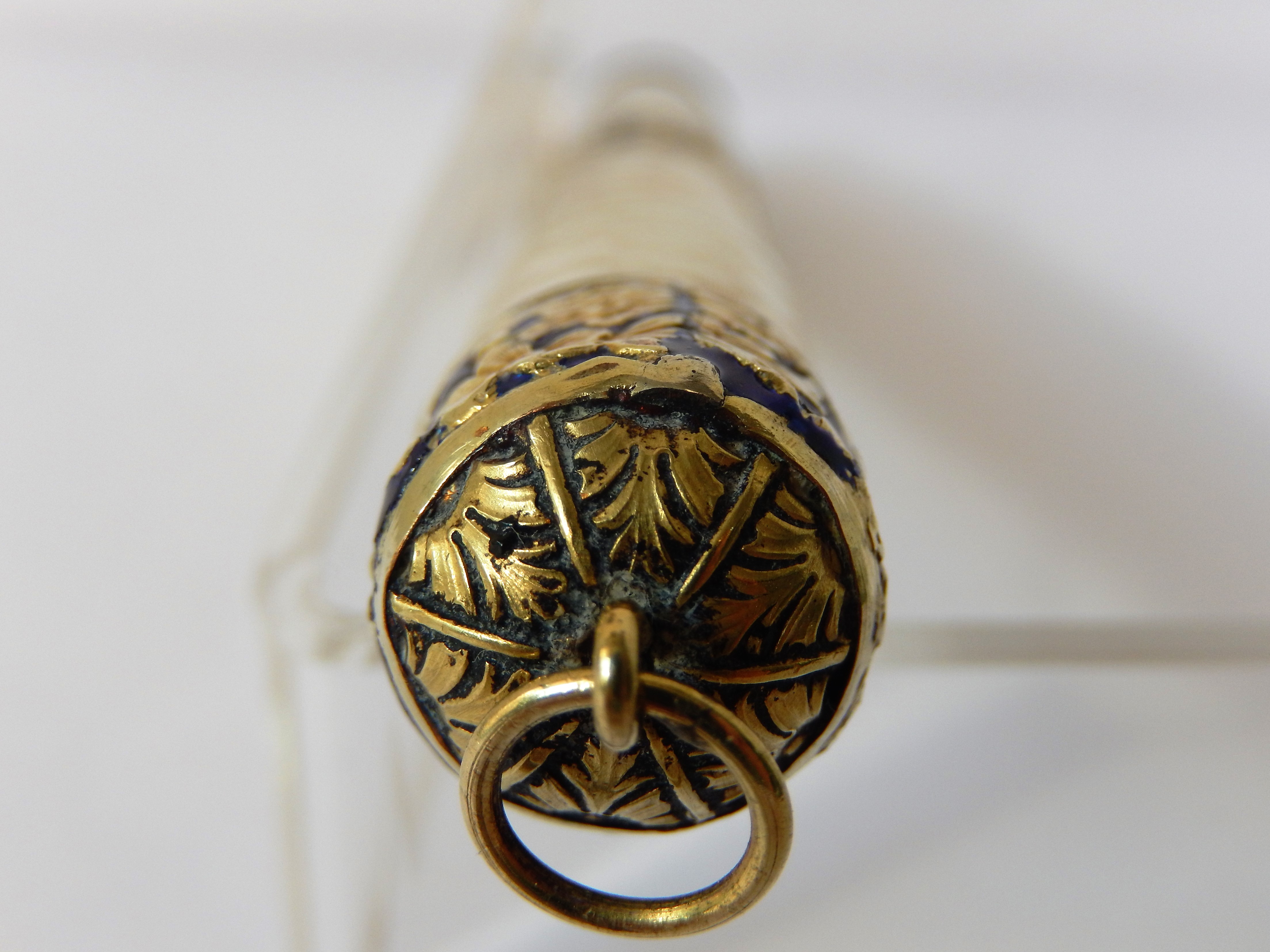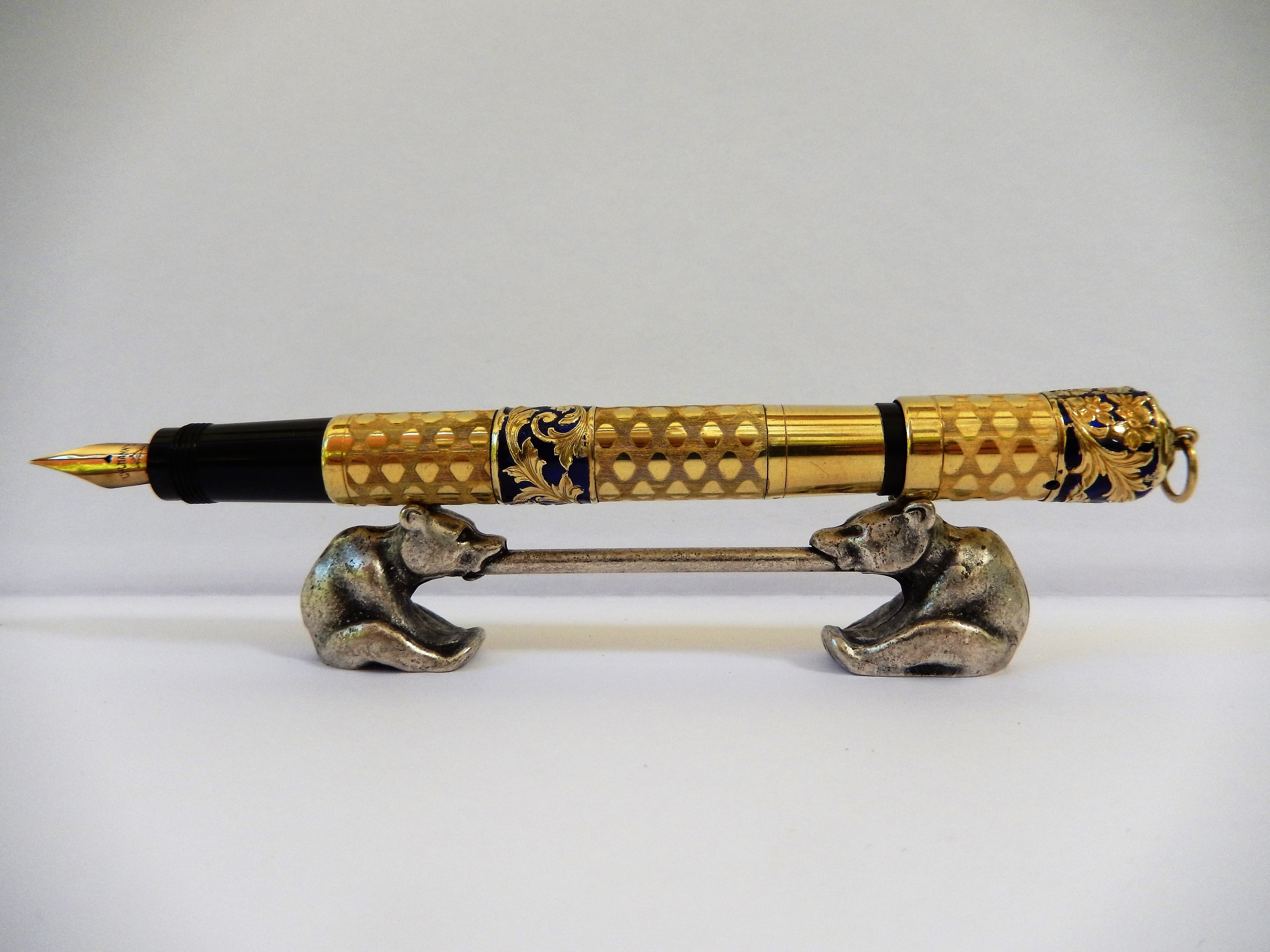 romboidali che giungono fino ad un centimetro circa dal fondello in ebanite ; sul corpo e sulla parte alta del cappuccio due fasce di smalto blu esaltano un girotondo di decorazioni floreali e foglie di acanto.