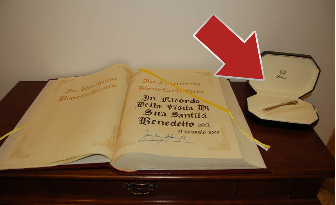 La penna è contenuta in una scatola in similpelle che ha la forma inusuale di una borsetta. A corredo una cartuccia di inchiostro blu, standard internazionale e un portapenne.