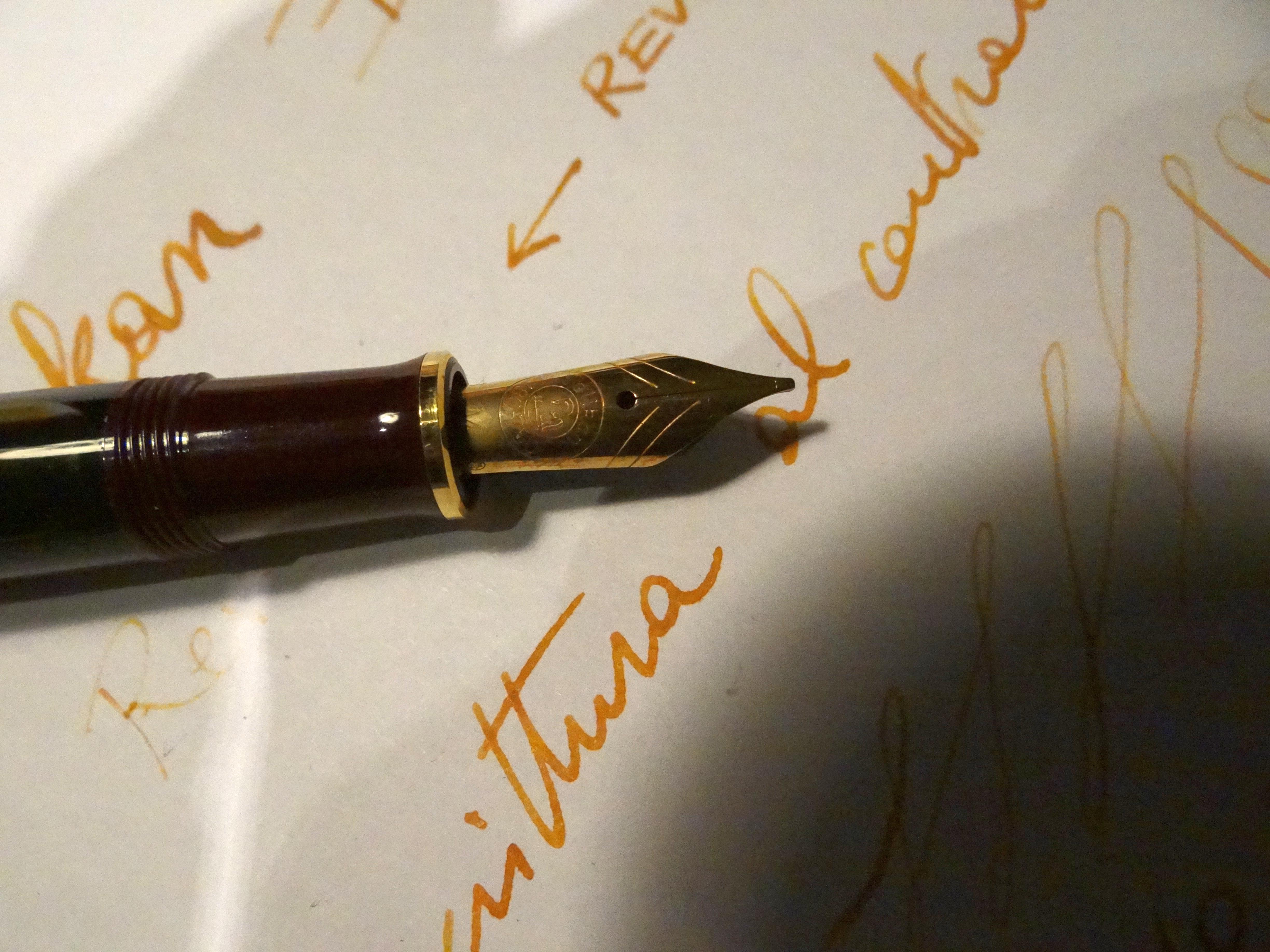 La peculiarità di questo pennino, che mi risulta prodotto per il mercato italiano, dato che la M600 montava normalmente un pennino a 14 carati, è quella di essere flessibile. Potete notare le variazioni di tratto nella prova di scrittura. Si passa da un medio a un BB e oltre. La sensazione che offre è molto particolare. Intanto è un medio mentre di solito si tratta di pennini fini flessibili e poi ha una risposta tutta sua, comunque gradevolissima.