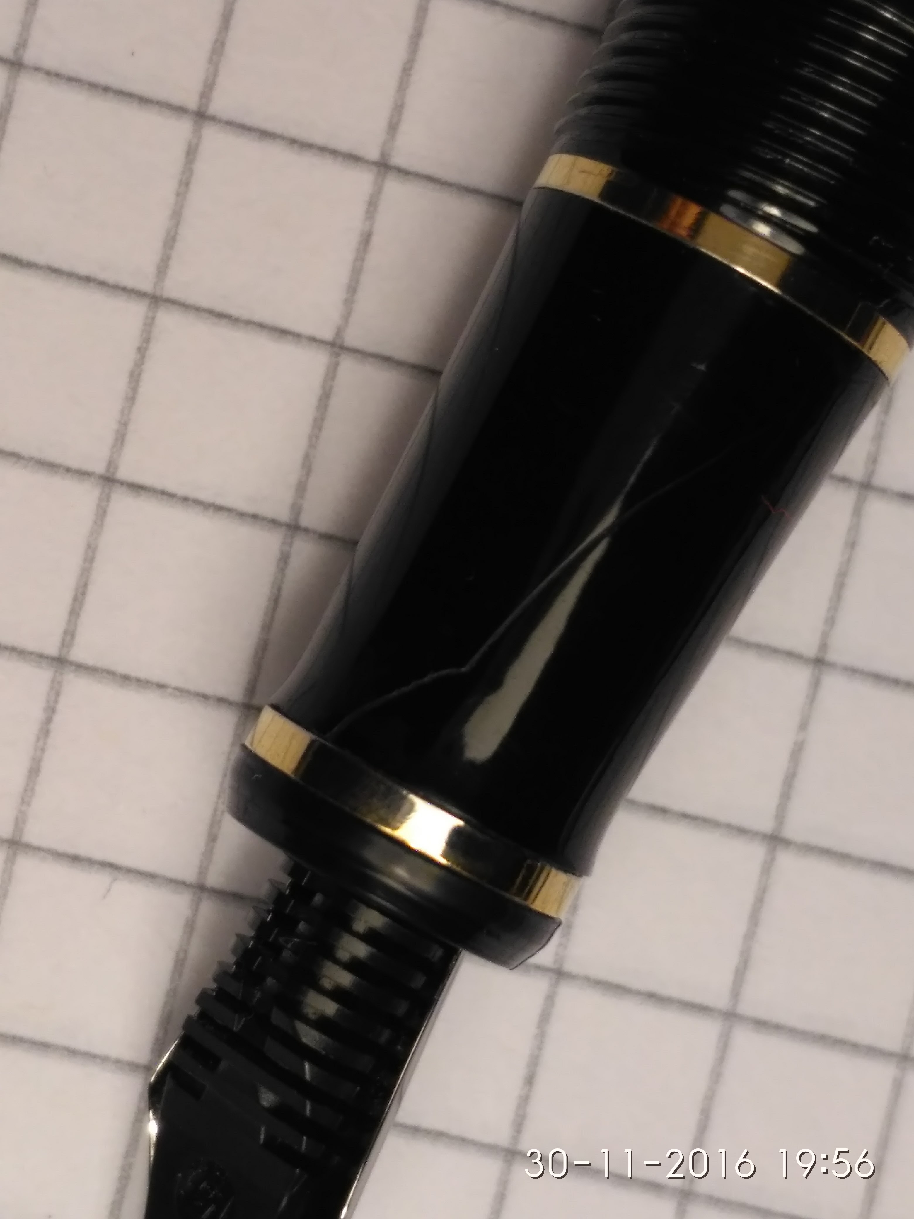 La fessura era longitudinale sulla sezione, appena avvertibile. Ho per prima cosa svitato il pennino, poi ho fatto una prima applicazione creando anche un po' di depressione nel corpo penna sperando di favorire la penetrazione della colla. Poi ho proceduto con successive applicazioni e levigature, il risultato per ora è buono, l'inchiostro non trafila più e la riparazione è quasi invisibile.