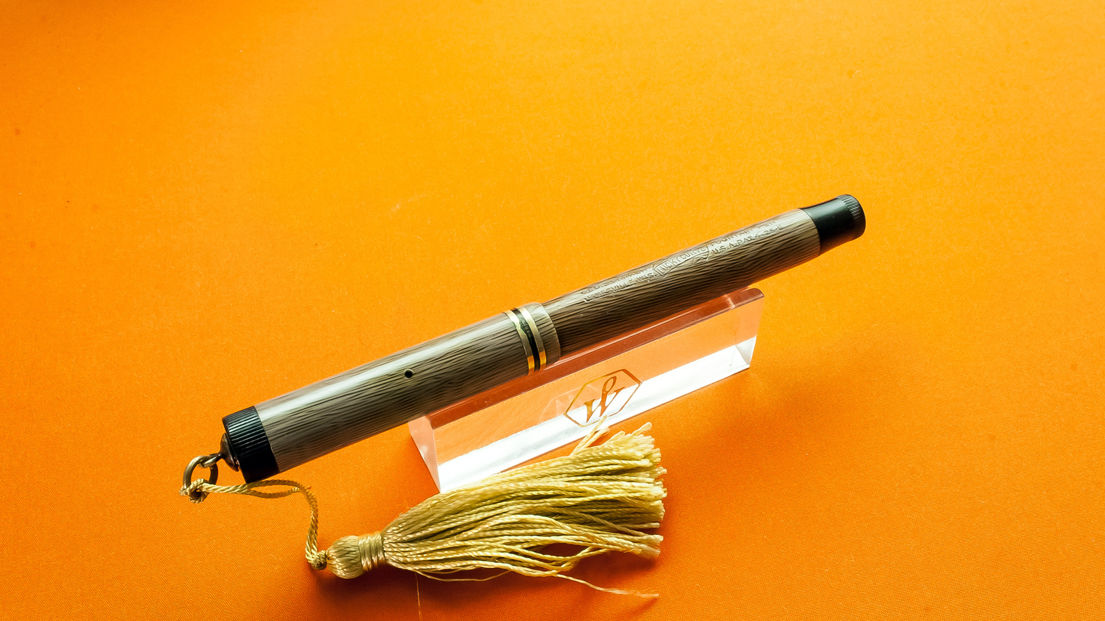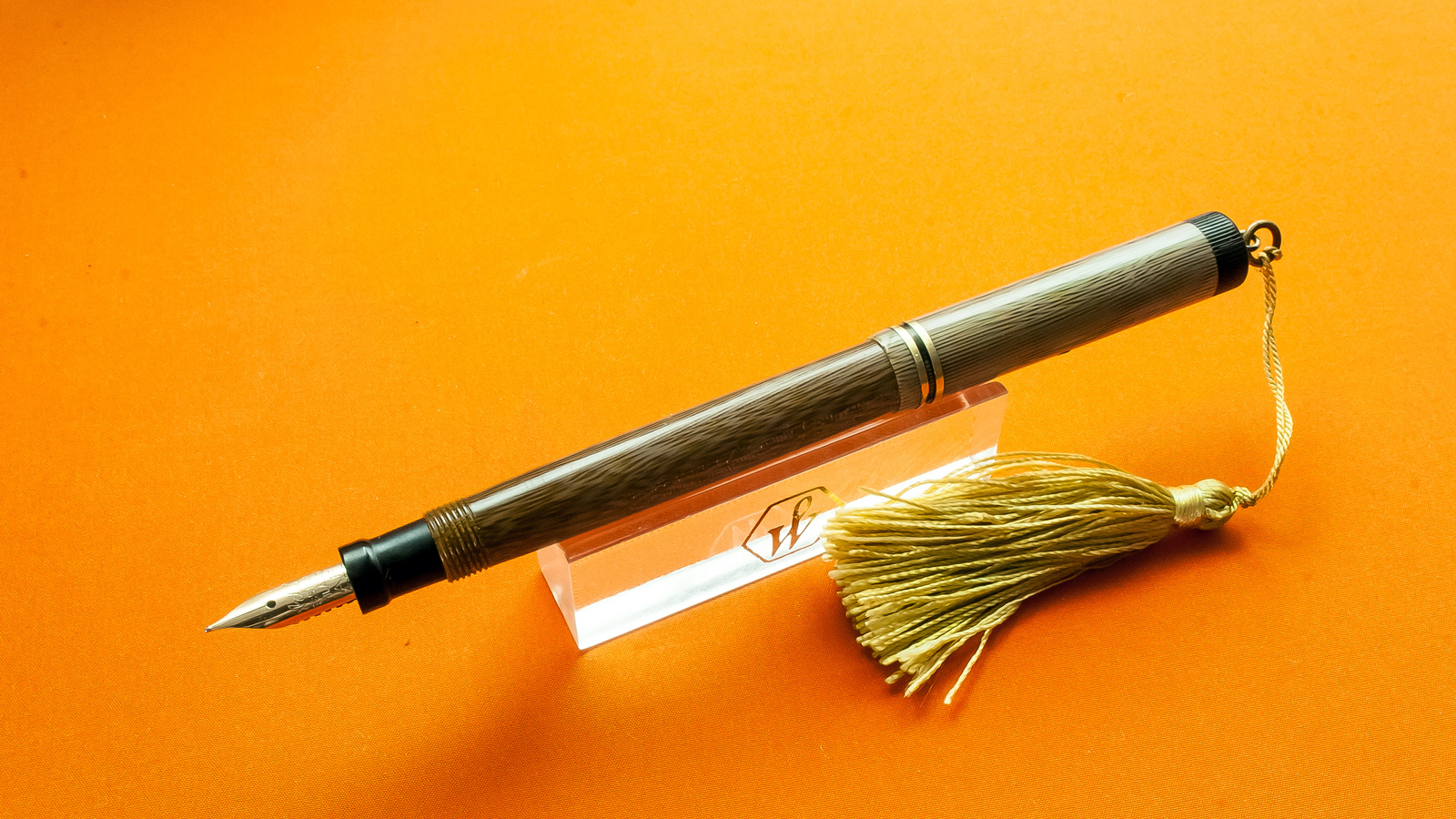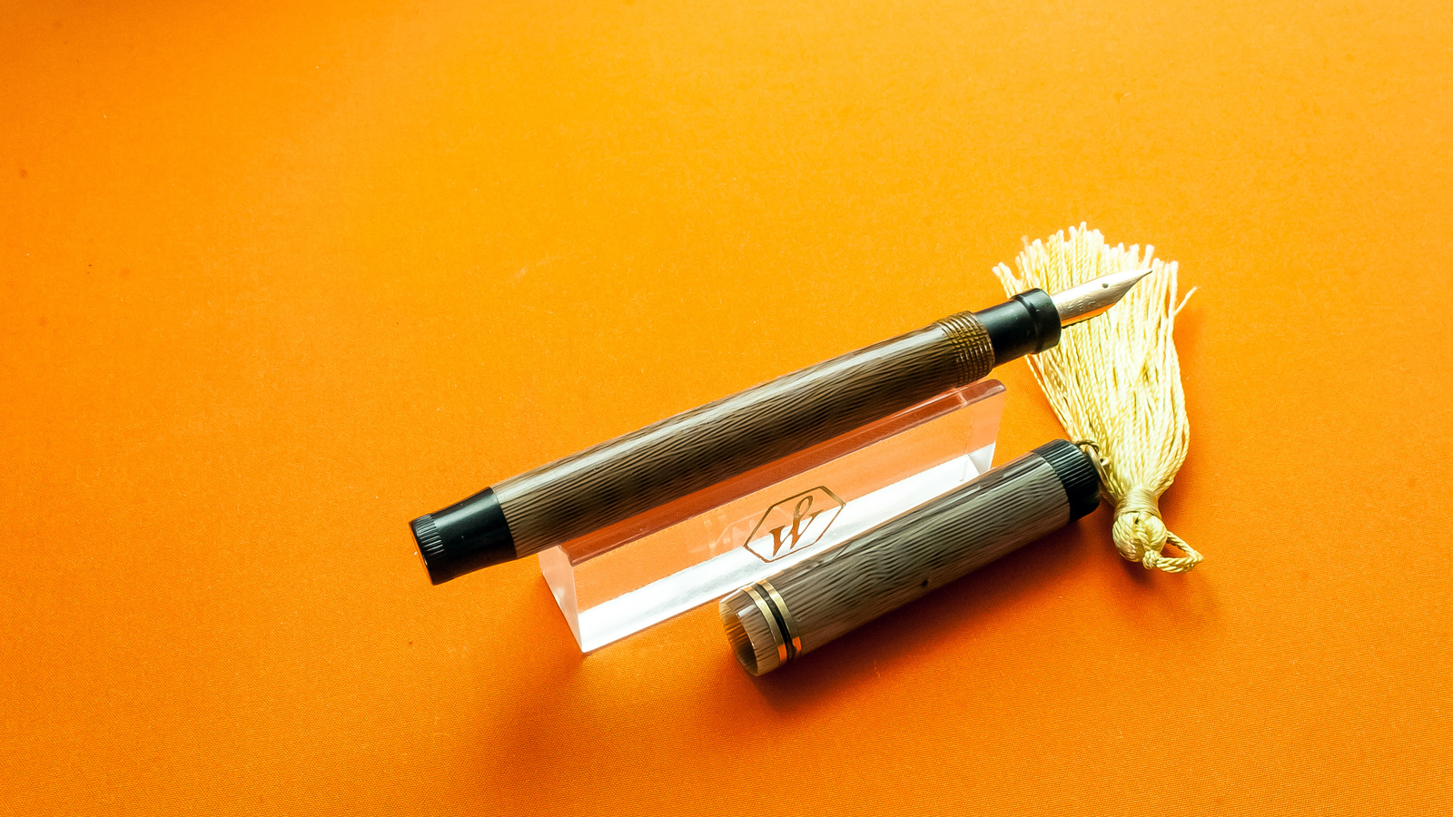 A mio parere l'aspetto più interessante: la trama moire, ispirata ai tessuti in voga tra le signore, dona a questa piccola penna una notevole eleganza. Il colore dovrebbe essere il Beige Gray. Non posso affermarlo con certezza perché la celluloide di cui è composta era fortemente soggetta al viraggio del colore.