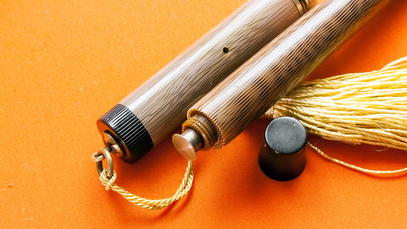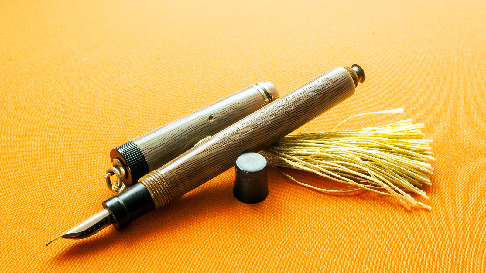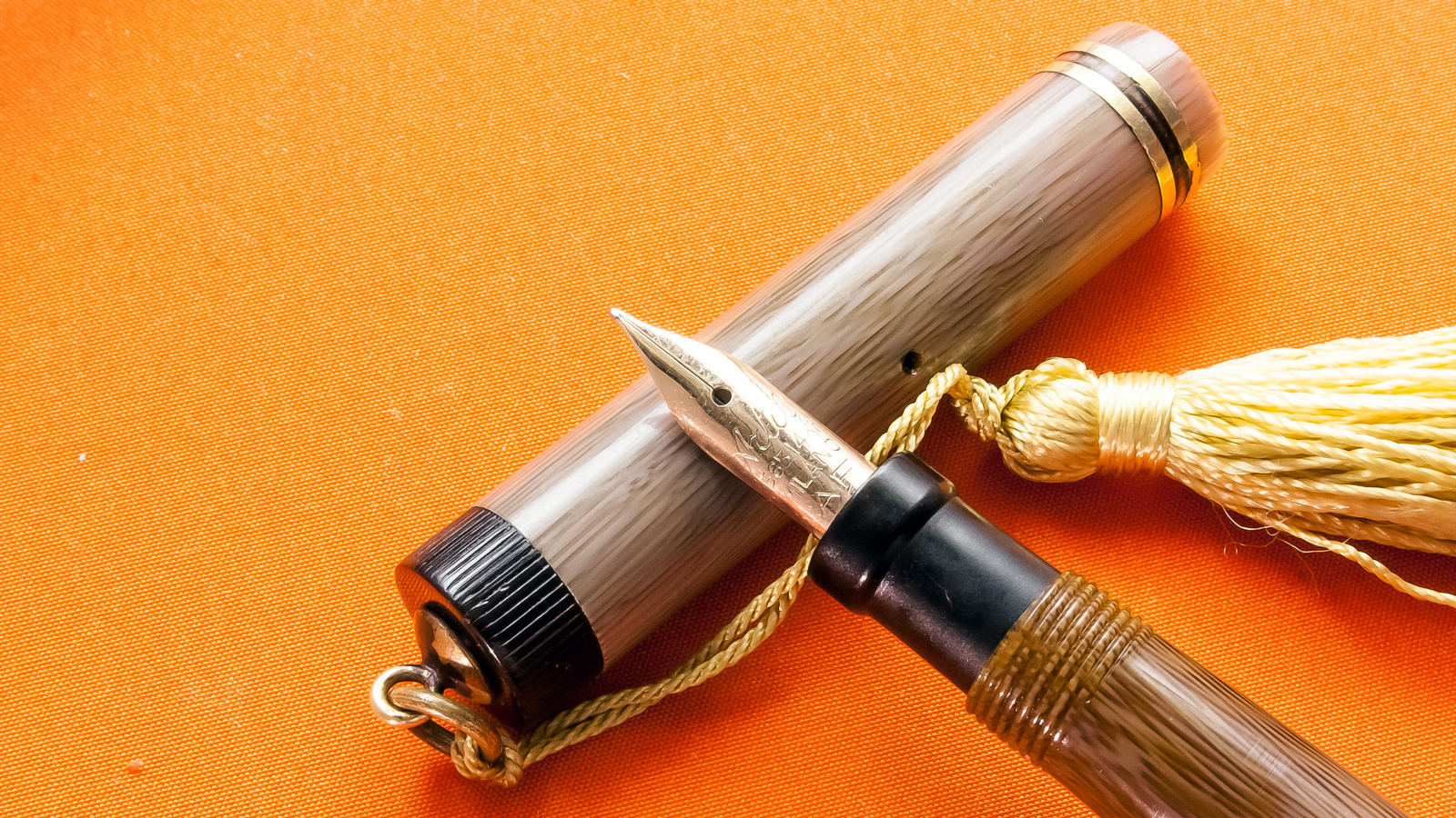 A mio parere l'aspetto più interessante: la trama moire, ispirata ai tessuti in voga tra le signore, dona a questa piccola penna una notevole eleganza. Il colore dovrebbe essere il Beige Gray. Non posso affermarlo con certezza perché la celluloide di cui è composta era fortemente soggetta al viraggio del colore.